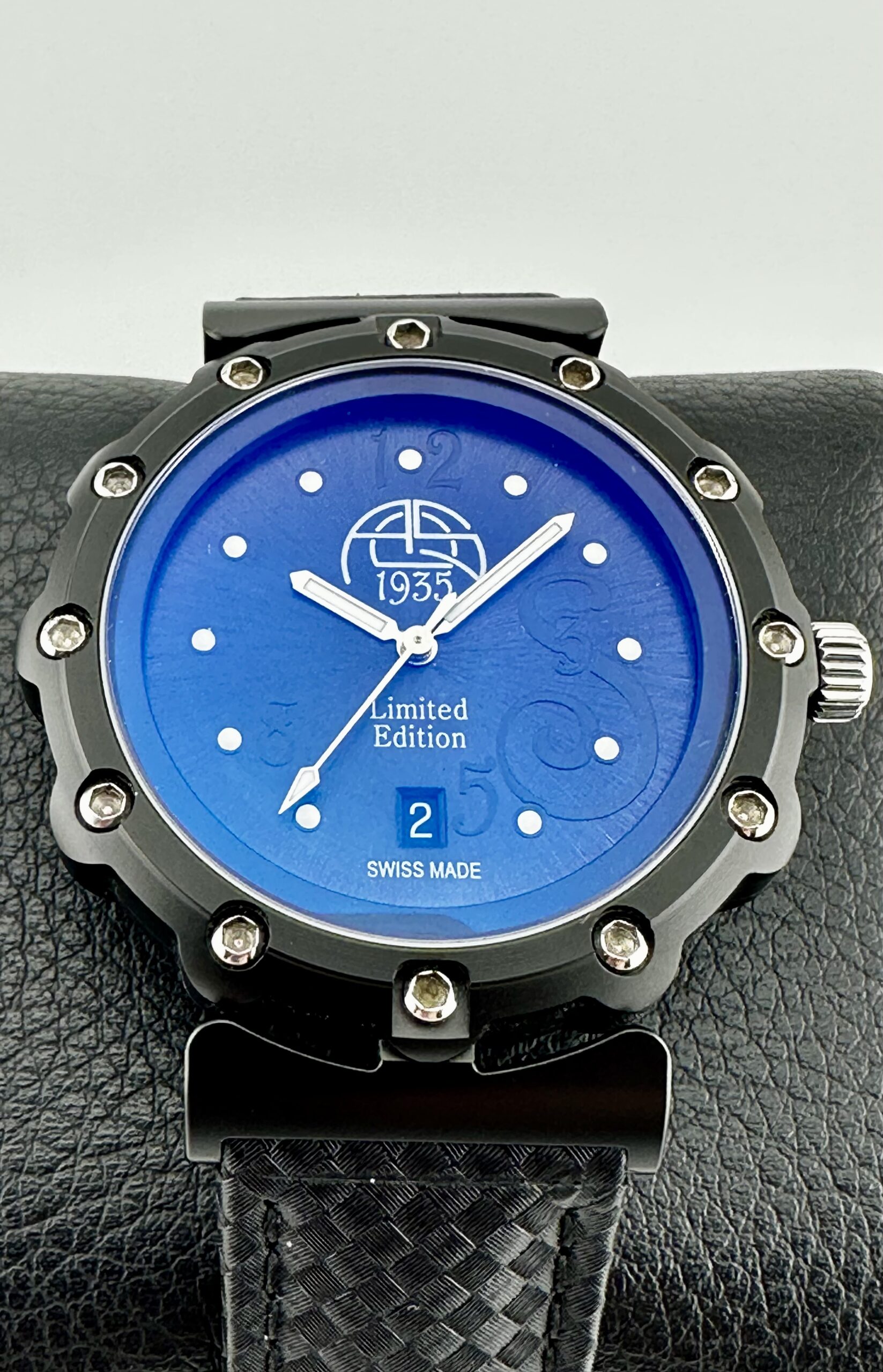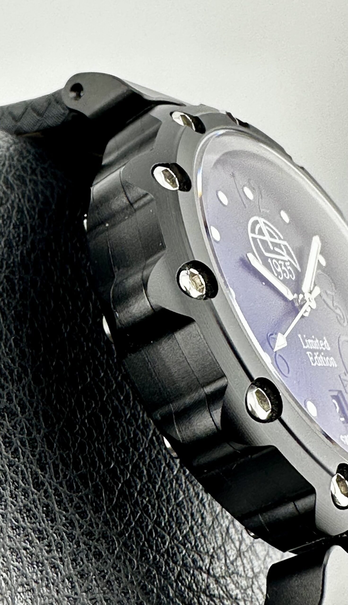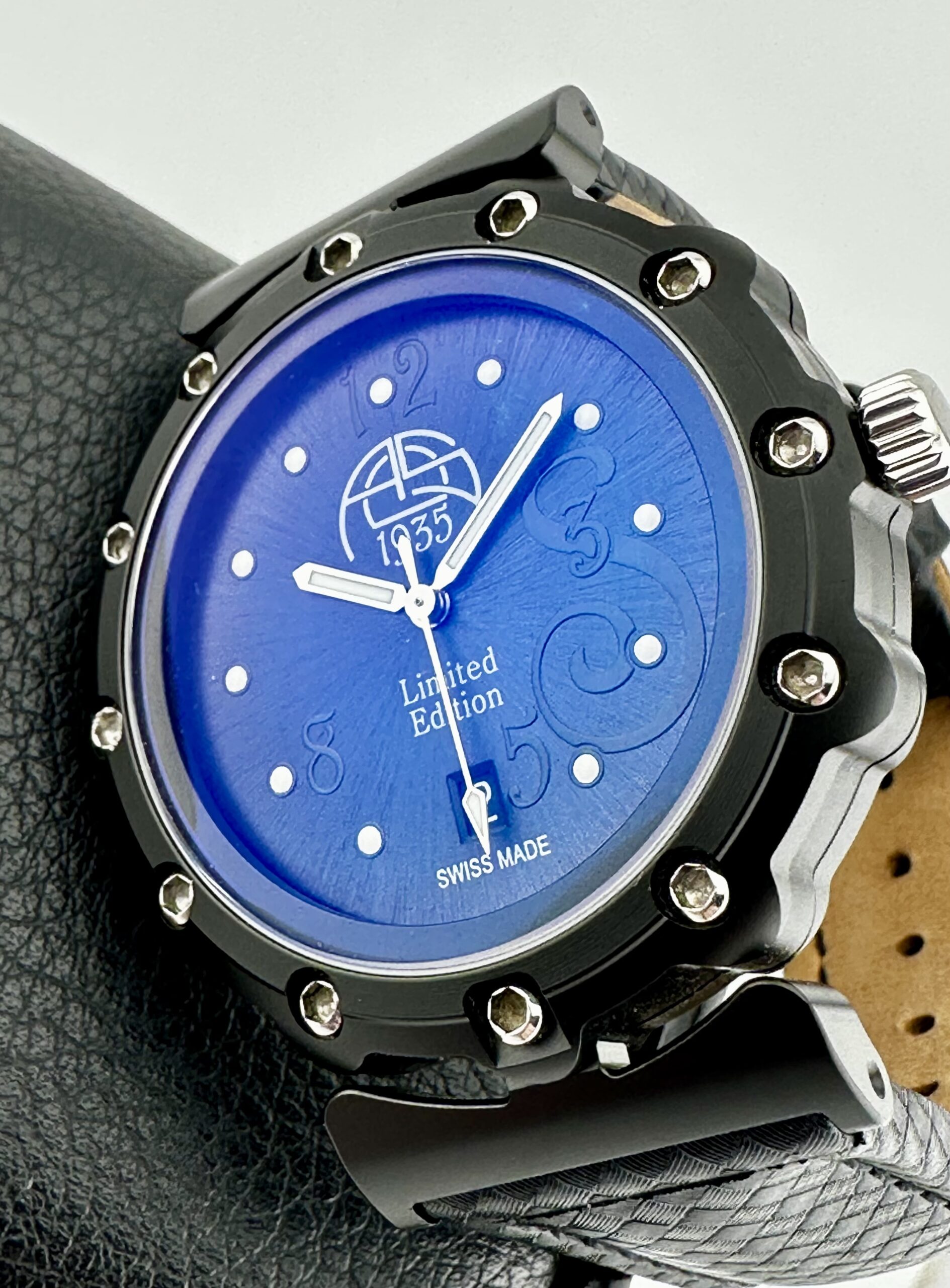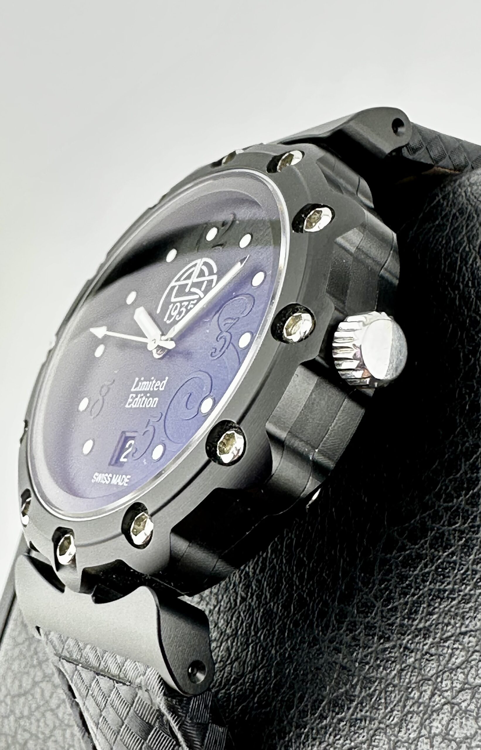 Wow what a super cool watch! Extremely well made Swiss Arthur Oskar Stampfli (AOS) All Black 1935 Limited Edition Automatic. Exceptional quality & impeccable Swiss ETA 2892-2 movement, this 47mm piece is made from Steel, Aluminum, & Titanium! The Black Starburst Guilloche Dial is incredible – Awesome details and honestly looks like a watch a Pirate might wear :)!