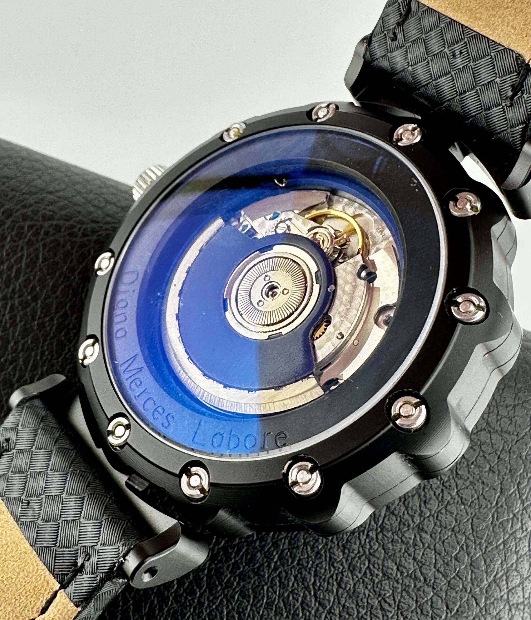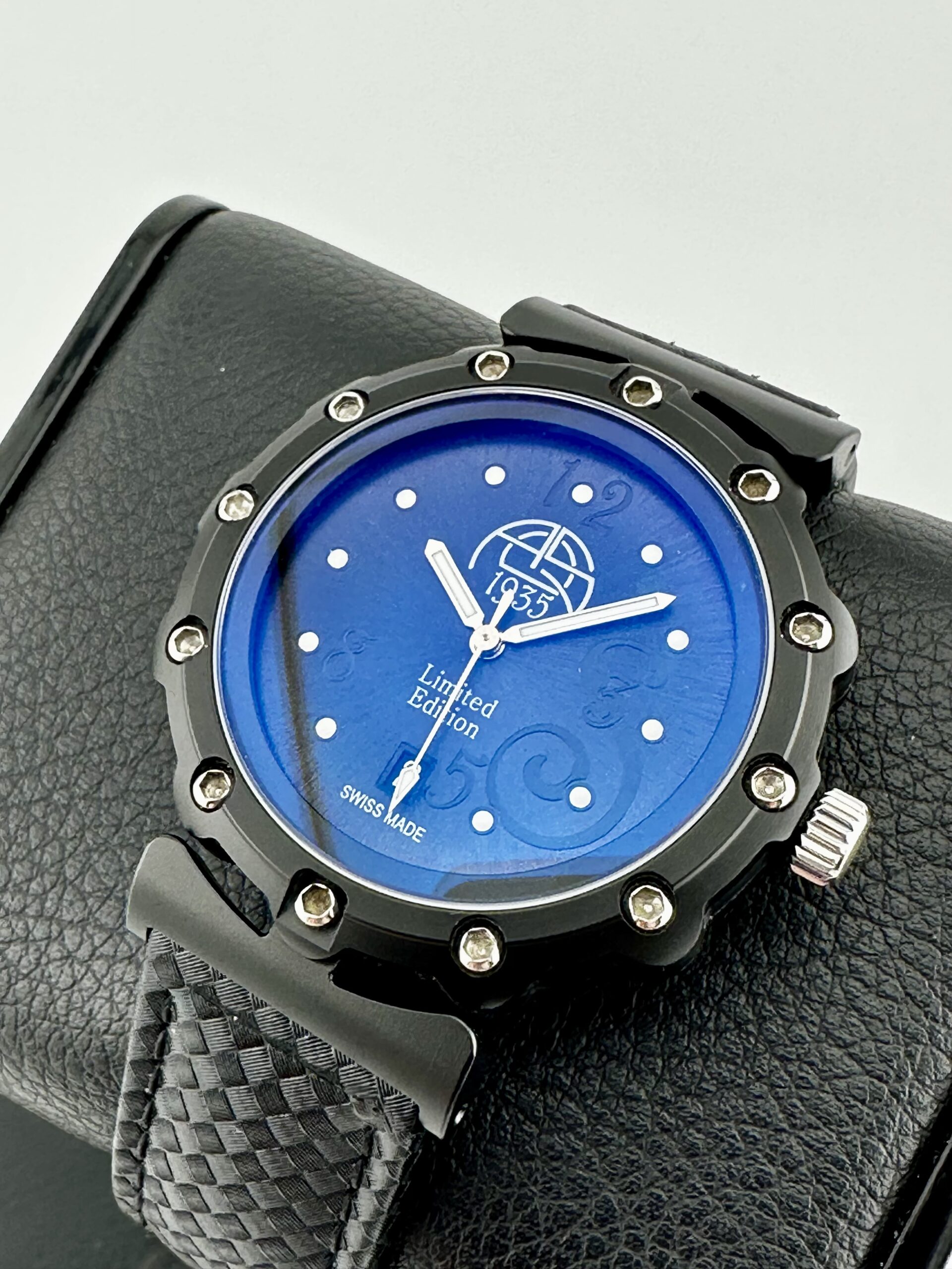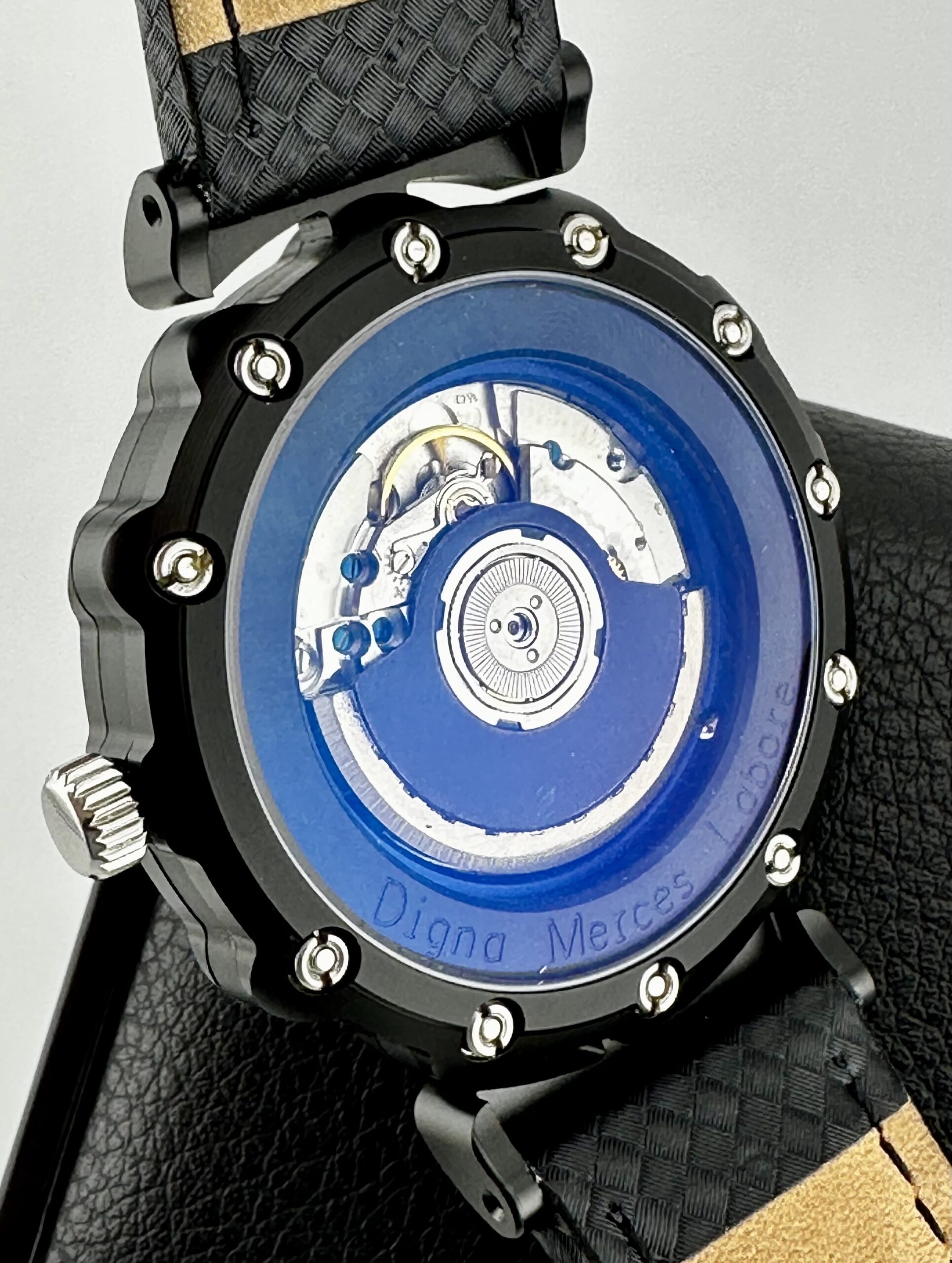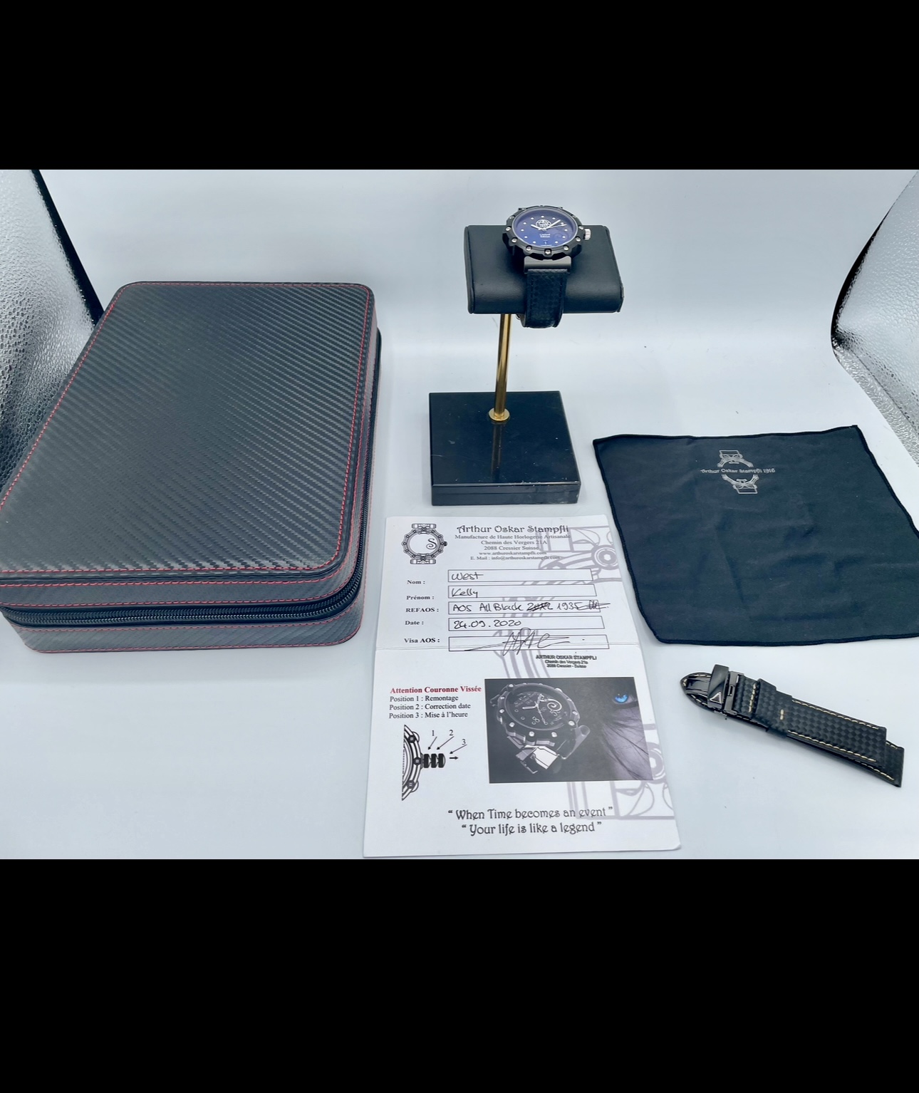 Wow what a super cool watch! Extremely well made Swiss Arthur Oskar Stampfli (AOS) All Black 1935 Limited Edition Automatic. Exceptional quality & impeccable Swiss ETA 2892-2 movement, this 47mm piece is made from Steel, Aluminum, & Titanium! The Black Starburst Guilloche Dial is incredible – Awesome details and honestly looks like a watch a Pirate might wear :)!