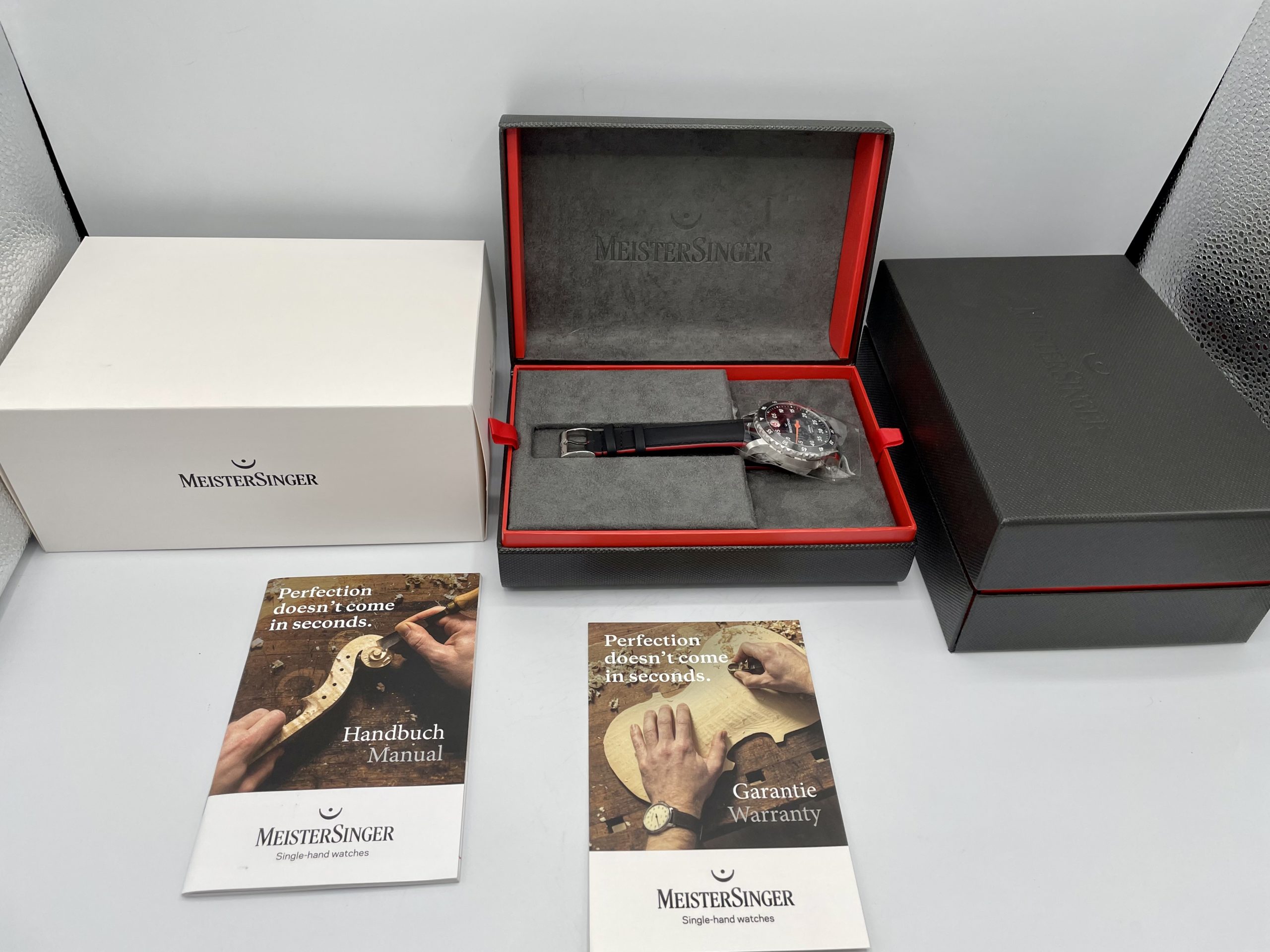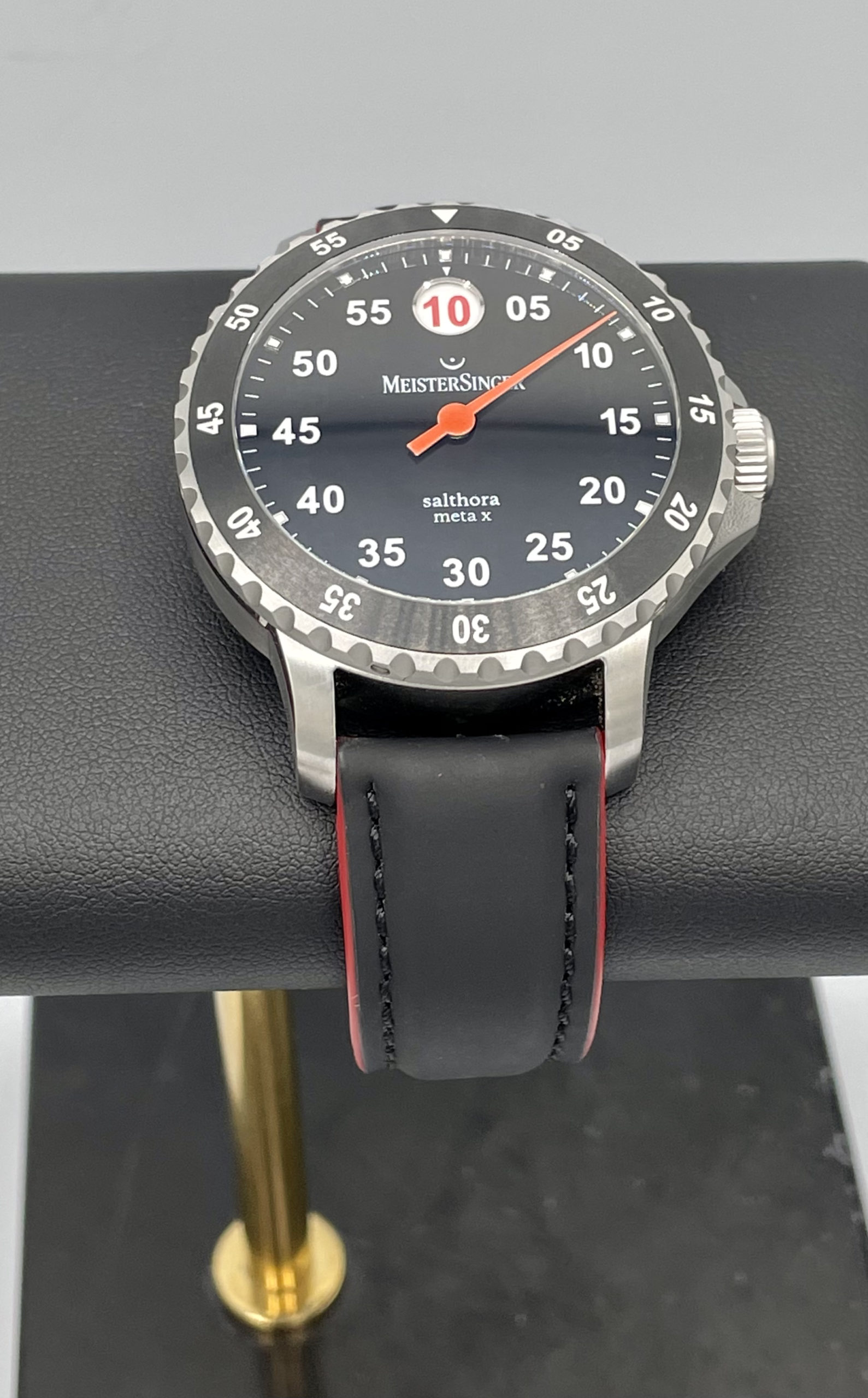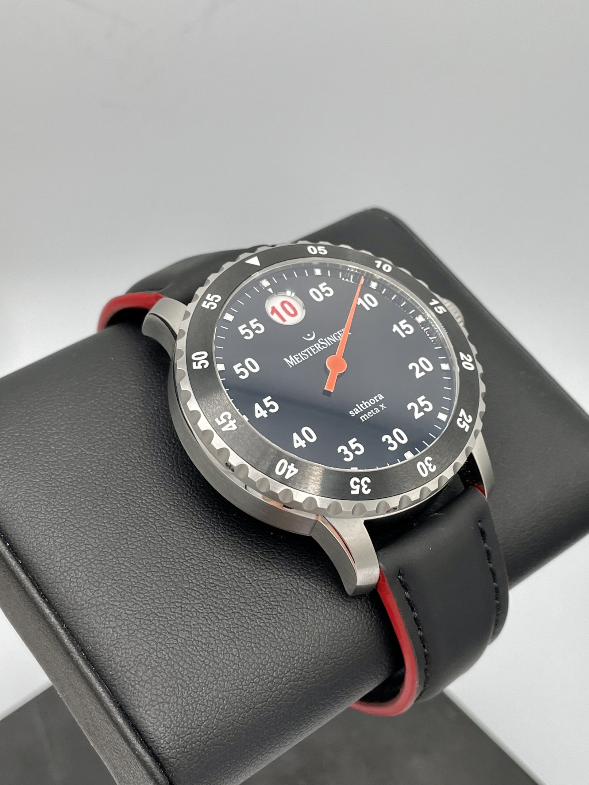 STRAP/BRACELET: – Brand new Meistersinger black Leather strap with raised red stitching and Meistersinger steel buckle.