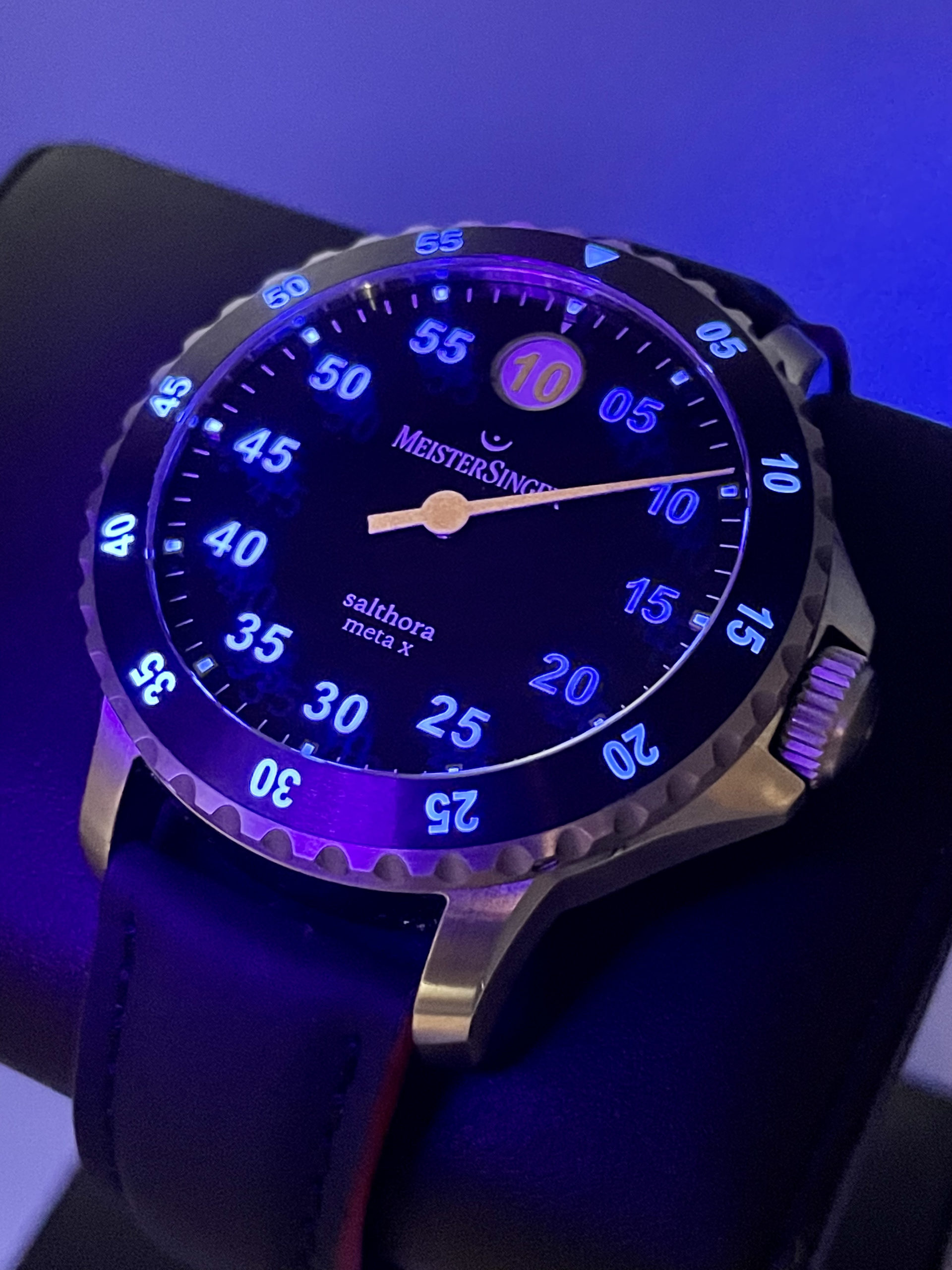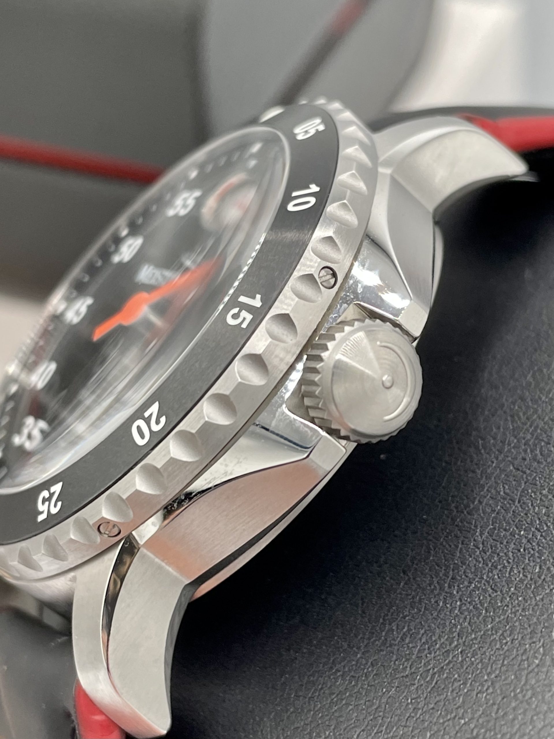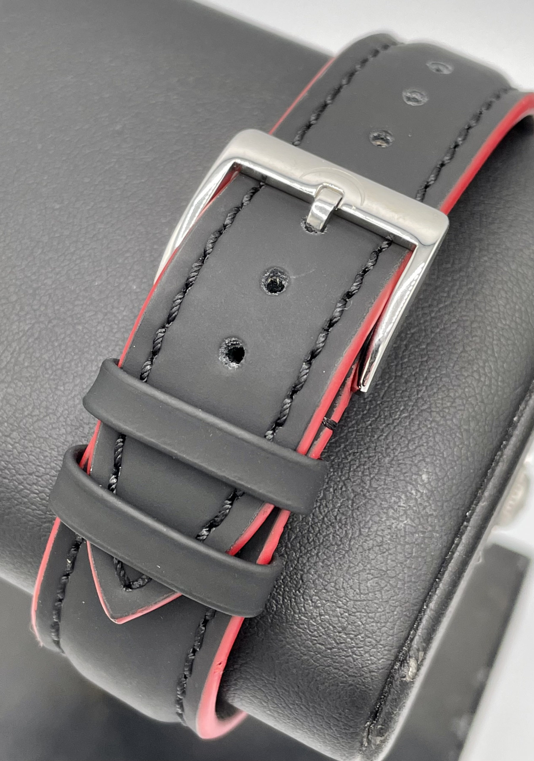 STRAP/BRACELET: – Brand new Meistersinger black Leather strap with raised red stitching and Meistersinger steel buckle.