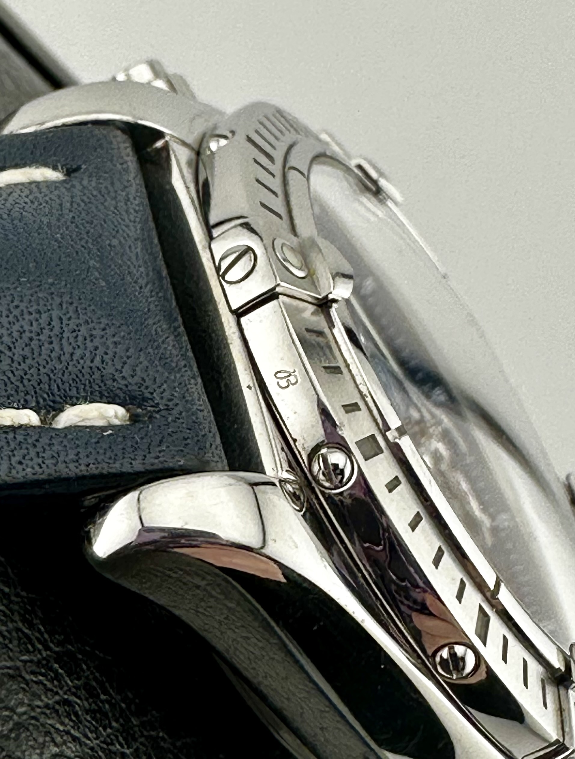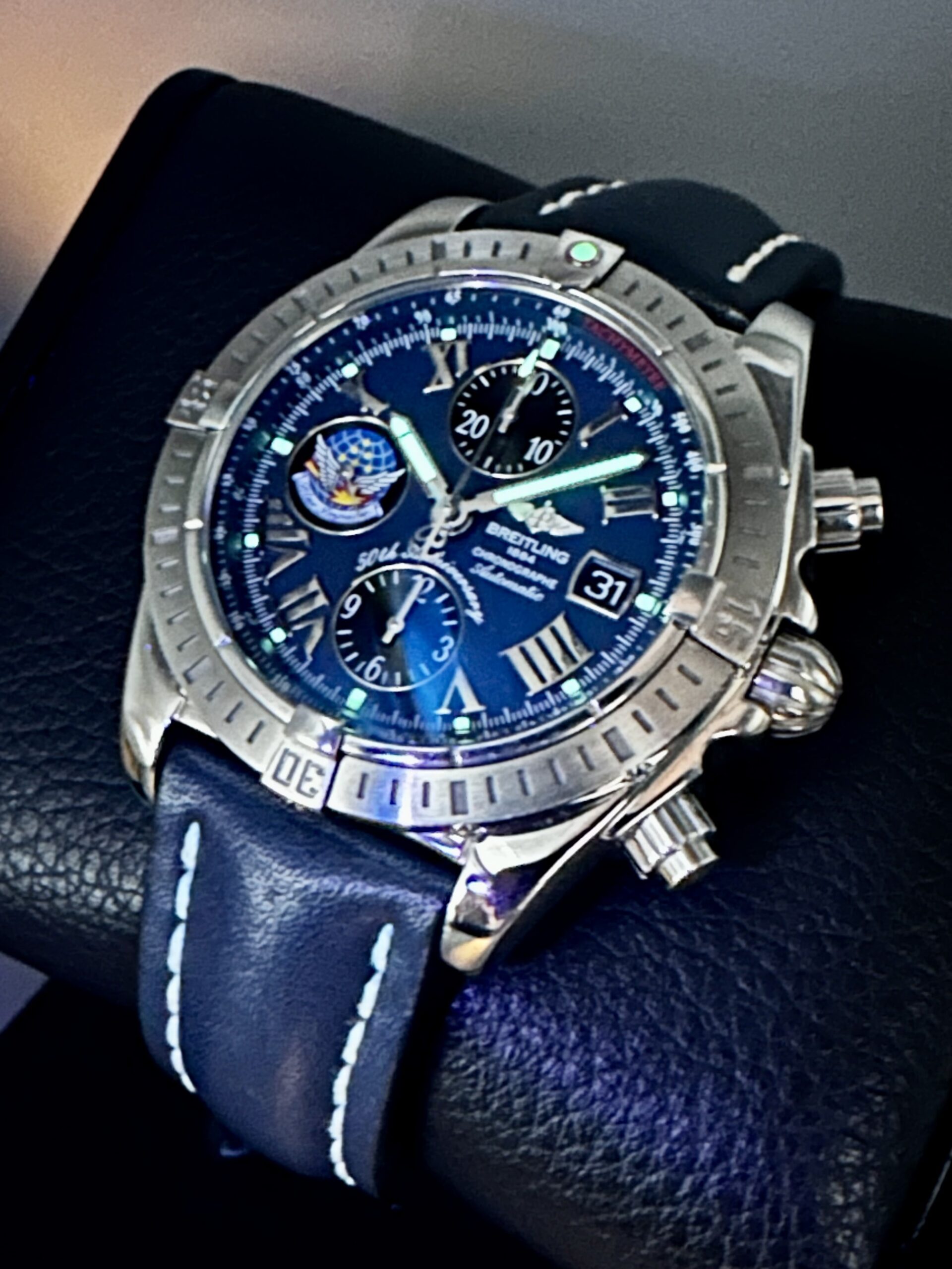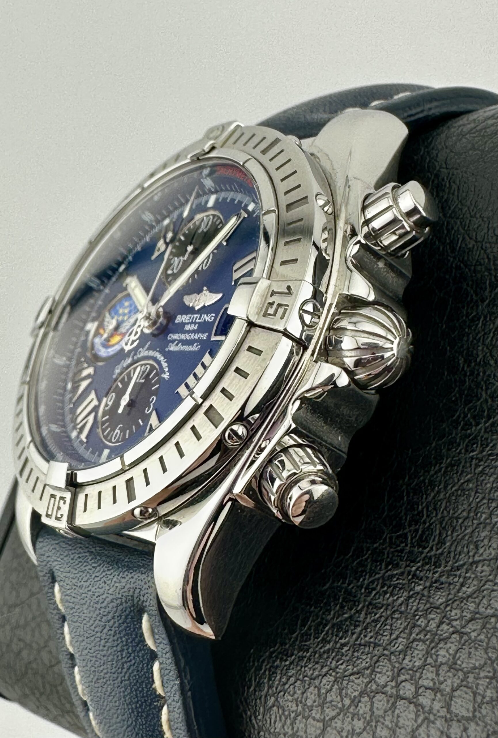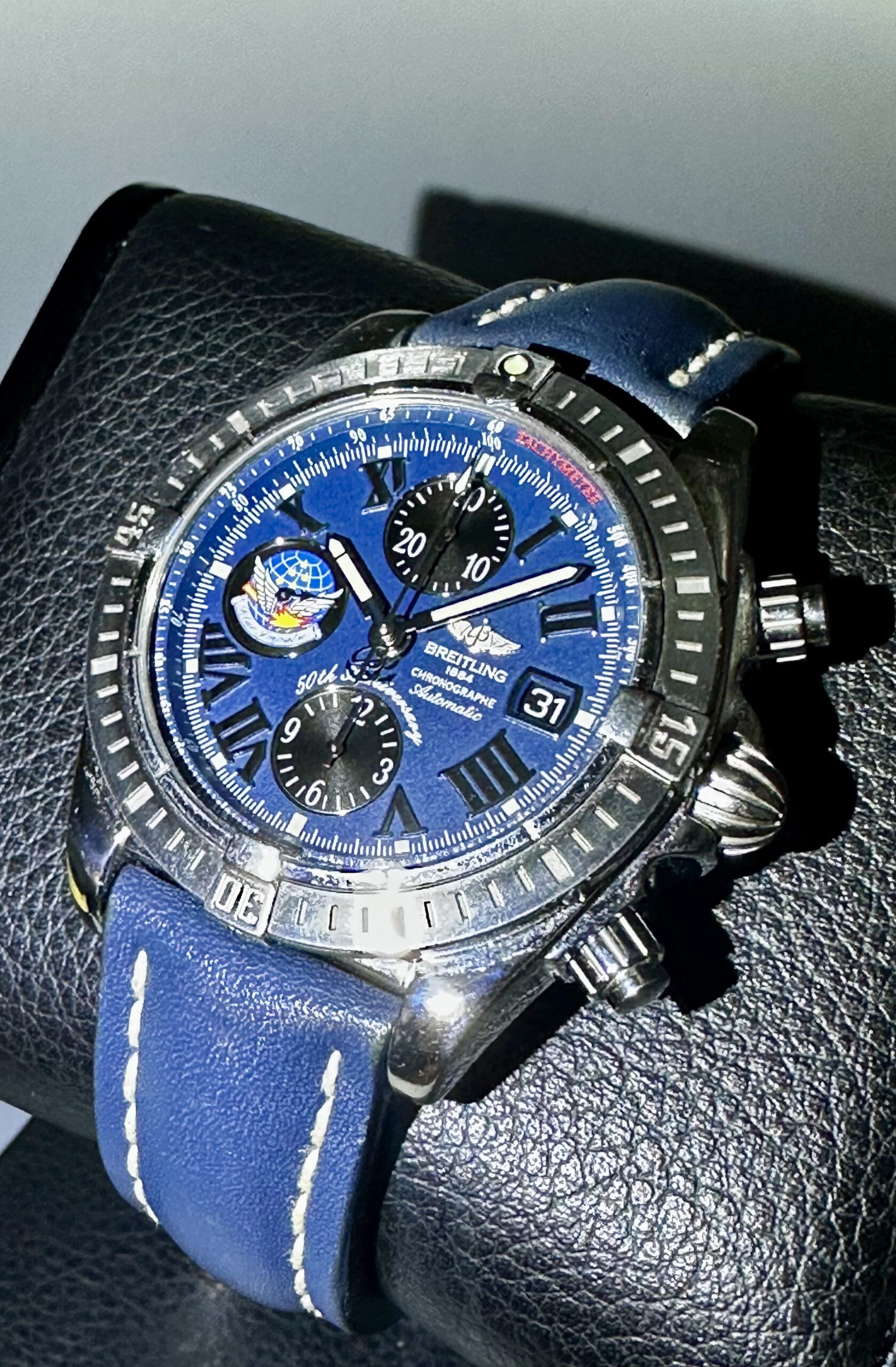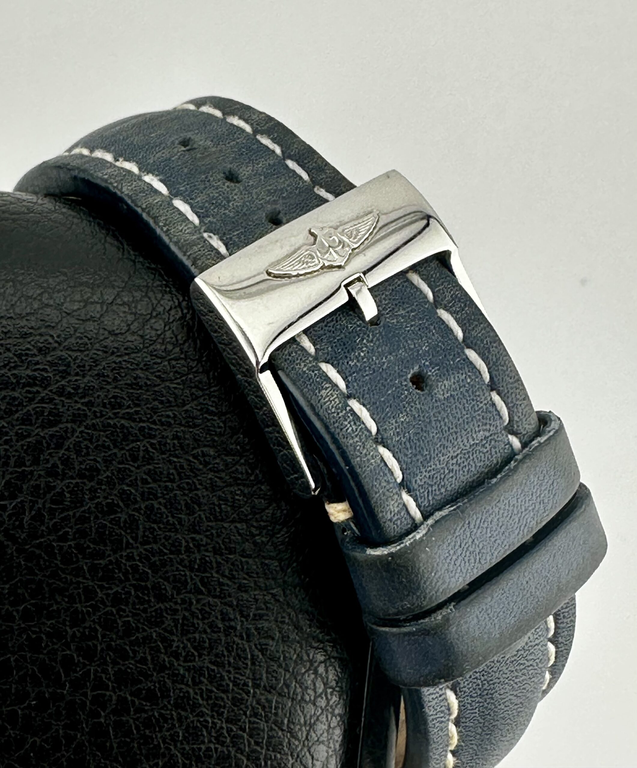 STRAP/BRACELET: – 2 – Breitling Blue Calf Leather strap with Breitling tang buckle & Additional Custom Blue leather strap with Breitling Deployment buckle.