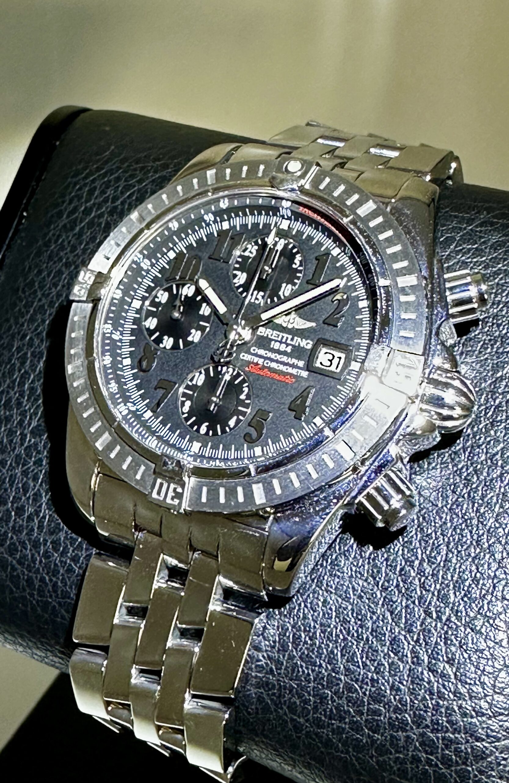STRAP/BRACELET: – Original Breitling Stainless Steel bracelet will fit up to a 7 3/4 inch wrist.