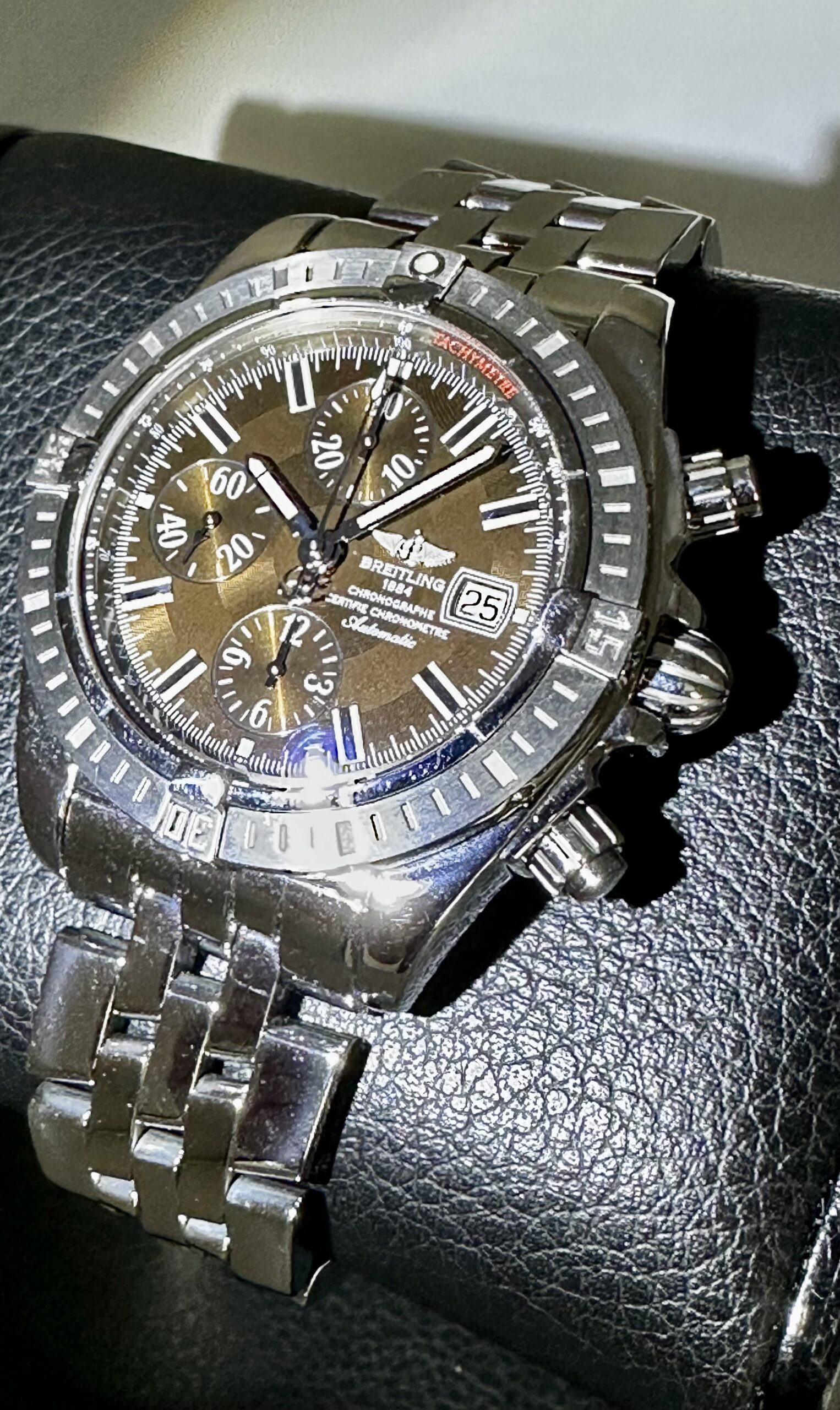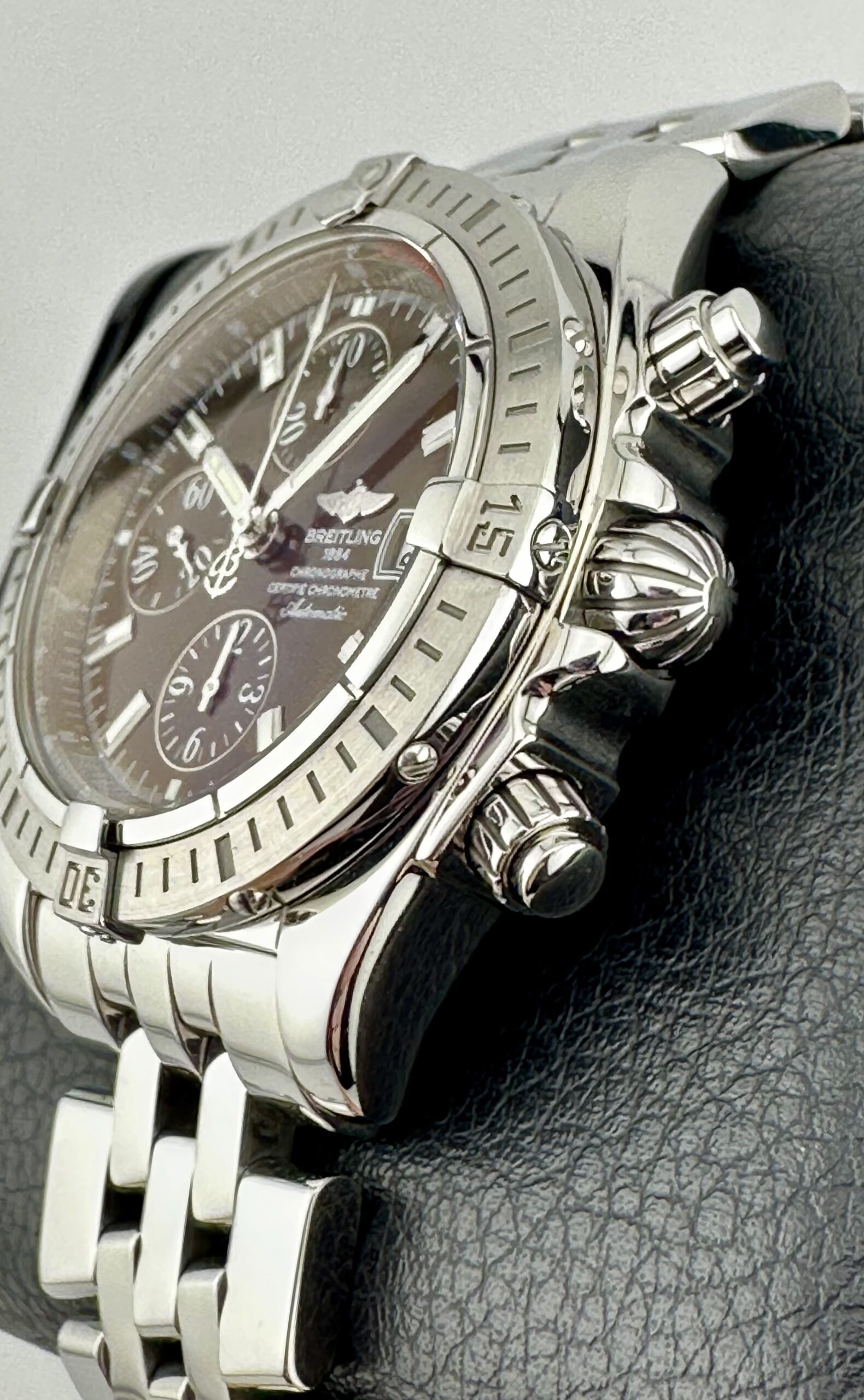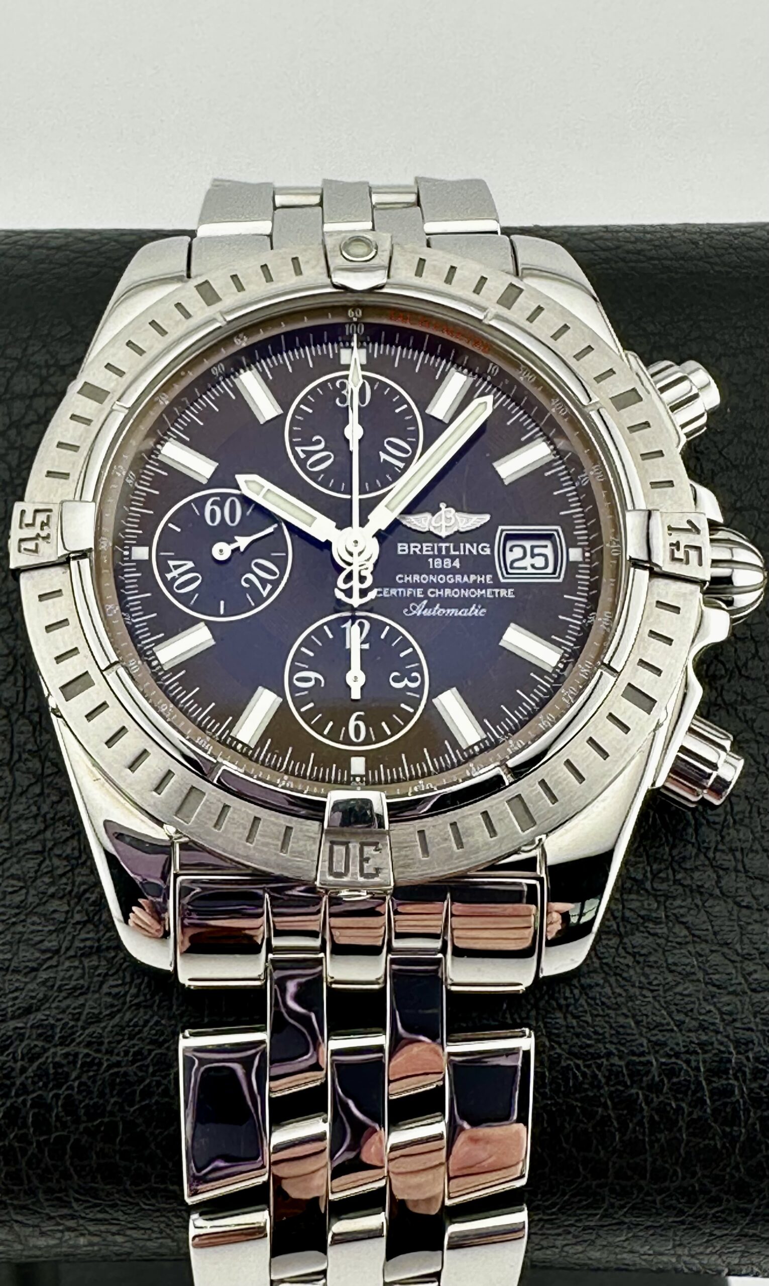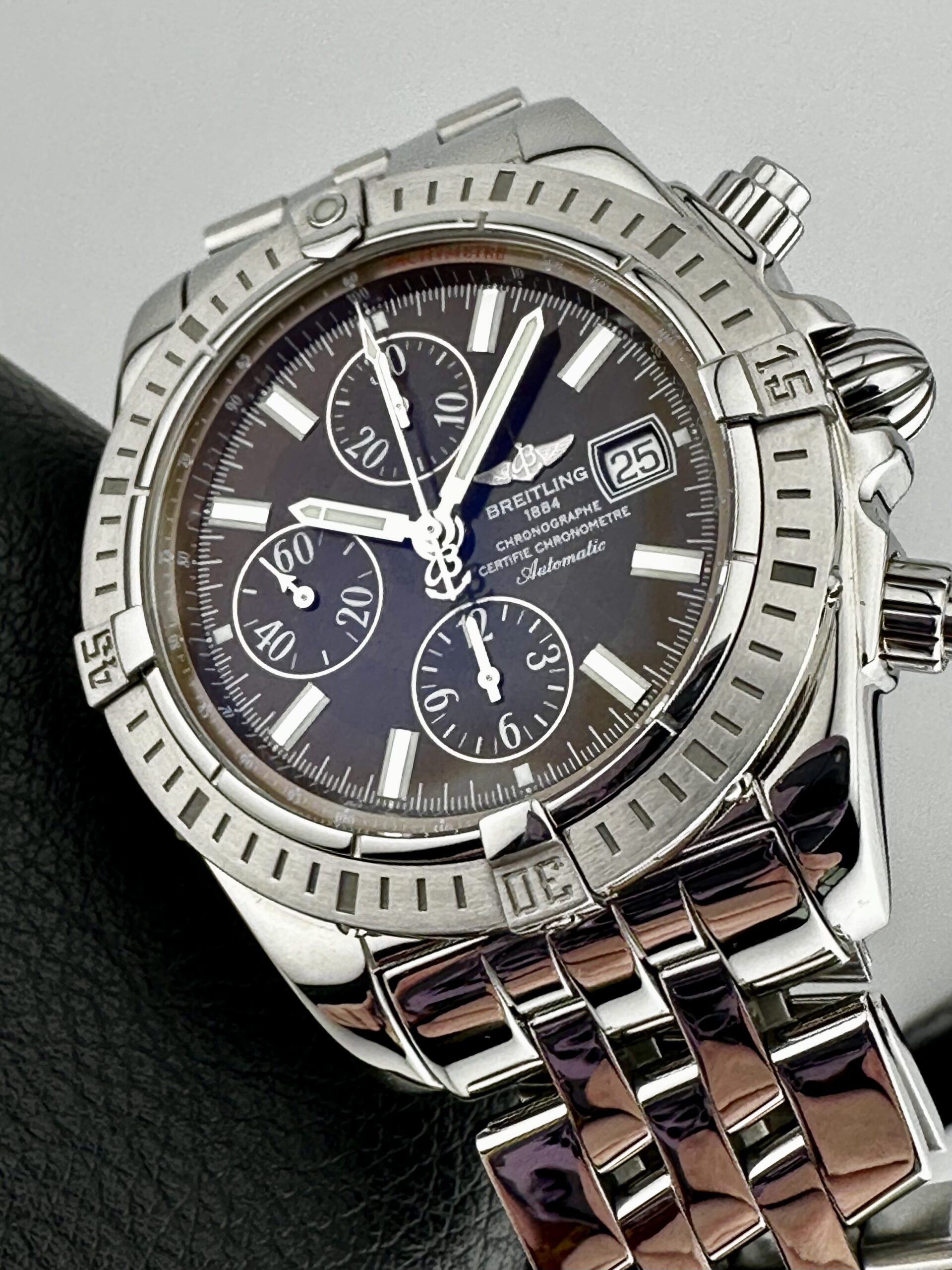 An Absolutely Rare & Gorgeous Breitling Chronomat Evolution!! This is a Very Limited Edition of Only 400 Pieces!! Simply Stunning! Also very rare Complete Box Set with Original Warranty Book as shown in pictures. This Comes from my private Breitling Chronomat Evolution 9 Piece Collection! The Chronomat Evolution – when Breitling made extraordinary Timepieces!!