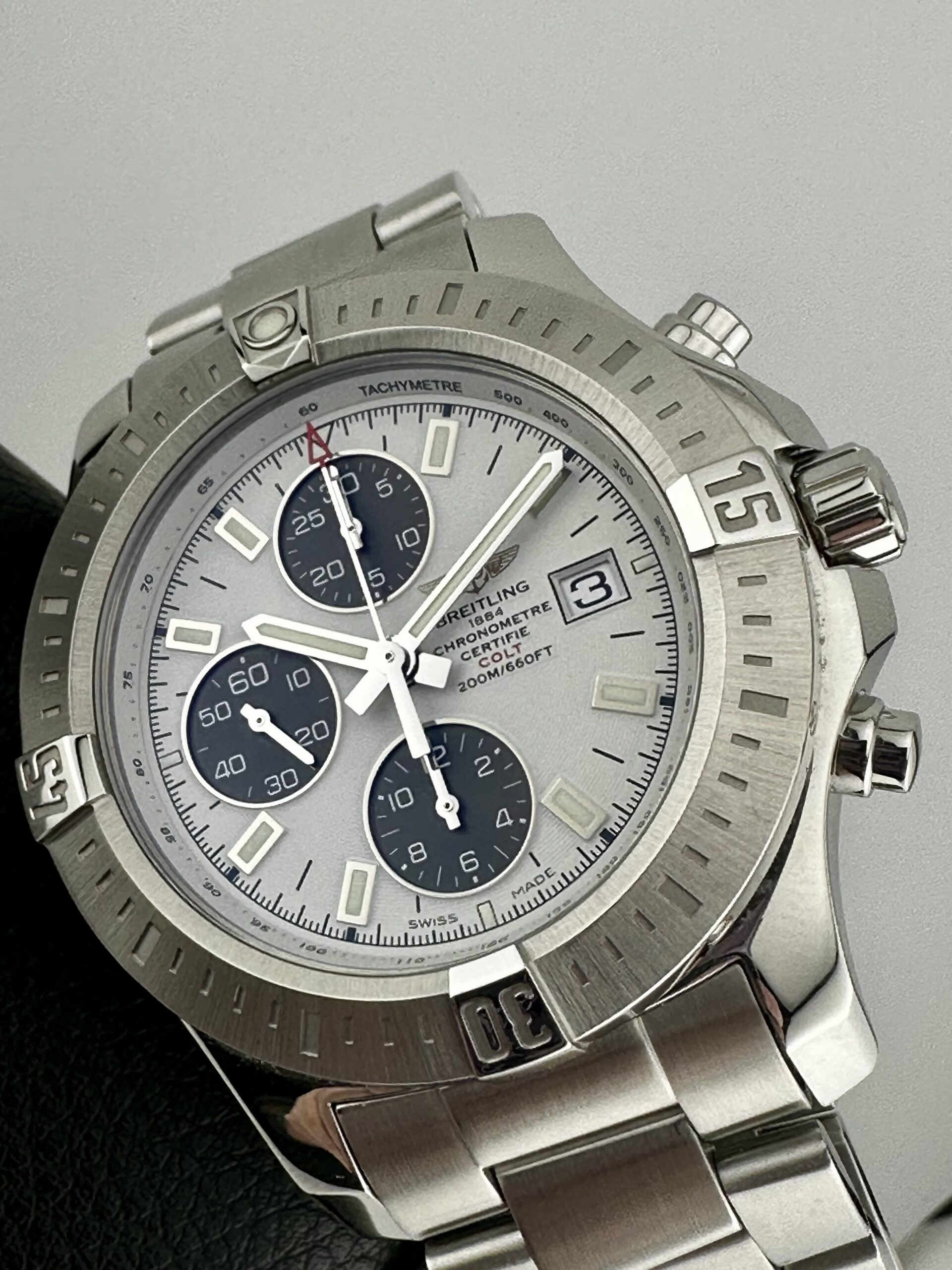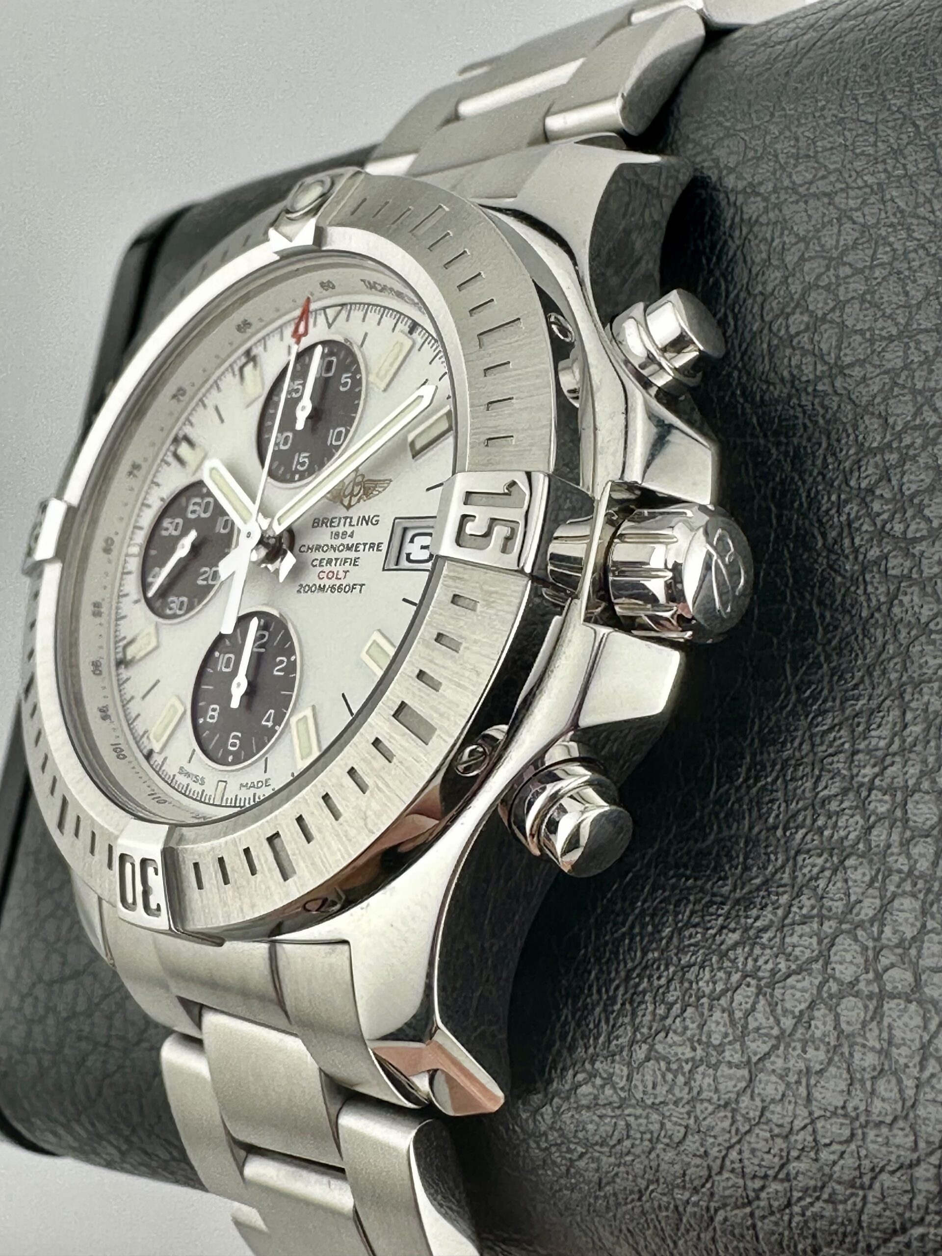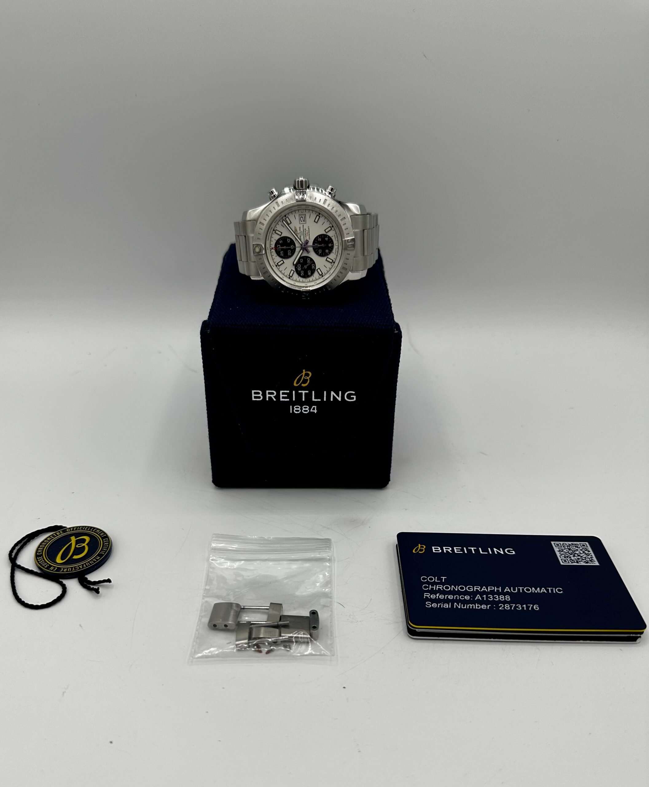An Absolutely Gorgeous Breitling Colt Chronograph with Beautiful Silver Panda Dial!! 100% Complete Set in Incredible condition and has all original links to the bracelet!