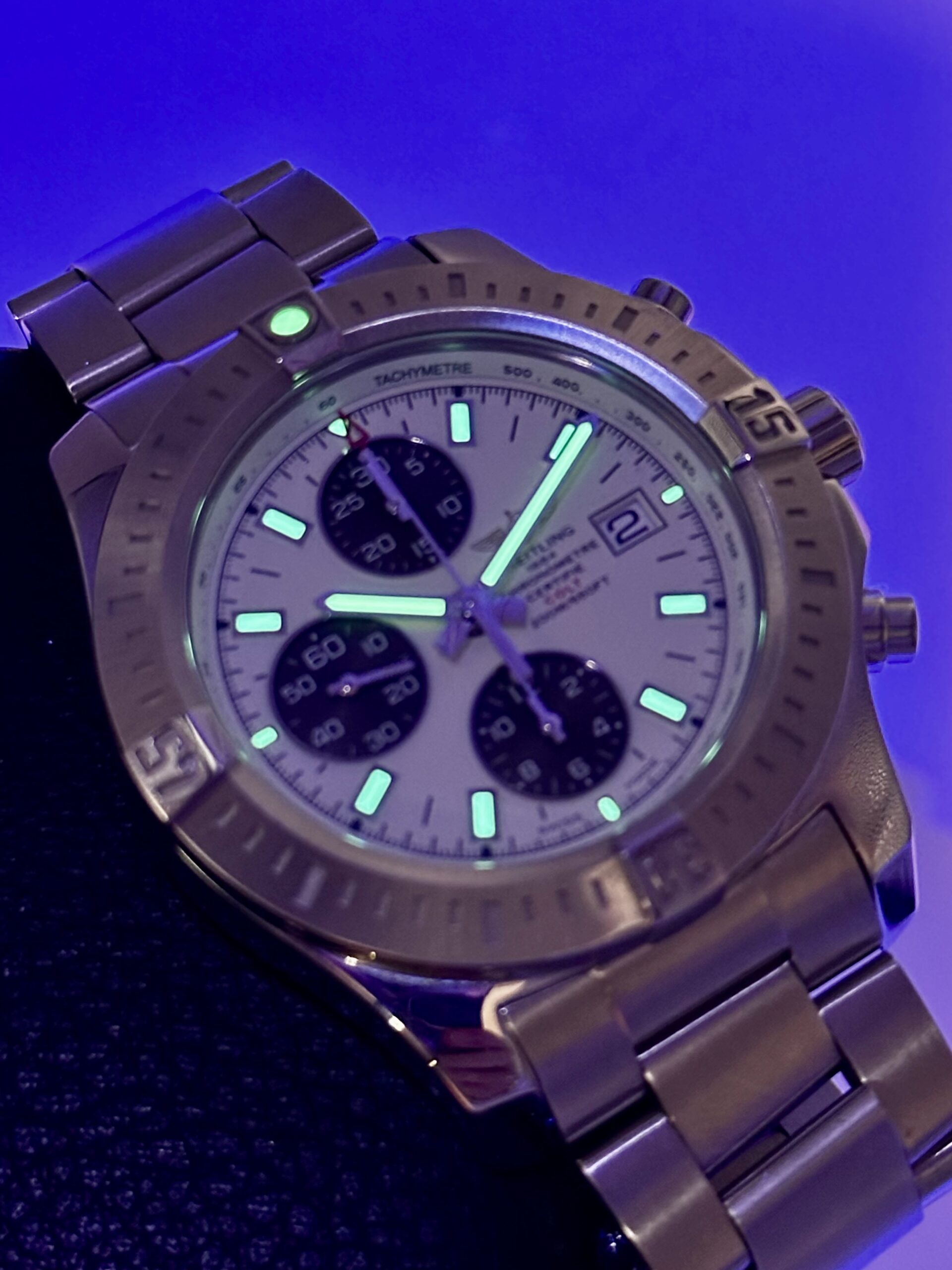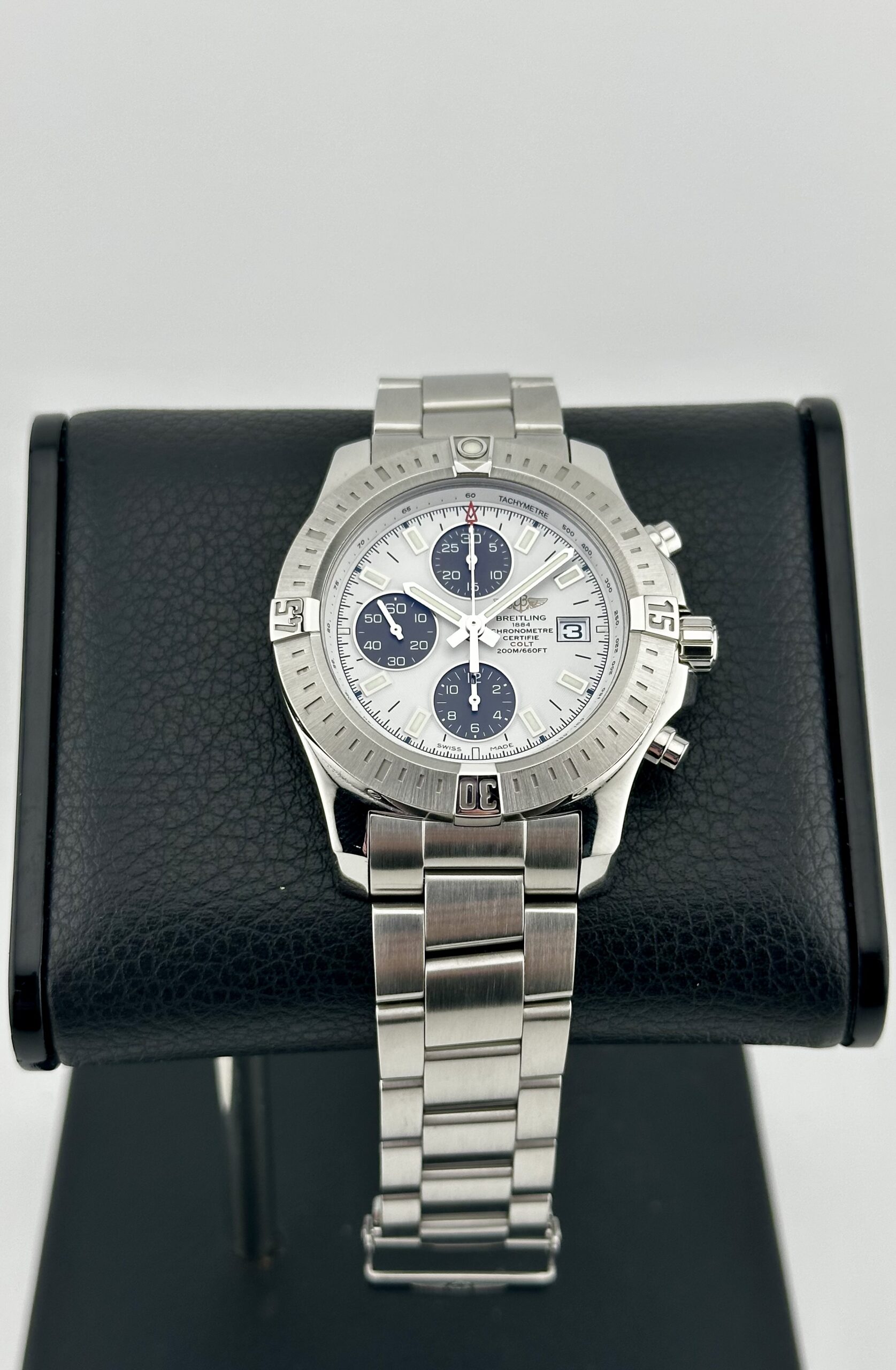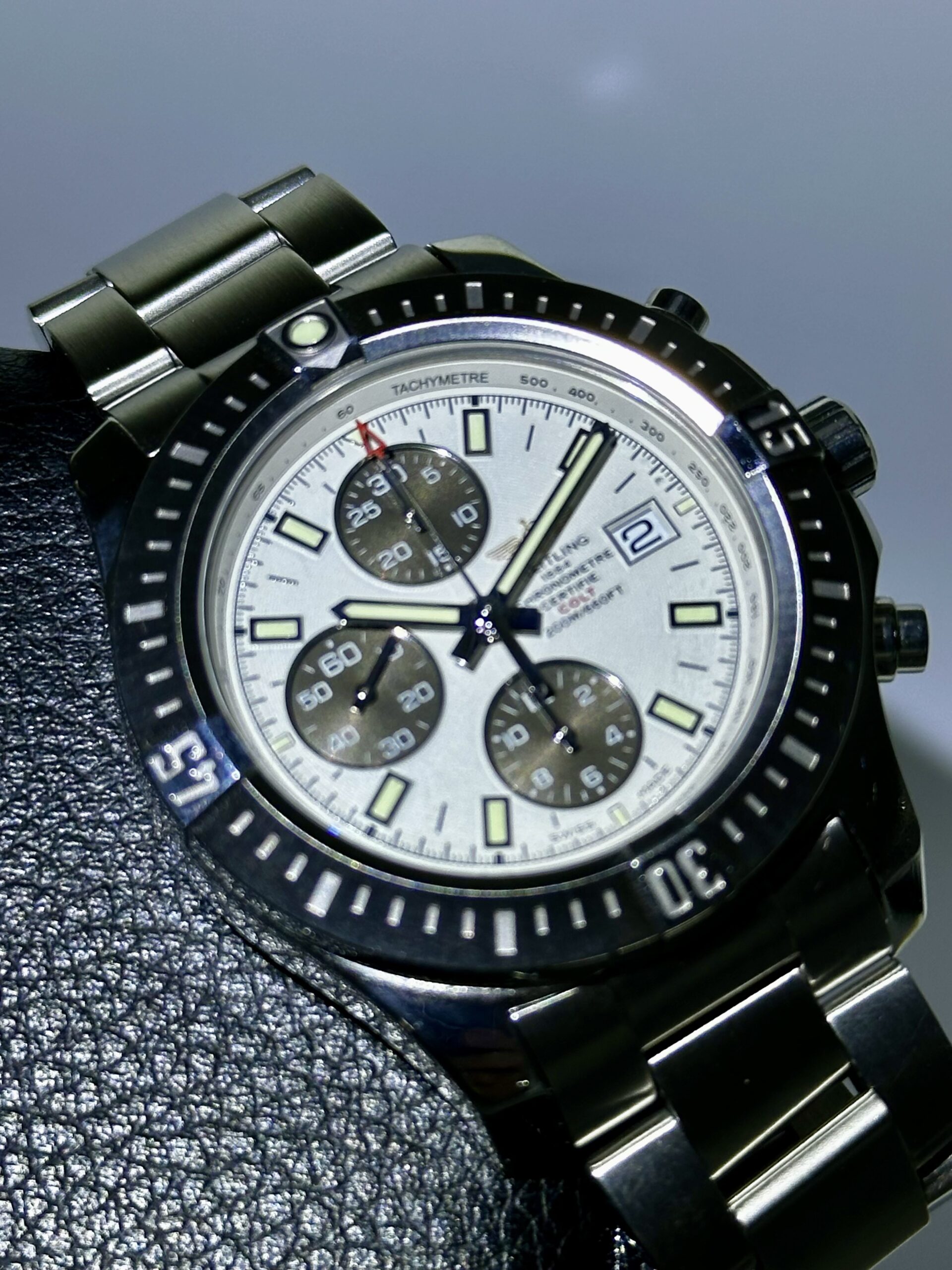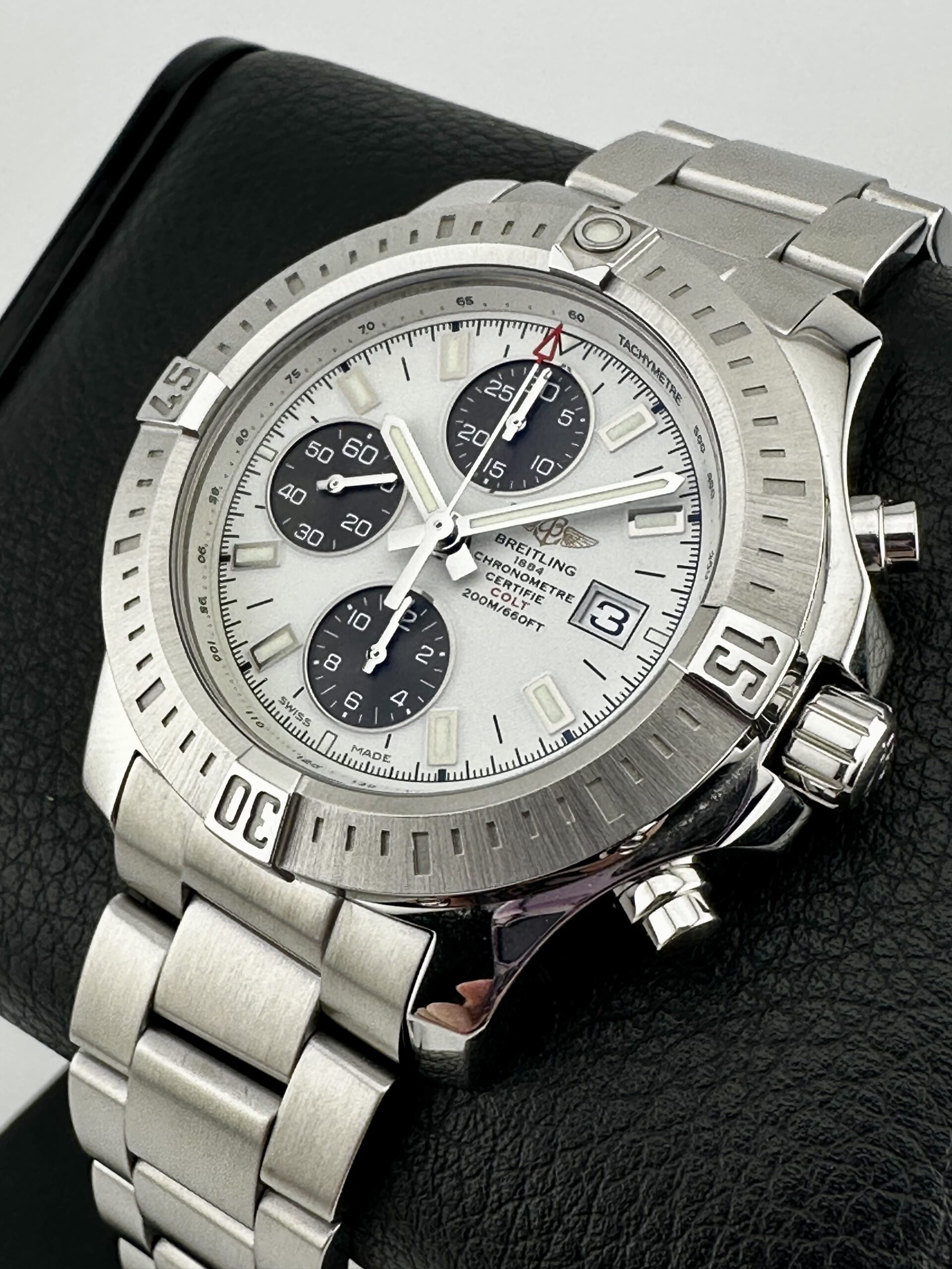 An Absolutely Gorgeous Breitling Colt Chronograph with Beautiful Silver Panda Dial!! 100% Complete Set in Incredible condition and has all original links to the bracelet!