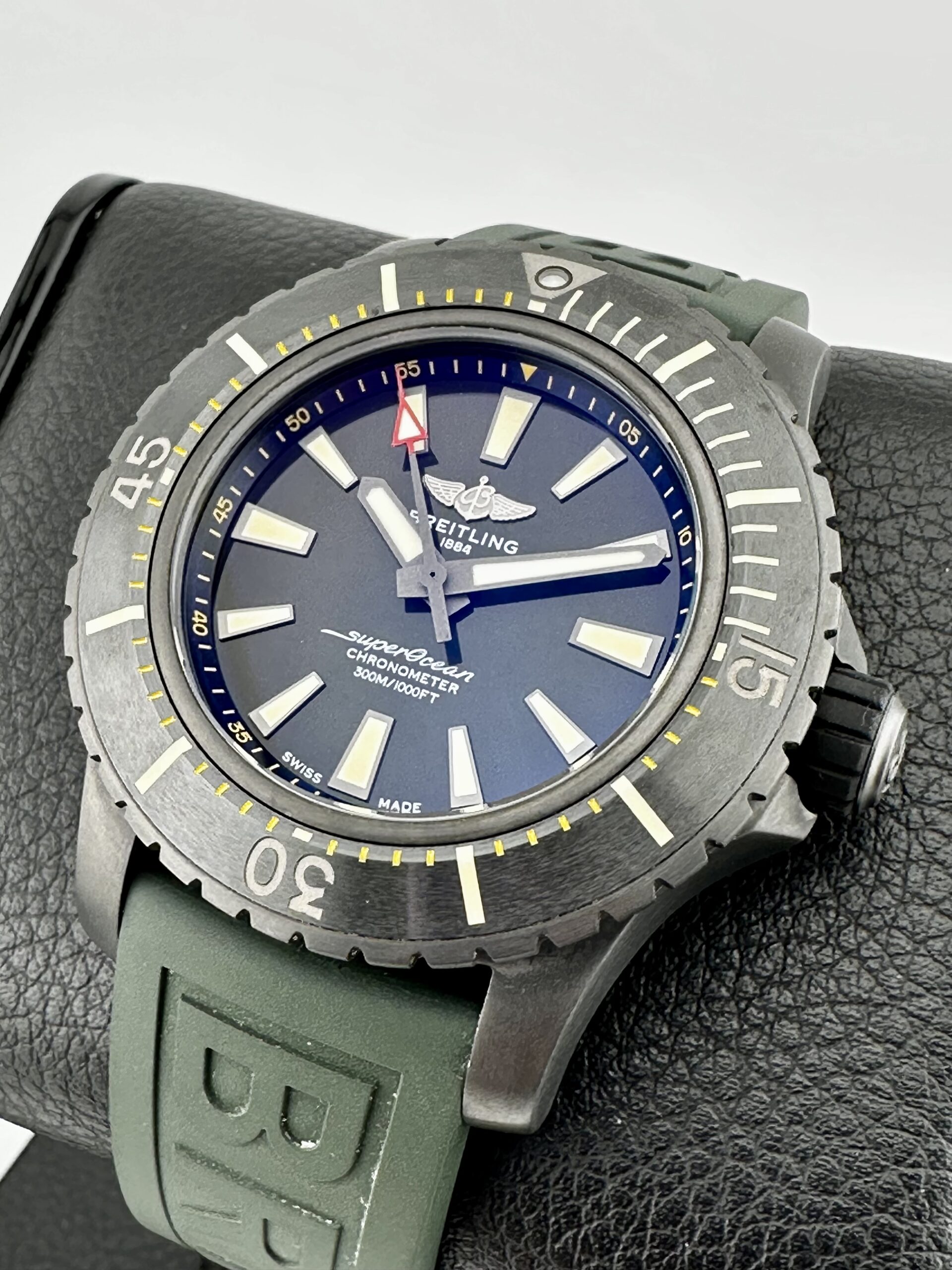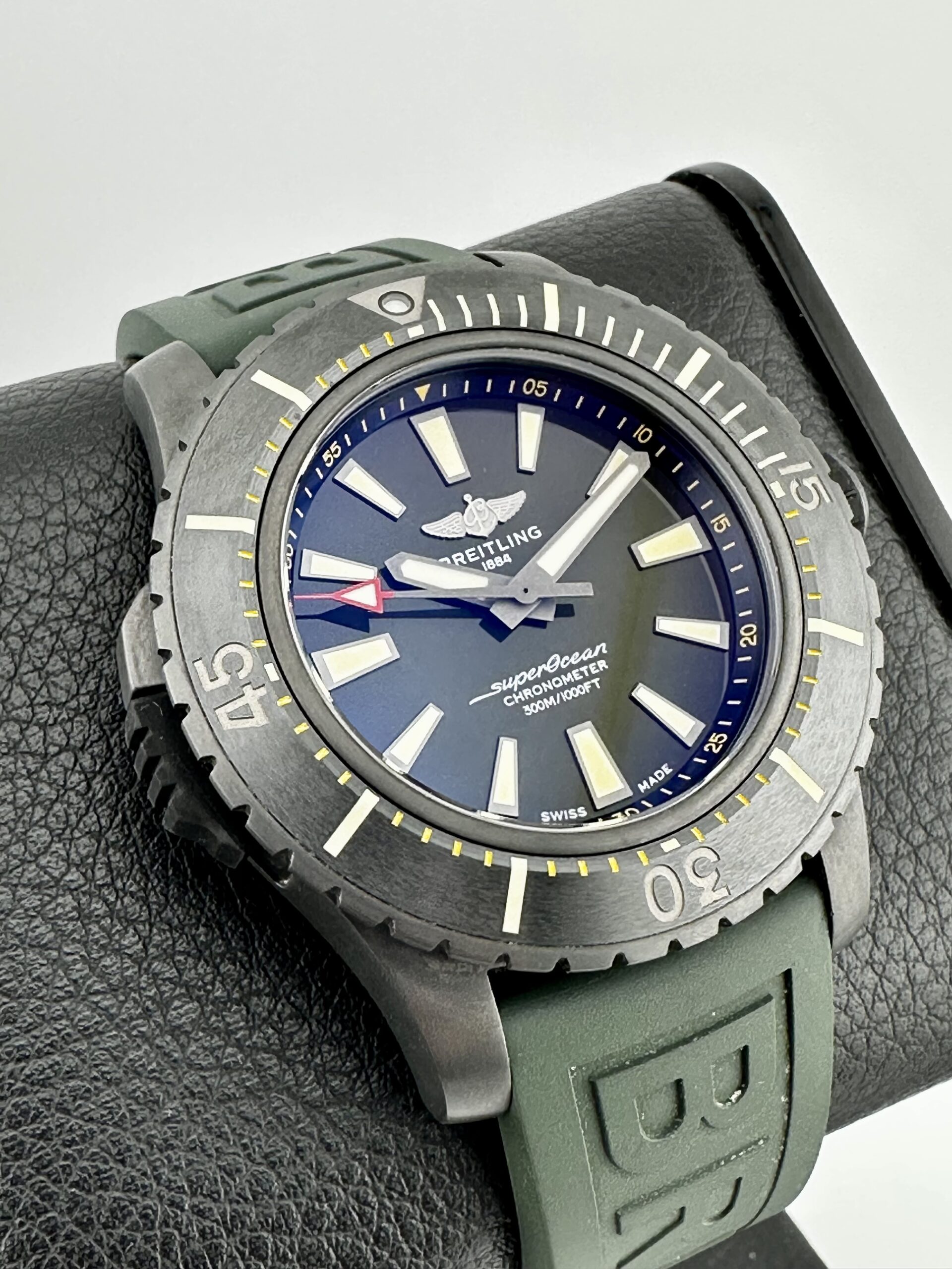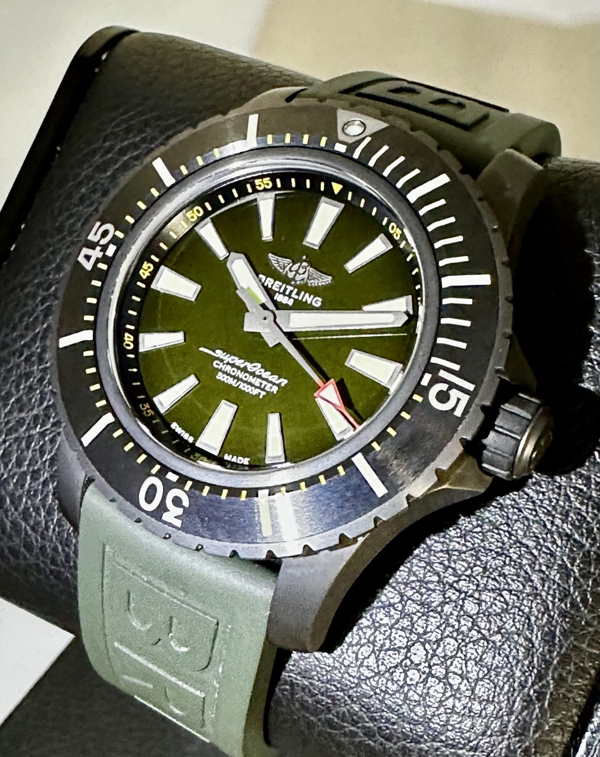 Gorgeous Breitling Boutique Exclusive SuperOcean 48 with Awesome Green Dial! Awesome Black DLC Titanium case without a mark on it!!! Brand New Oct 2024 and has Breitling warranty through Oct 2026!!