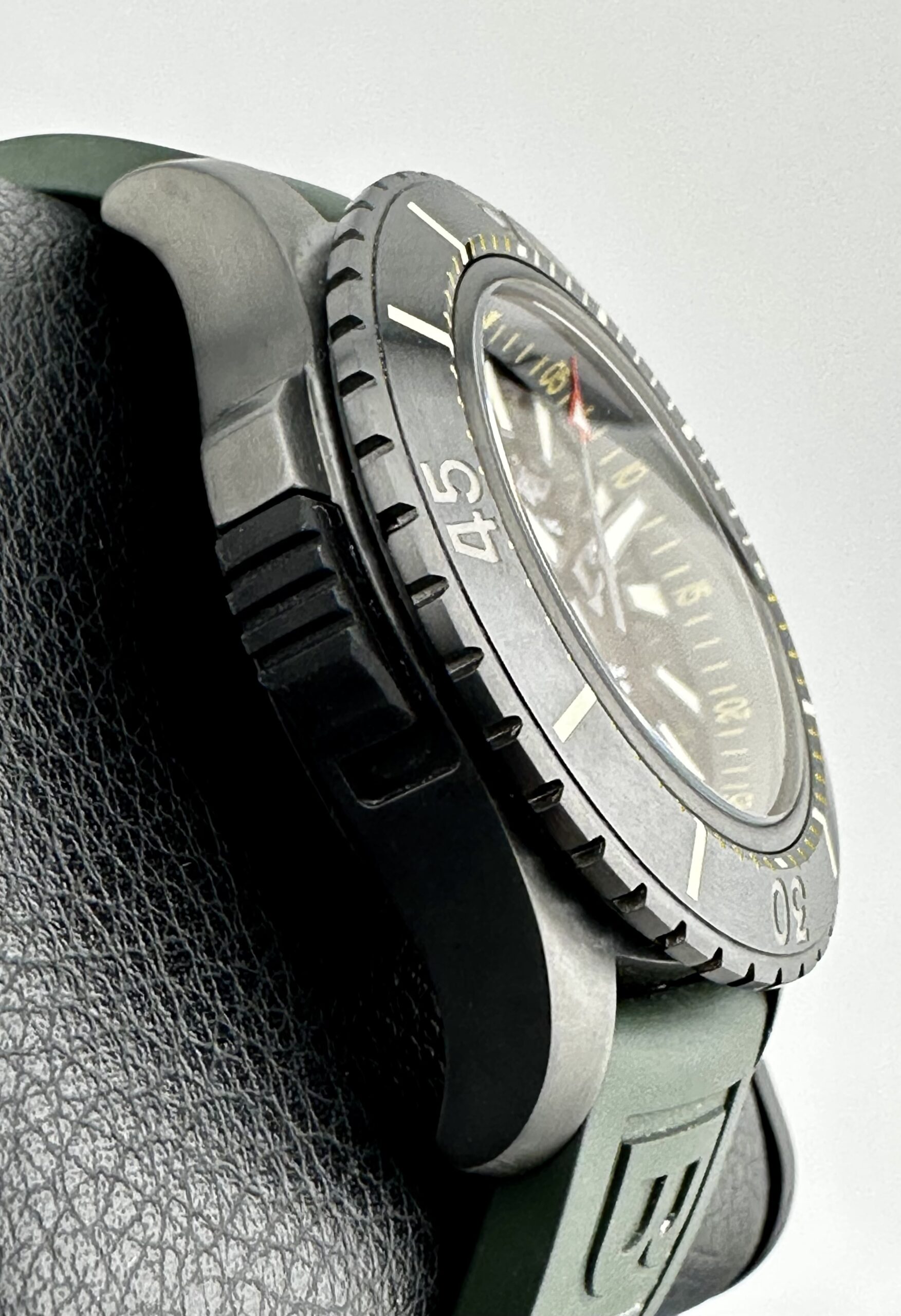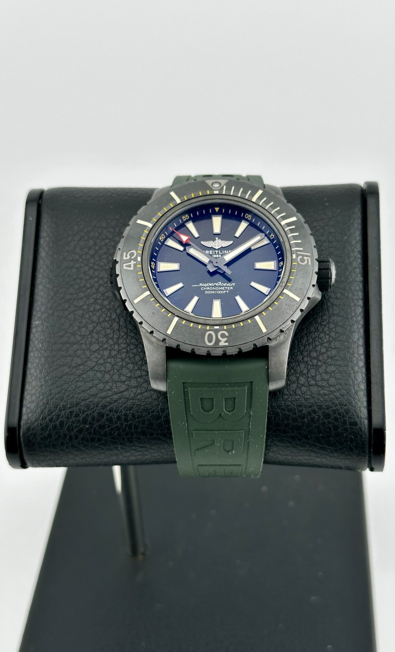 STRAP/BRACELET: – Original Breitling Green Rubber Strap with Black Breitling buckle.