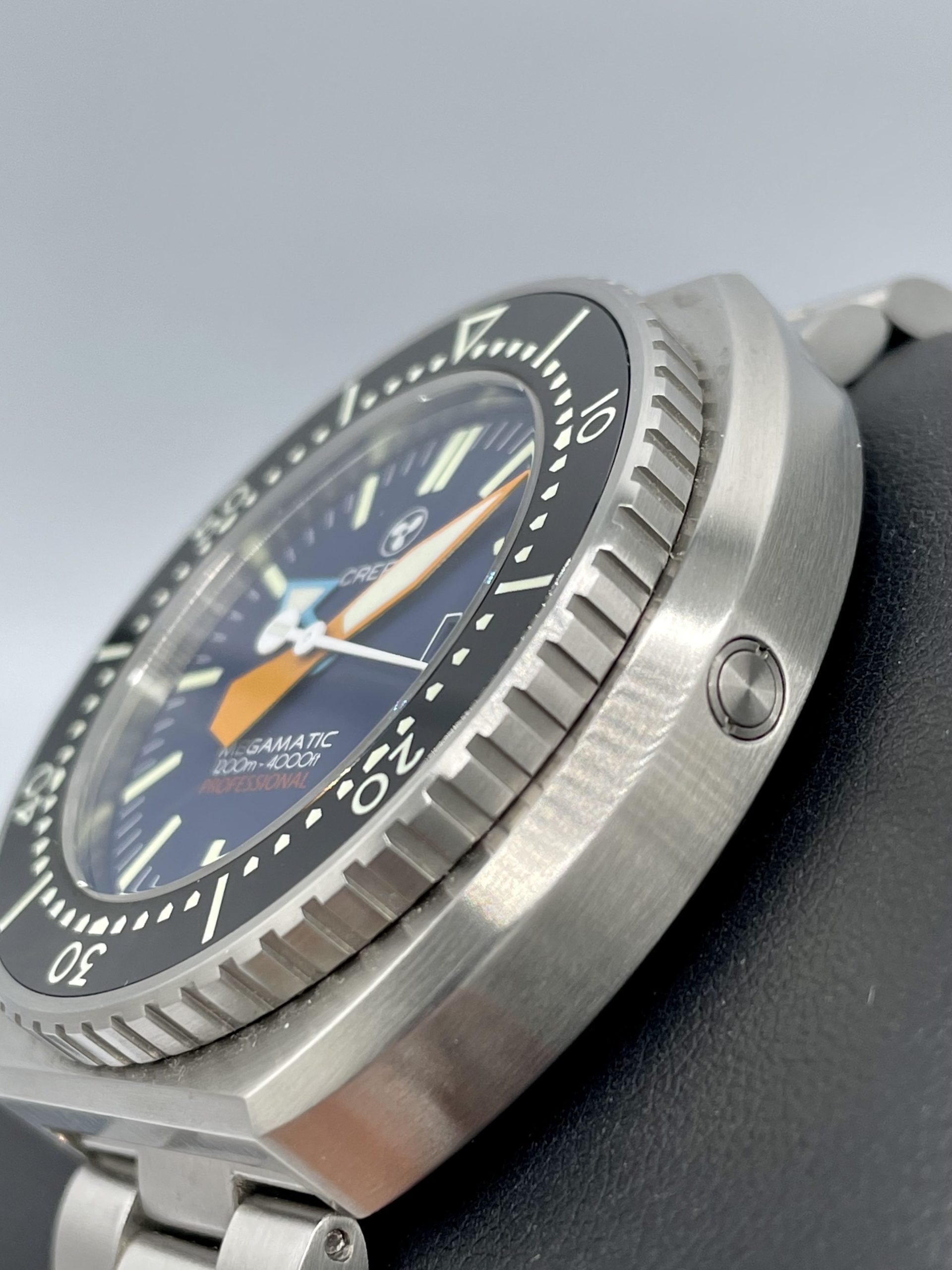 The bezel insert is ceramic, excellently finished and, as you will see further down, is fully luminous. My only complaint about the case is that, whilst Crepas present the crown placement as a matter of choice, unless you wear the watch on your right wrist, it simply wouldn’t be usable with the crown at 3 o’clock. Consequently, most buyers will have to accept the 9 o’clock placement although, if one can get past the unique looks of the Megamatic, the crown position is hardly an additional hurdle.