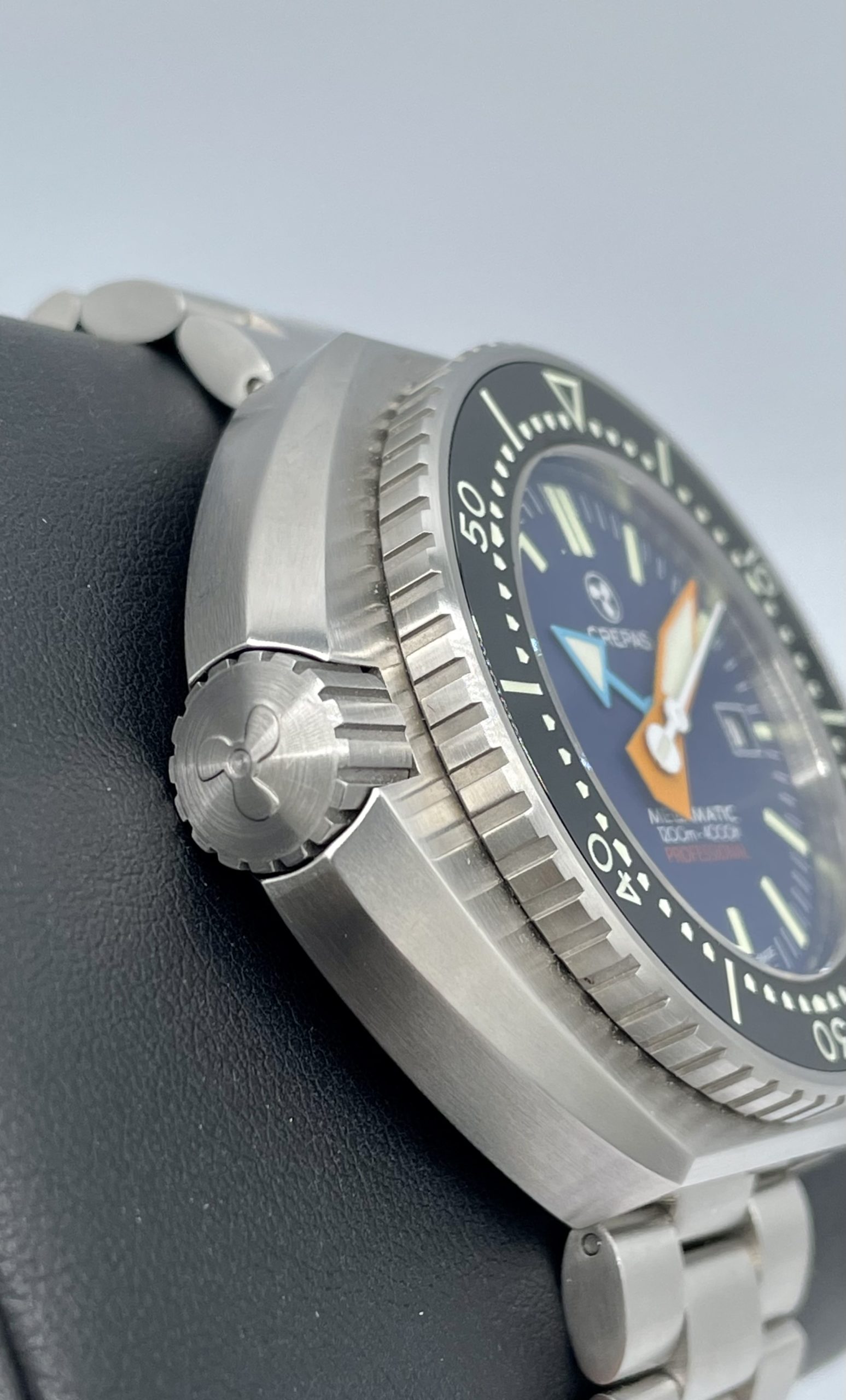Inevitably, your eye will have been drawn to the enormous crown on the side of this watch. Curiously, this is one of the entirely Crepas-designed parts of the watch and features their rather charming propeller logo. In brushed and blasted steel, it also matches the case and delivers an unbeatable grip to wind and set the watch. Additionally, for a watch which is £800 new, the action is flawless as it screws in. This matches the bezel very well which offers 120 clicks and lines up precisely.