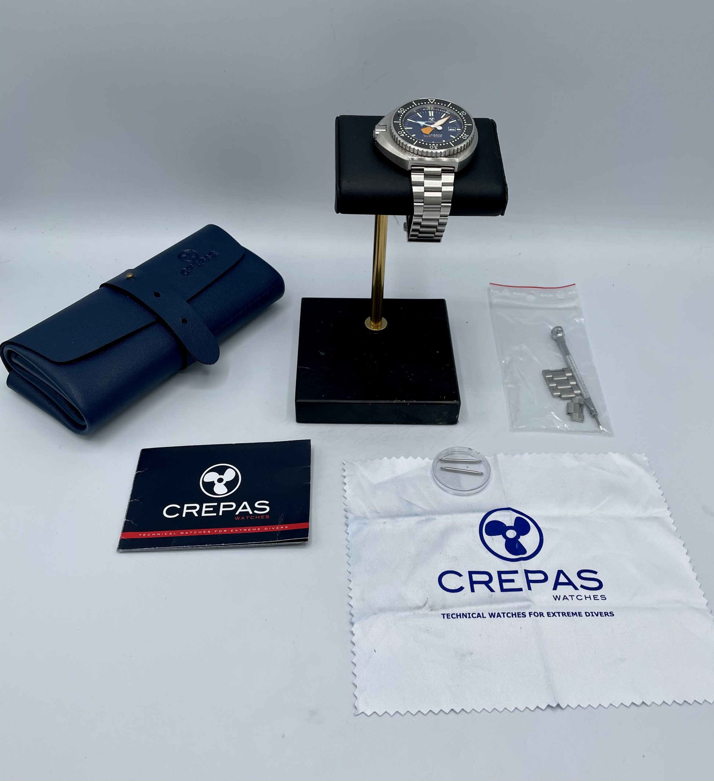 BOX/PAPERS – Complete Set! Crepas Leather Roll, Polishing cloth, Spring bars, tool, warranty card & watch! – Everything Included in pictures!