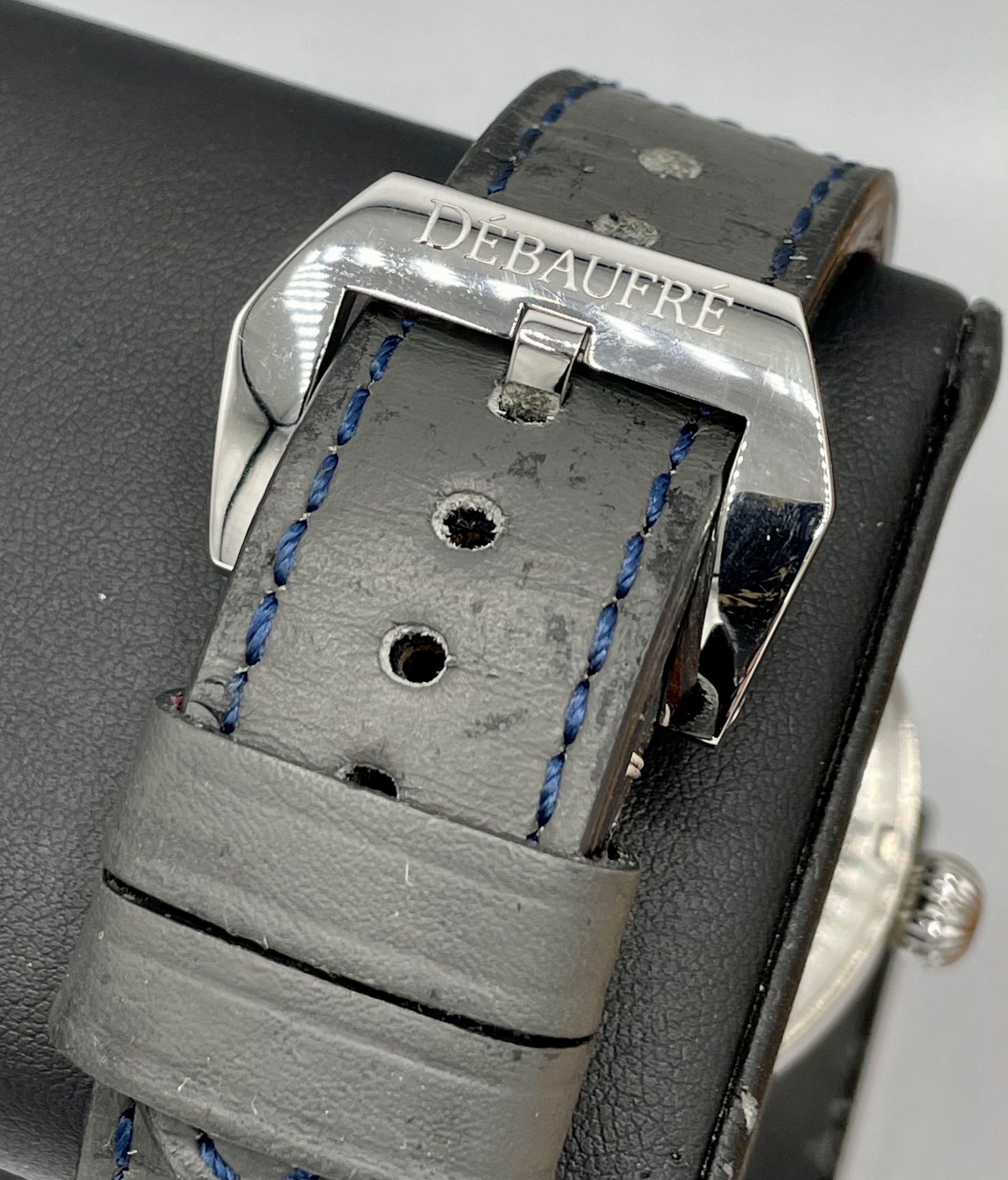 STRAP/BRACELET: – 2 – Original Debaufre Blue leather strap with Signed Steel buckle & Additional Original Debaufre Black Alligator strap.