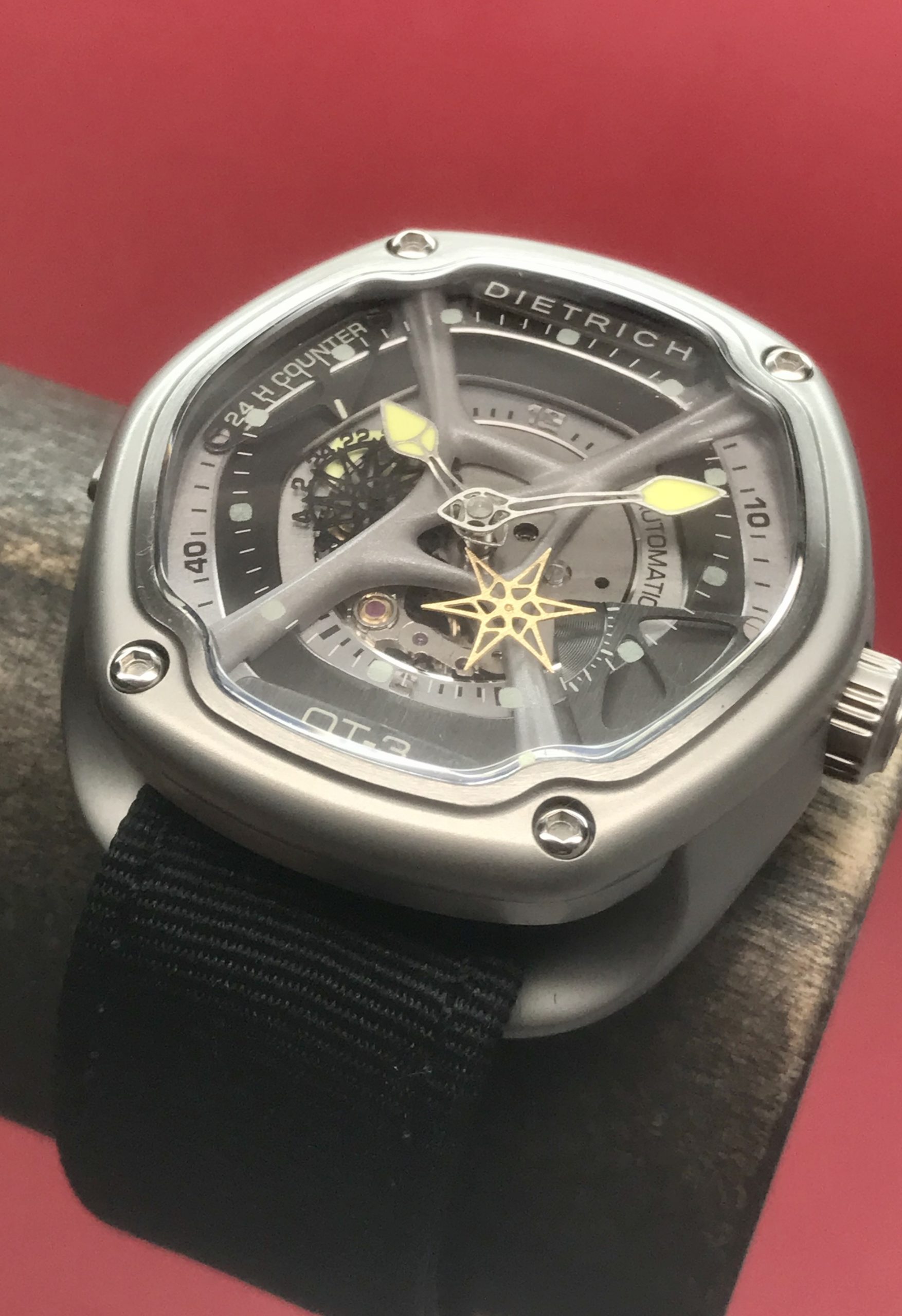 Under the hands you’ll notice the rounded “X” structure, which gives the illusion of continuing through to the screws on the bezel. The “X” fills the dial up nicely and helps to visually balance the different indications. Underneath that, the sides of the dial as well as the raised Dietrich 1969 and OT-2 plaques at 12 and 6 o’clock respectively are done in vertically brushed anthracite, catching and reflecting light as you move your wrist.