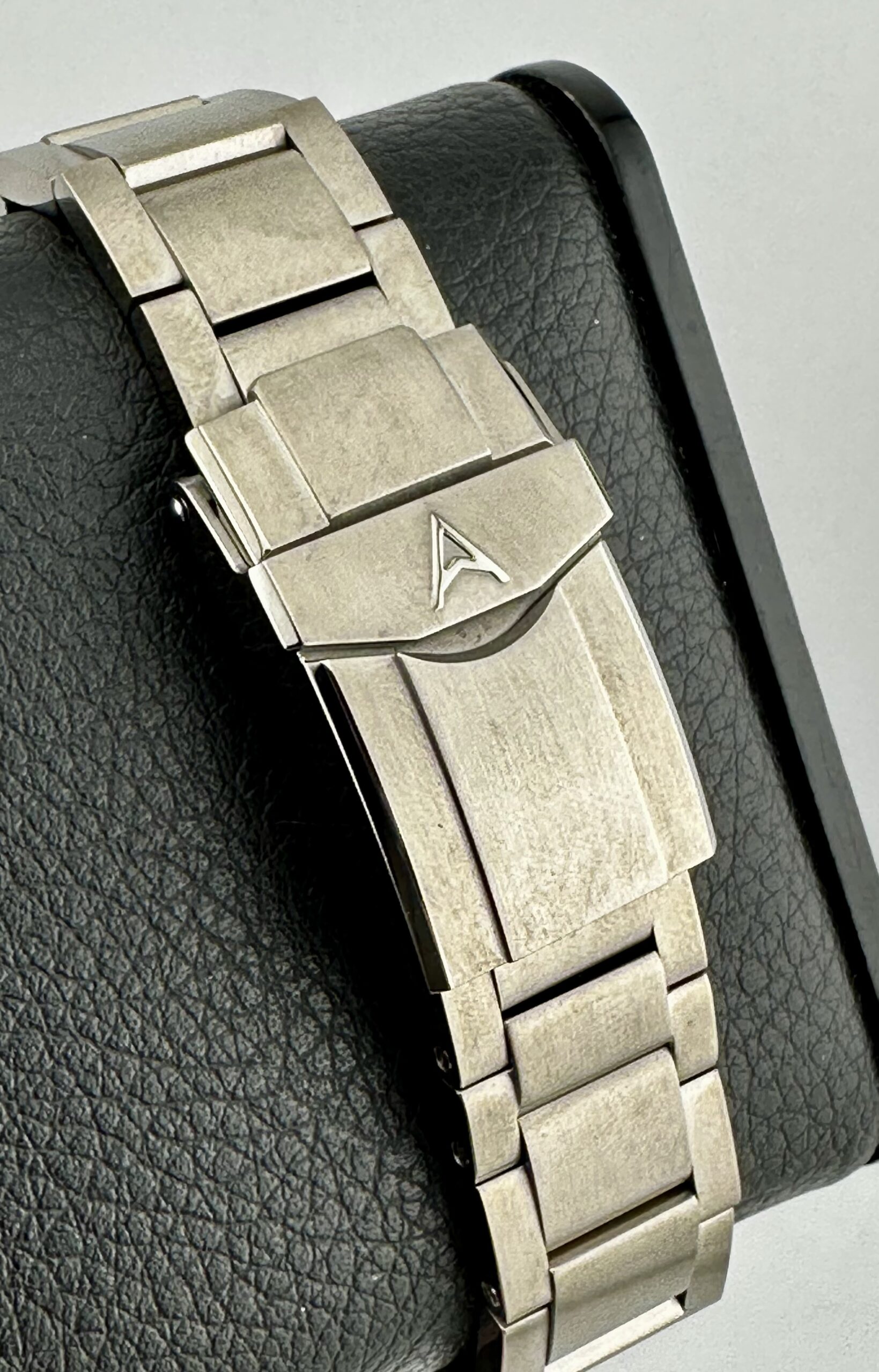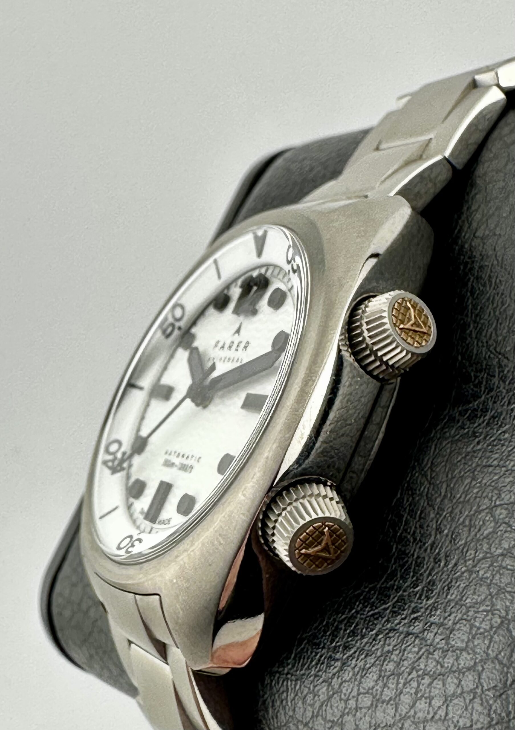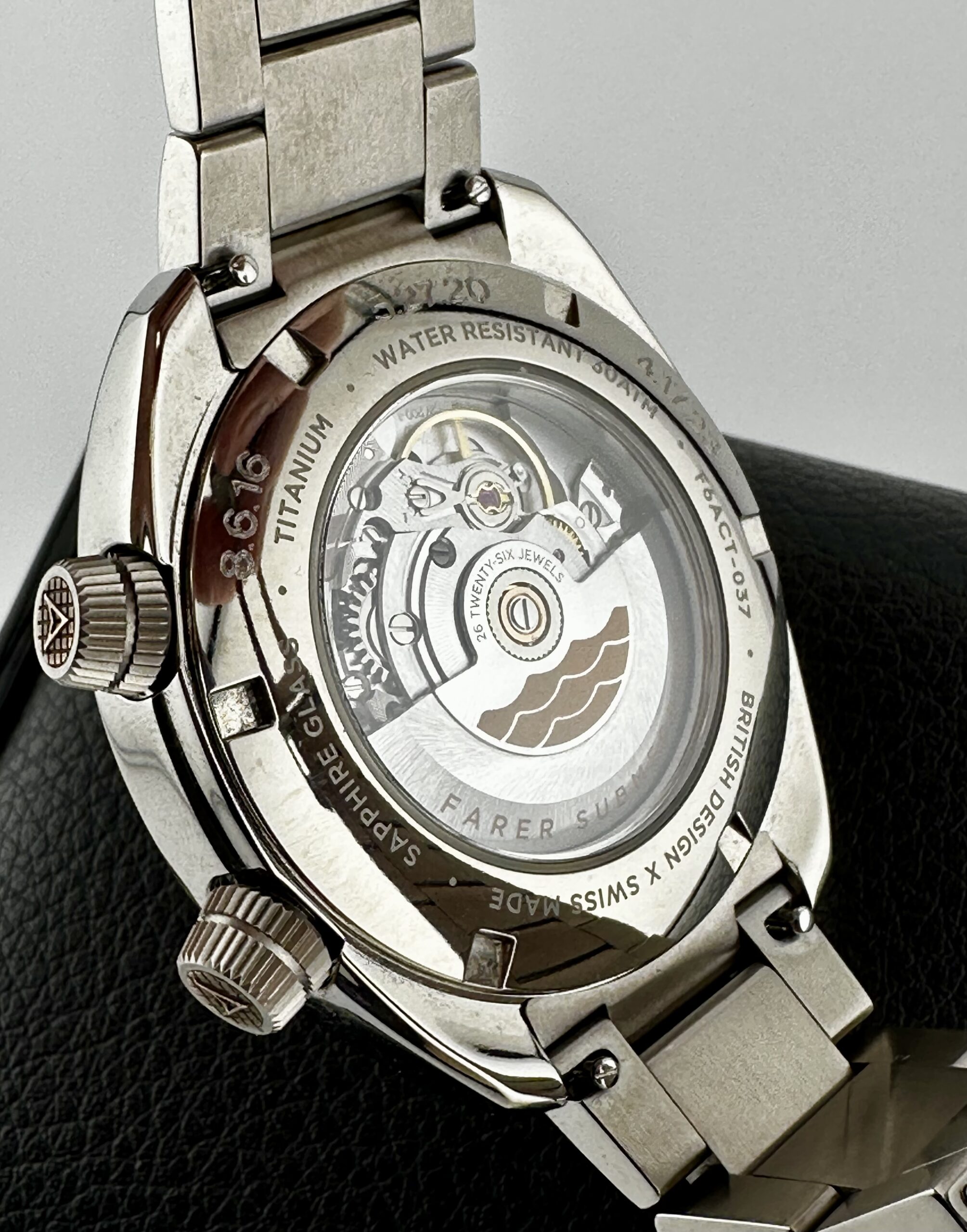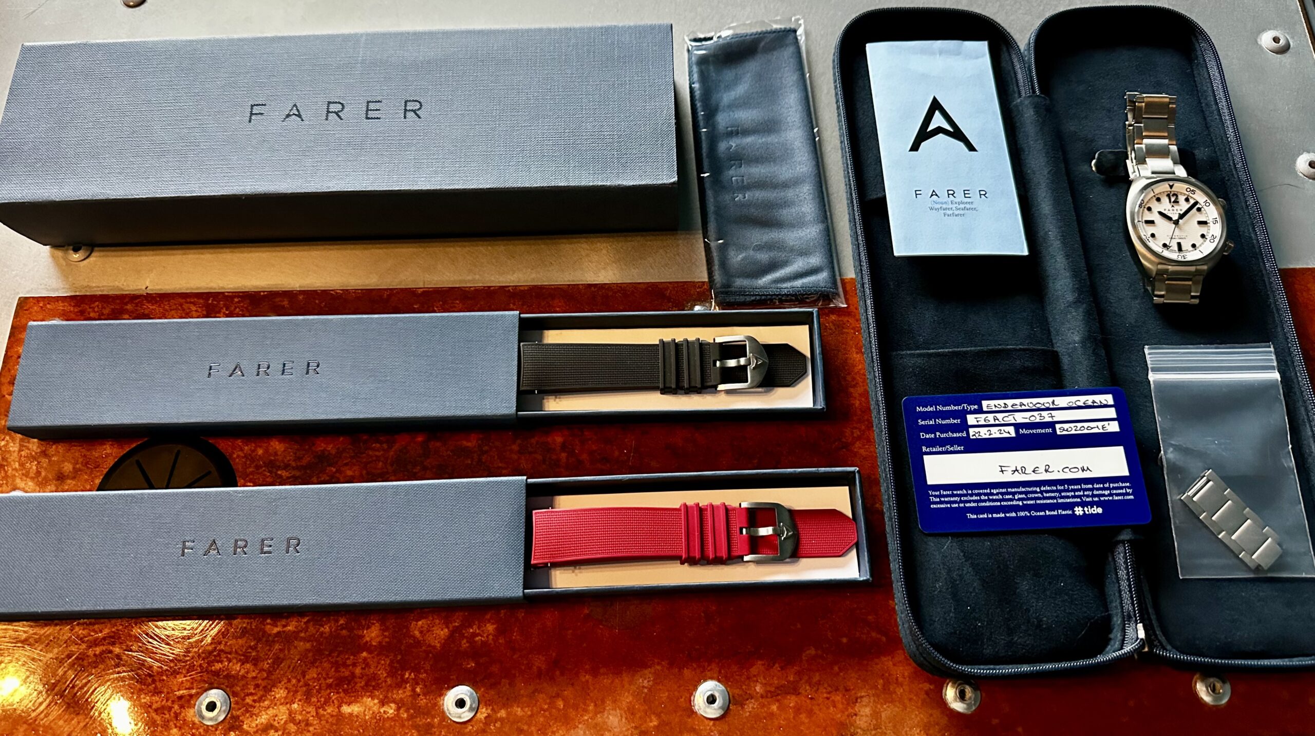 STRAP/BRACELET: – 3 – Original Farer Titanium Bracelet with all links & Additional Original Farer Black Rubber strap with signed Steel Buckle & Additional Farer Red Rubber Strap with Steel buckle.