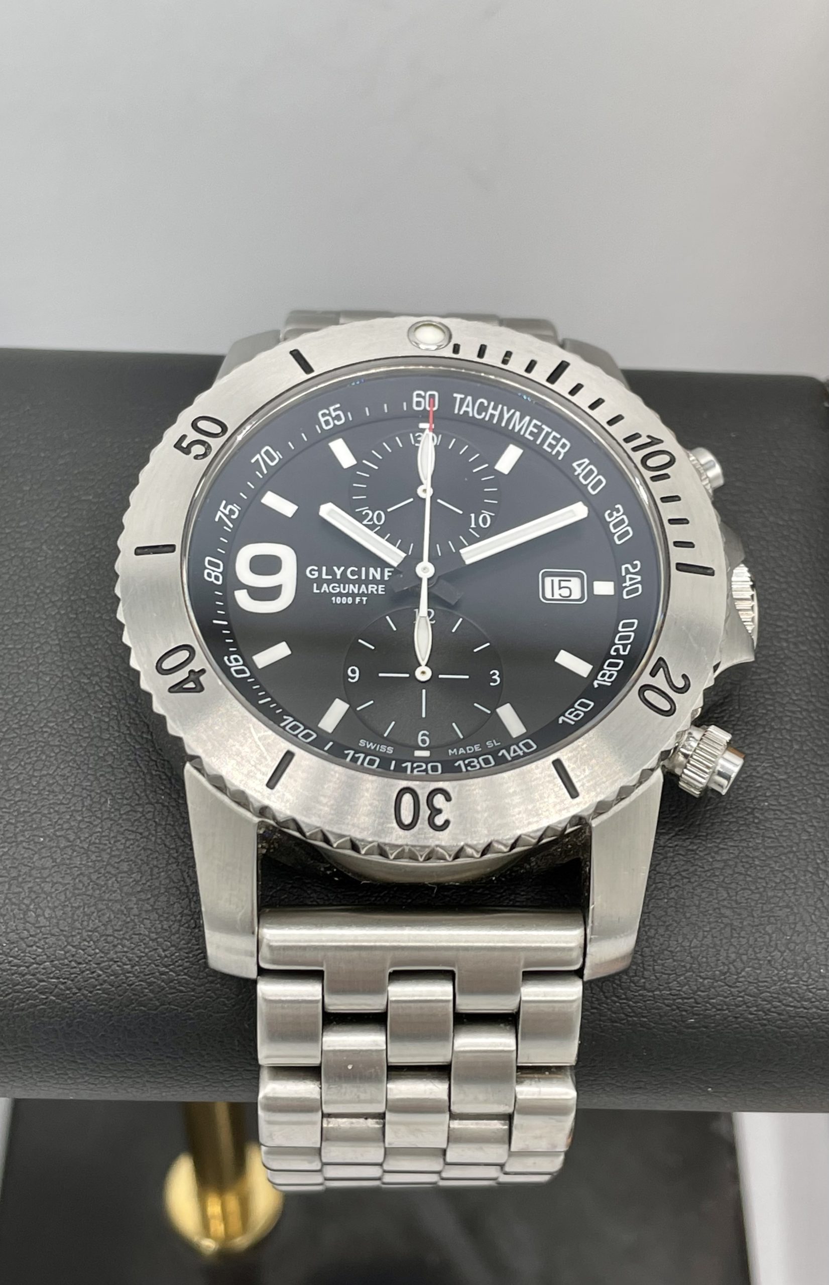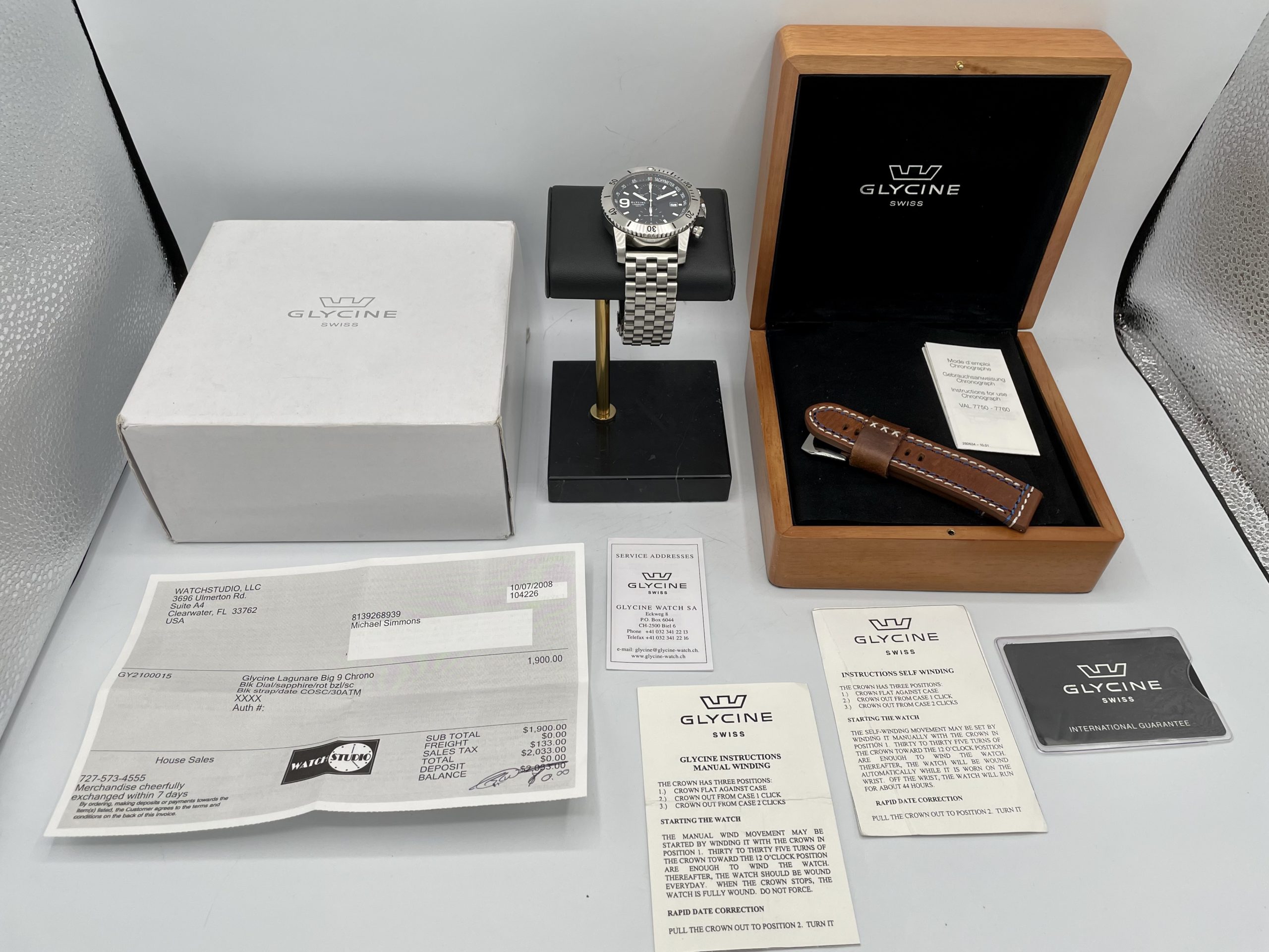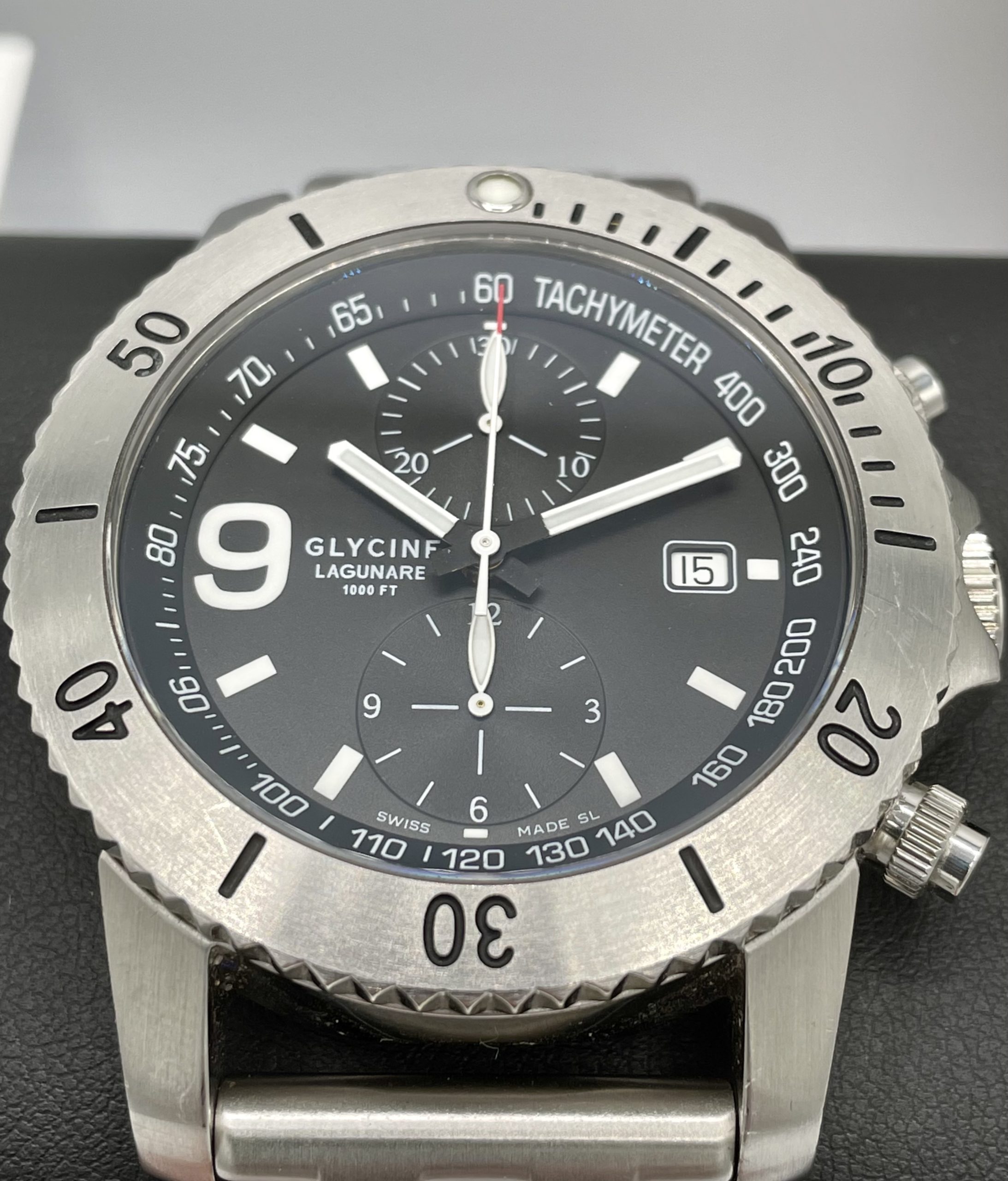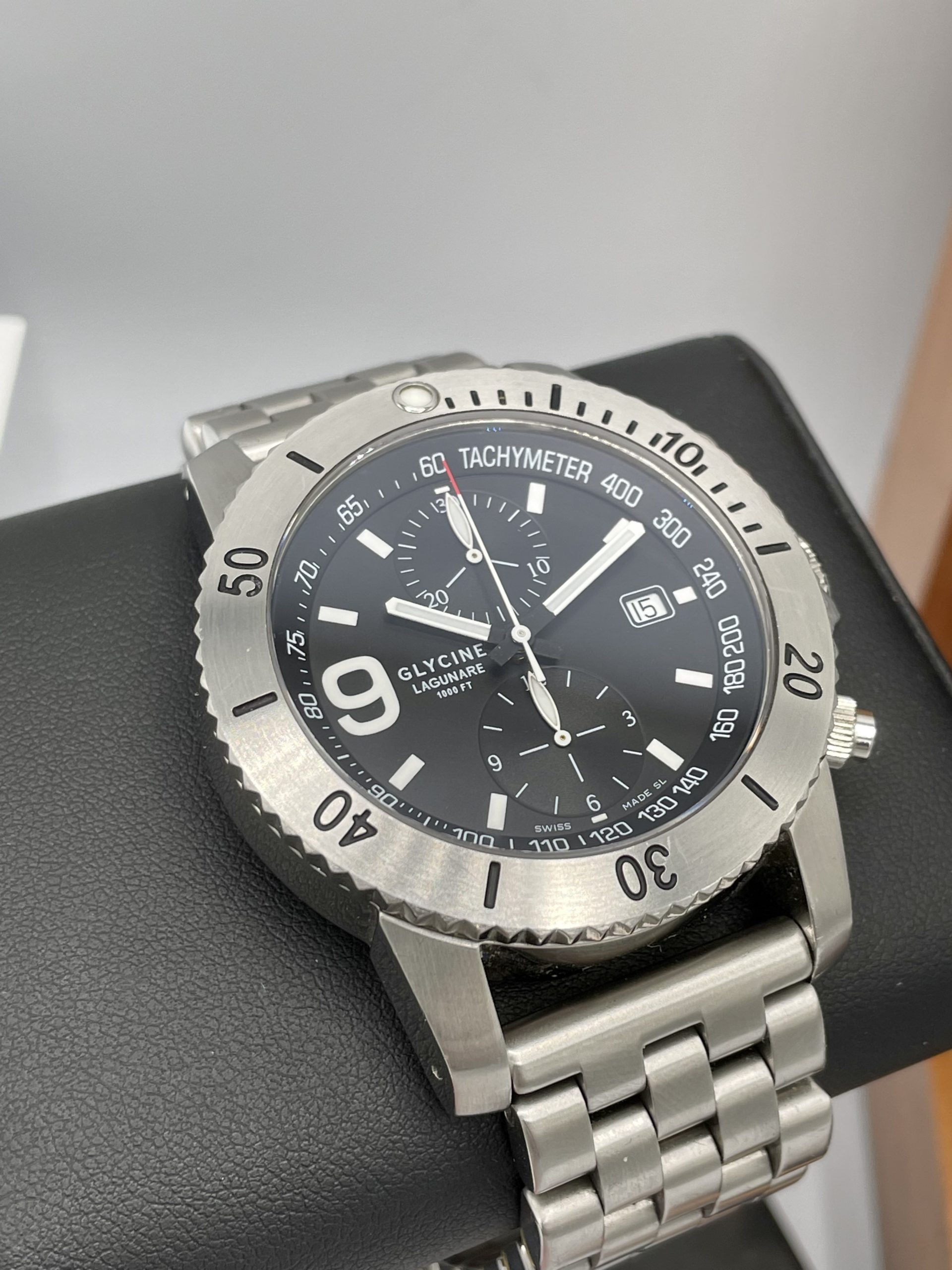 This is a collectors Dream! A very rare complete set Swiss Made Glycine Lagunare “Big 9” Chronograph! Complete special wooden box set with all booklets, warranty card, even the original receipt! Truly special Swiss Valjoux 7750 Automatic Movement! You don’t see many of these around and none more complete or in better condition!