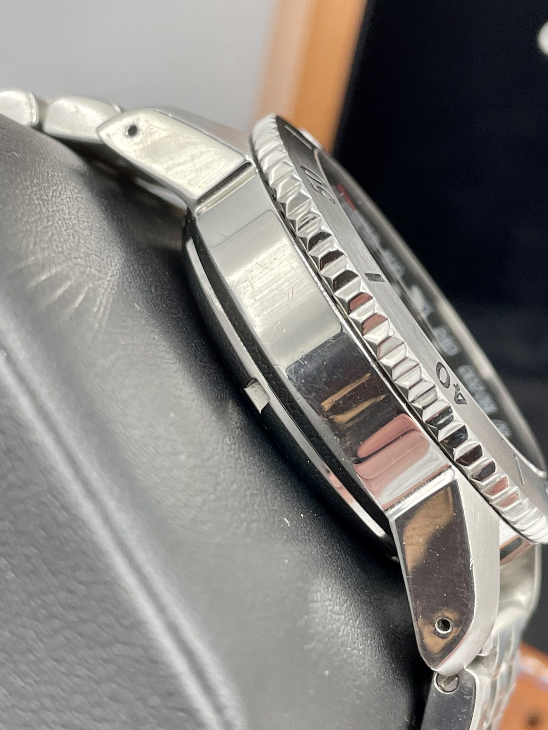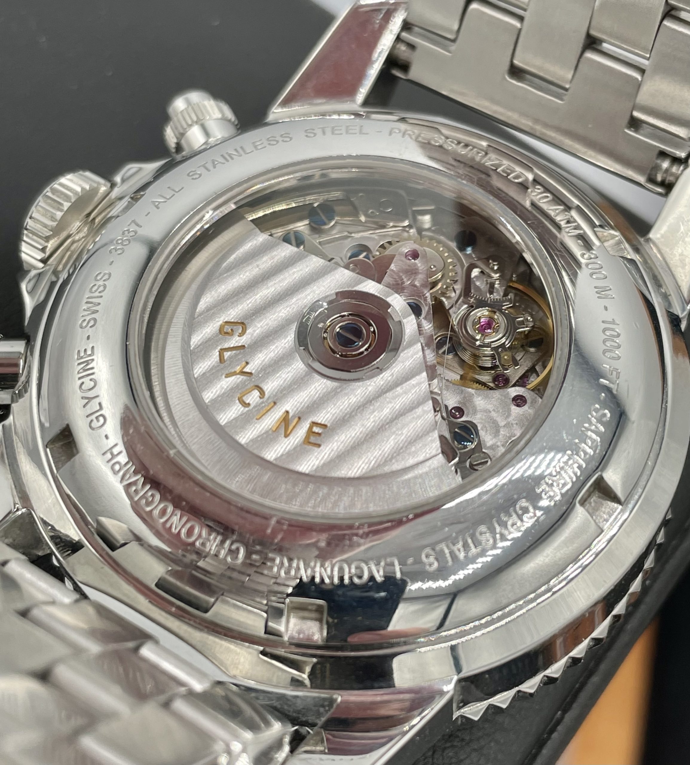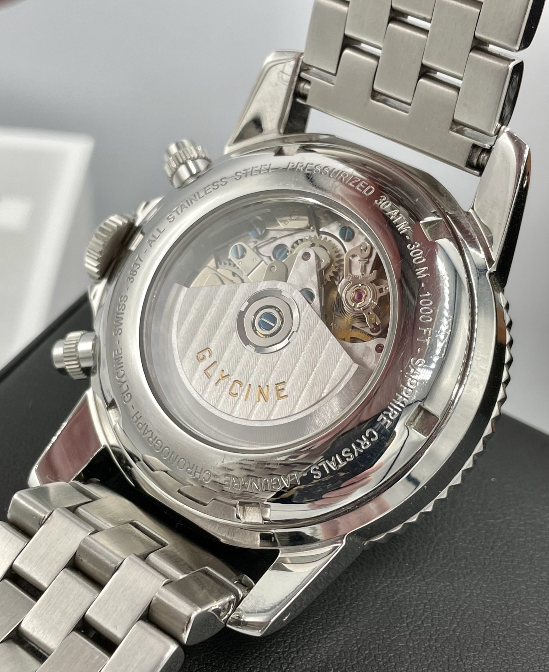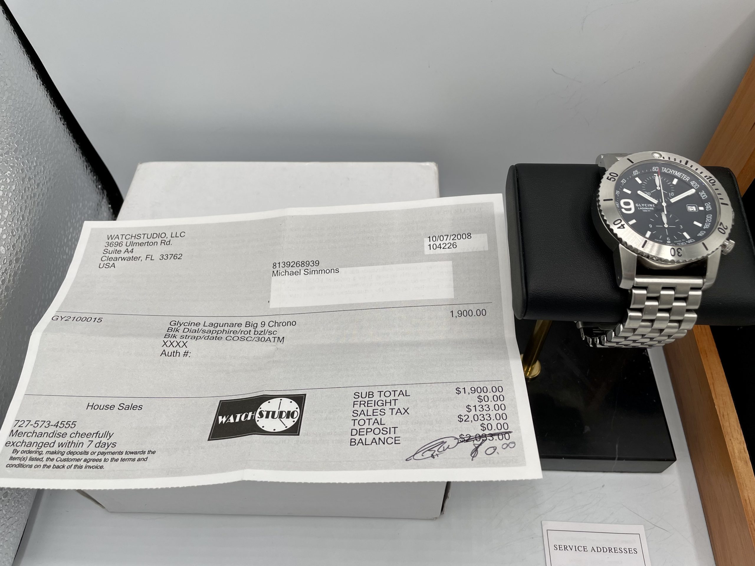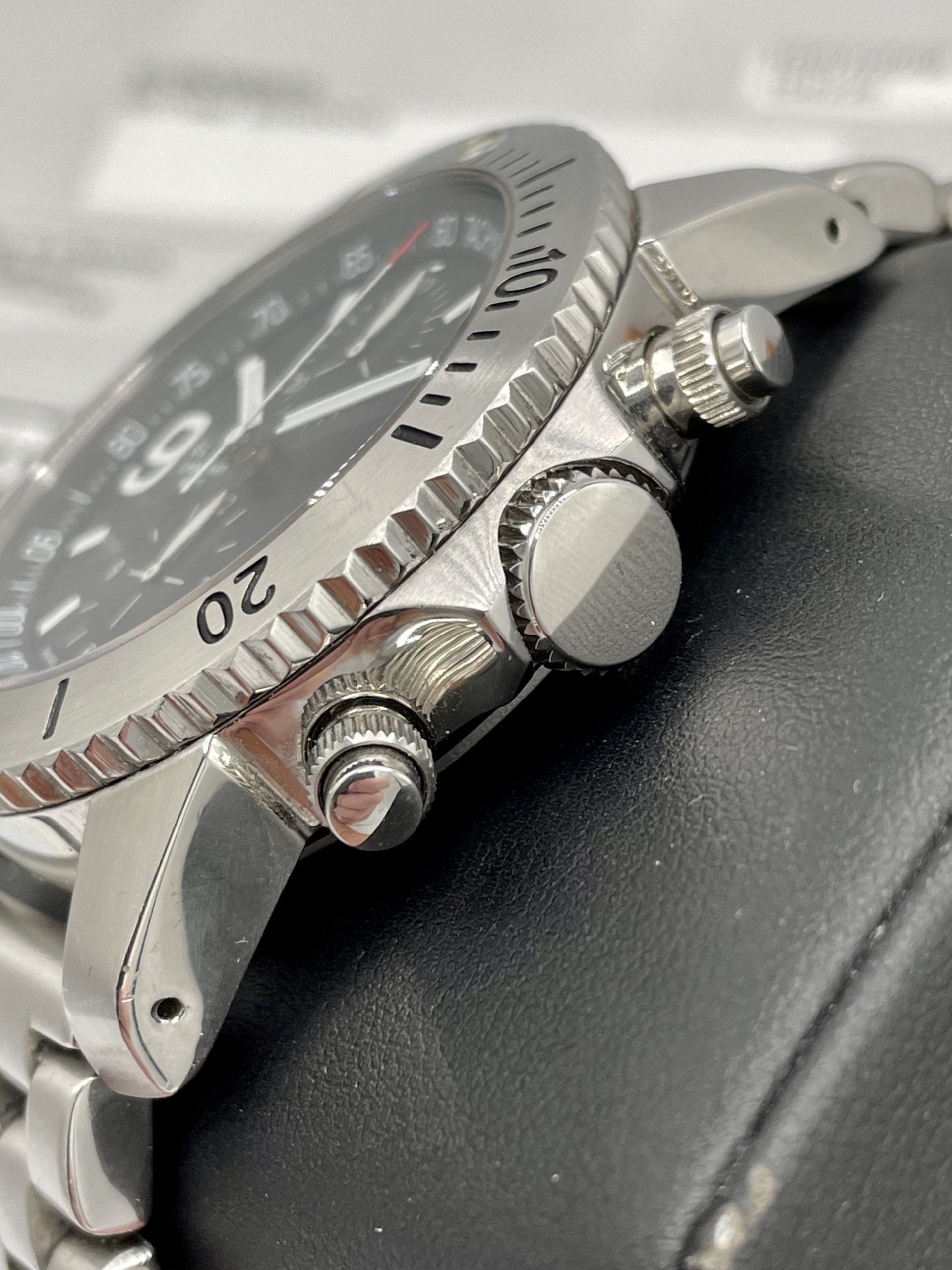 This is a collectors Dream! A very rare complete set Swiss Made Glycine Lagunare “Big 9” Chronograph! Complete special wooden box set with all booklets, warranty card, even the original receipt! Truly special Swiss Valjoux 7750 Automatic Movement! You don’t see many of these around and none more complete or in better condition!