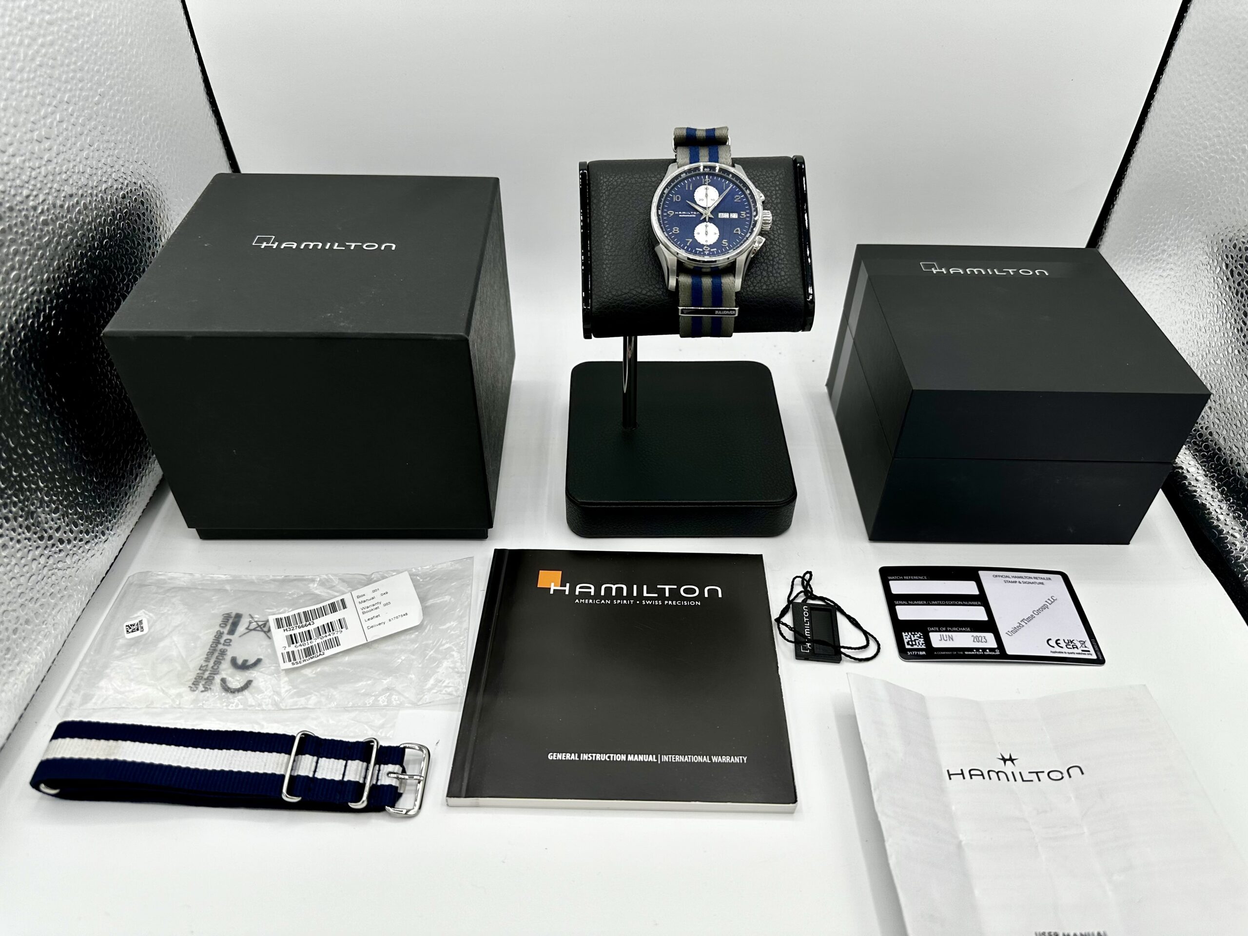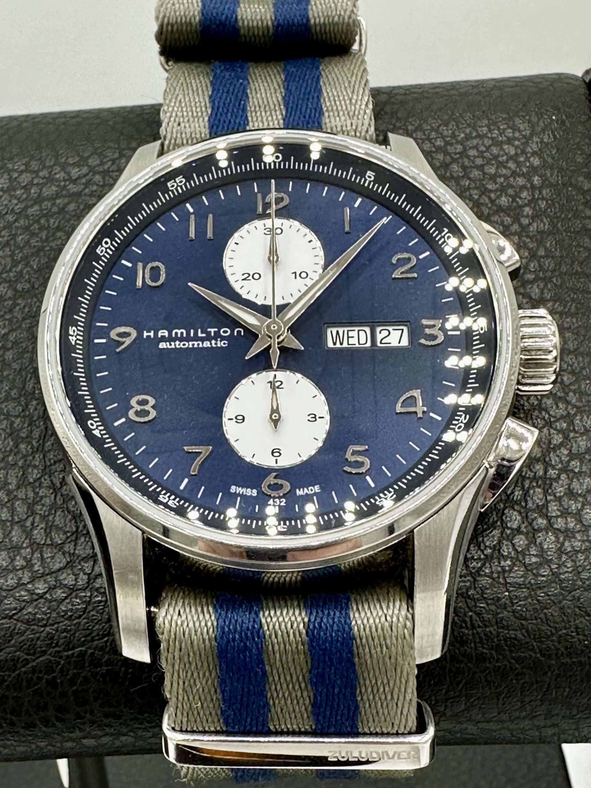 Super cool Hamilton Jazzmaster Maestro Chrono!! This is the Blue Panda Dial Automatic Chronograph with in-house Swiss Caliber Automatic movement that features an 60 Hour Power Reserve! Brand New June 2023, A gorgeous watch in excellent condition both mechanically as well as cosmetically!