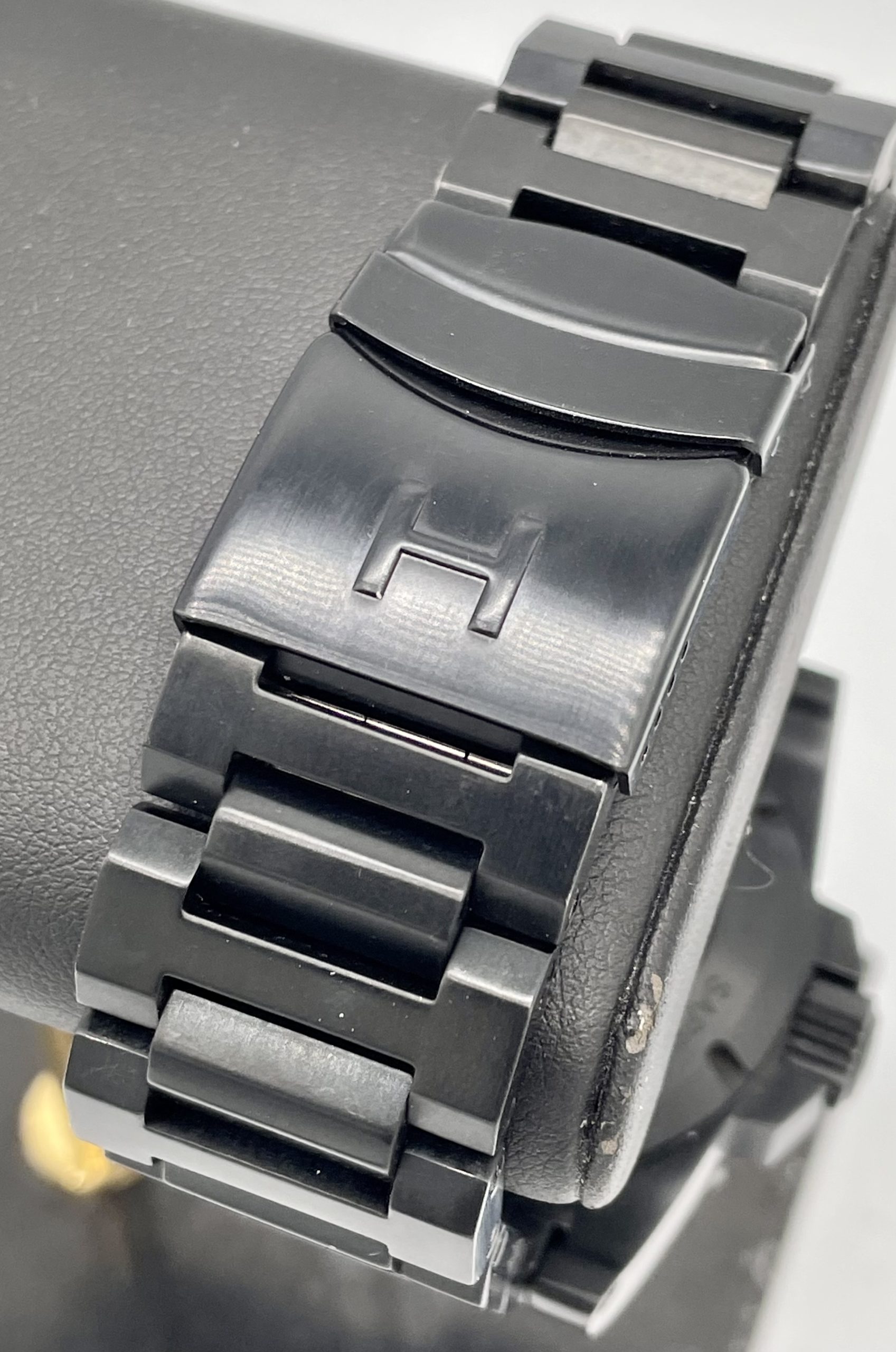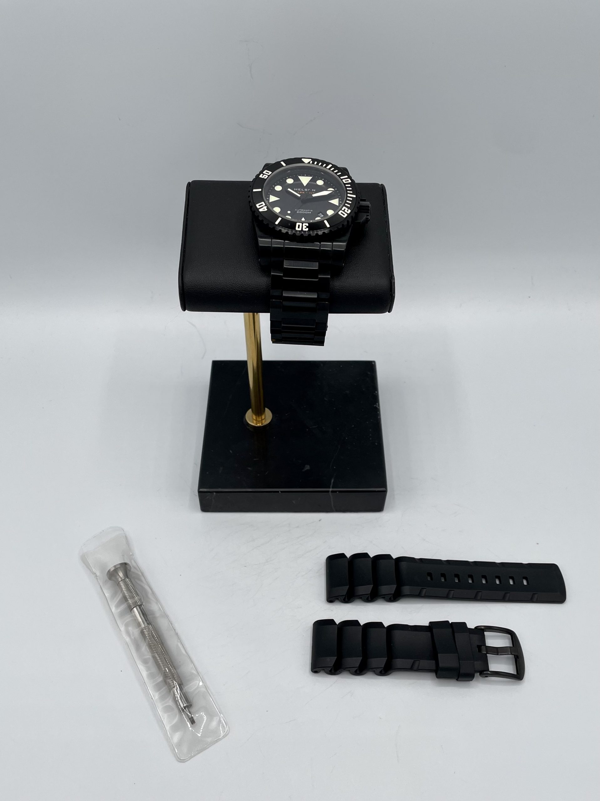 STRAP/BRACELET: – 2 – Original Helson Black DLC Coated Stainless Steel Bracelet with all links & Additional Helson Black Rubber dive strap with Black Steel buckle.