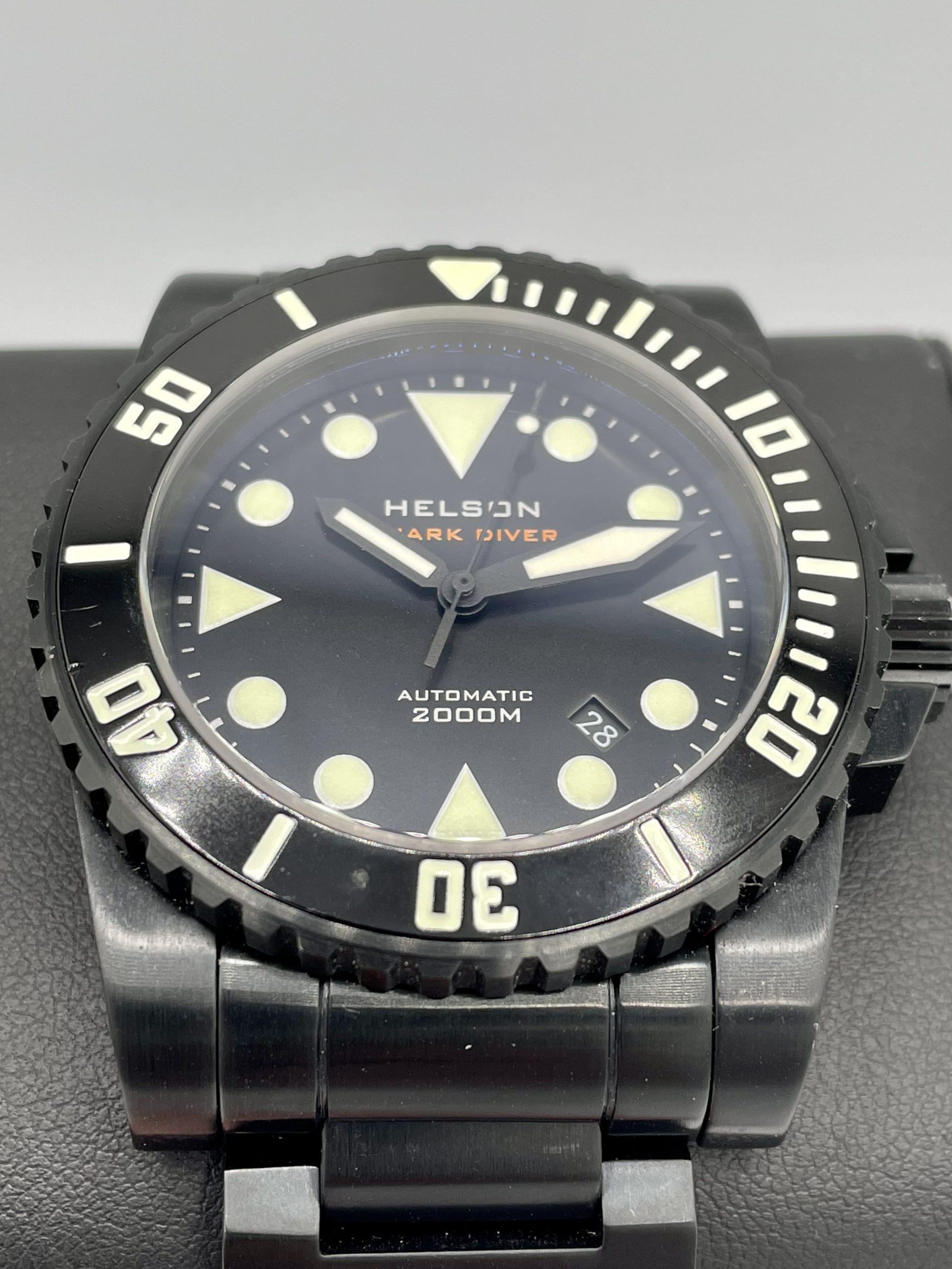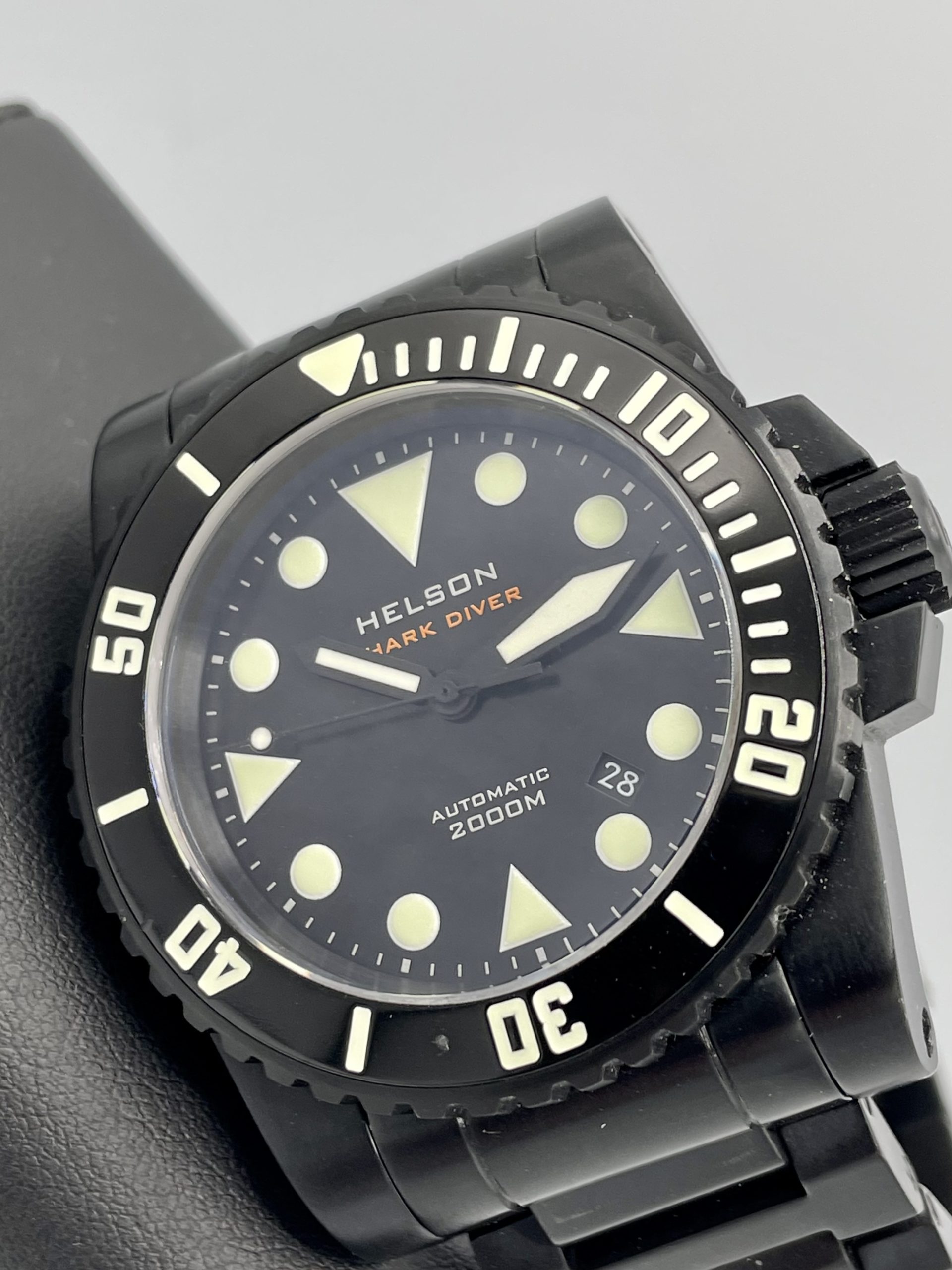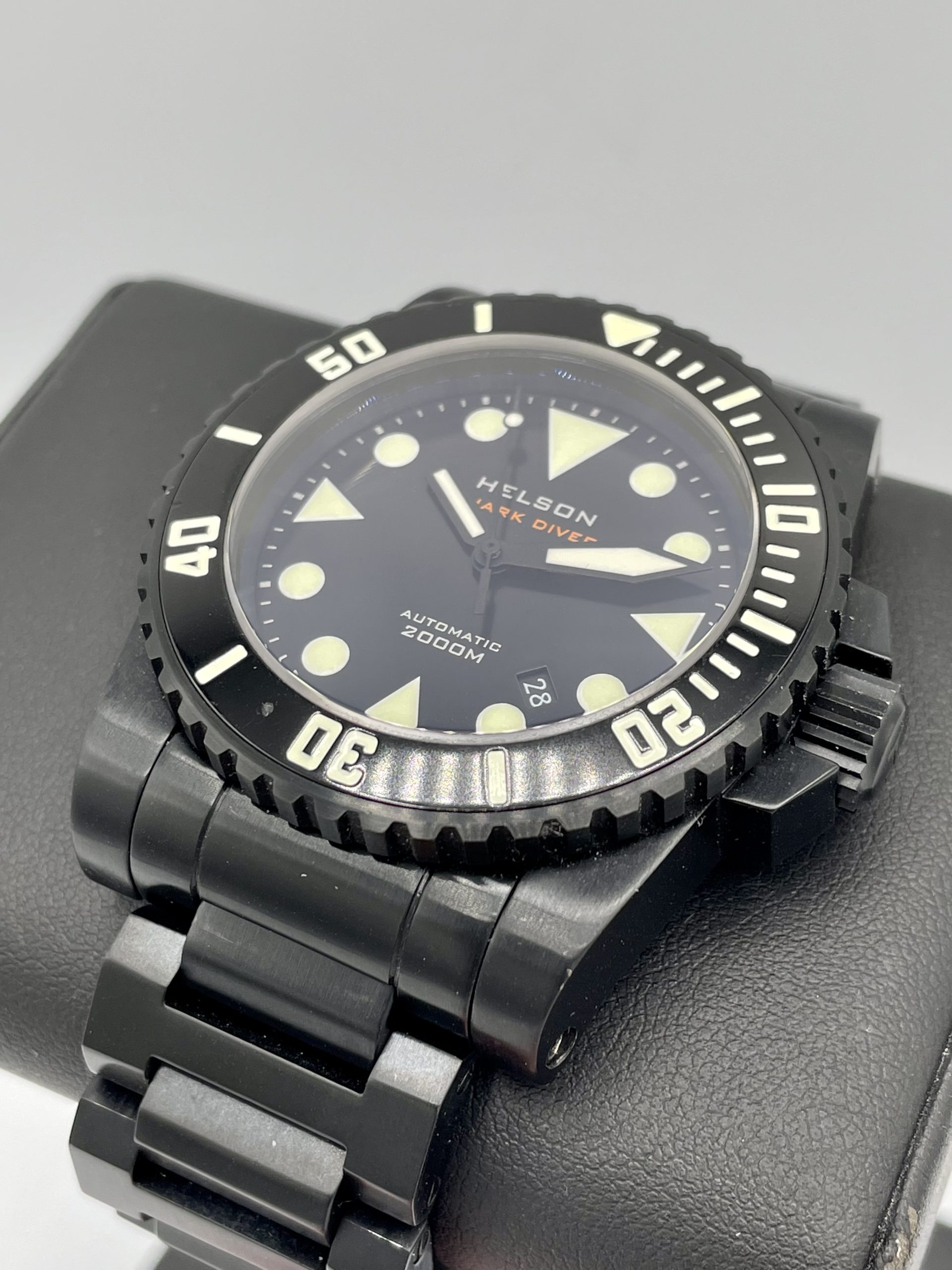 As-New Helson Shark Diver 45 Black DLC Coated Stainless Steel 2000m Automatic! Sold out & Discontinued from Helson!…Comes on the very rare Helson Black Steel bracelet & includes the Helson Black Rubber strap with black steel buckle.