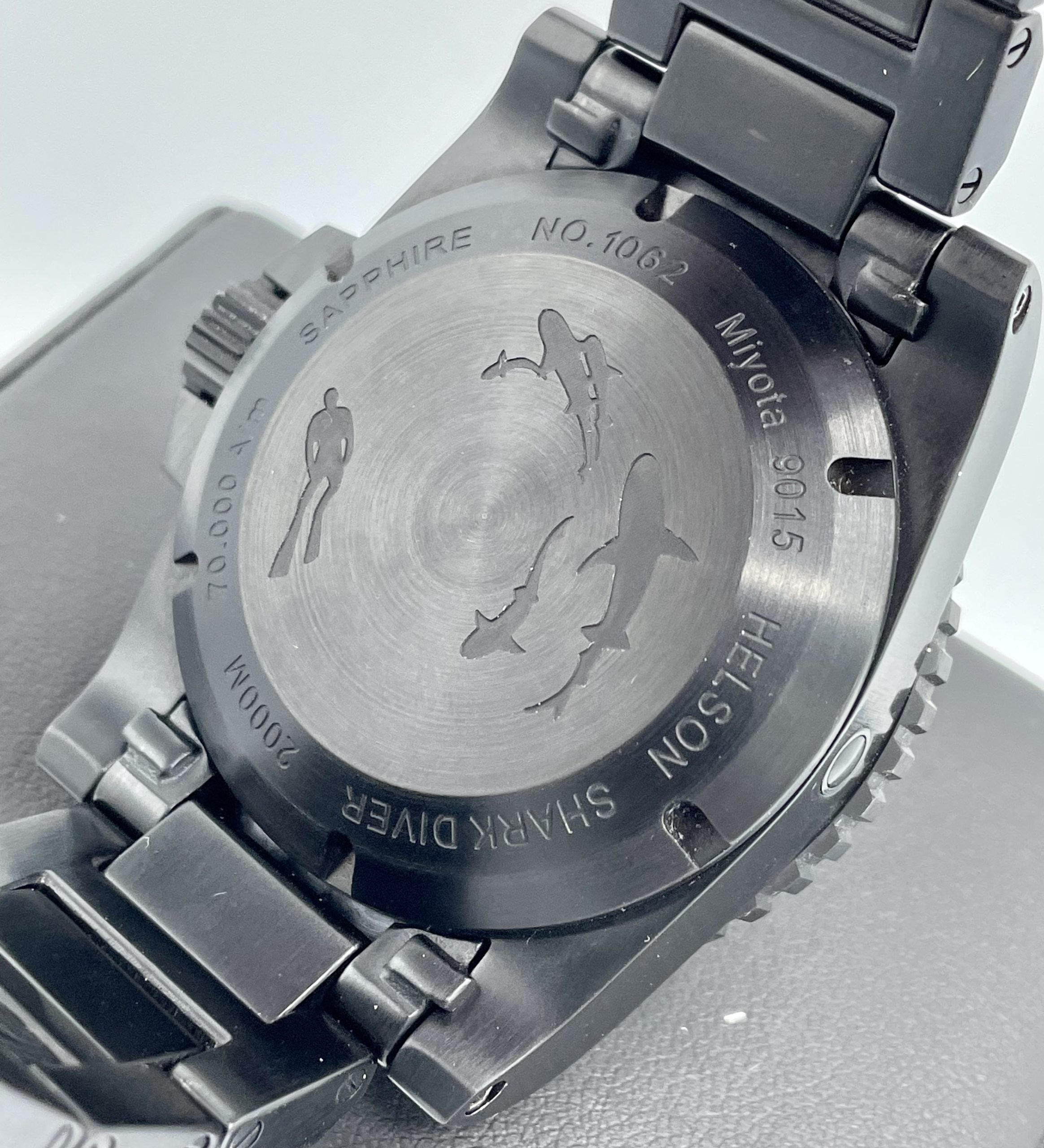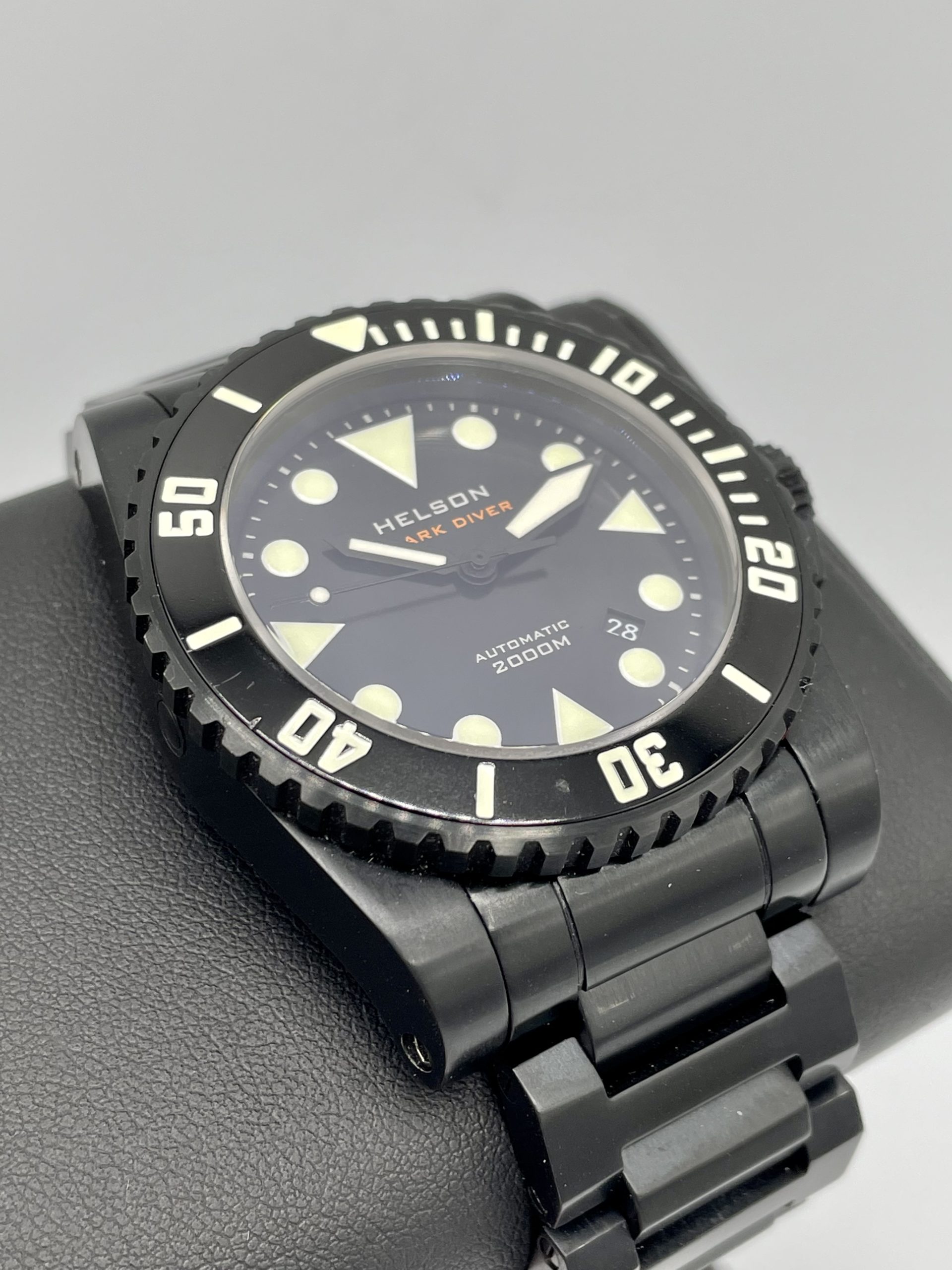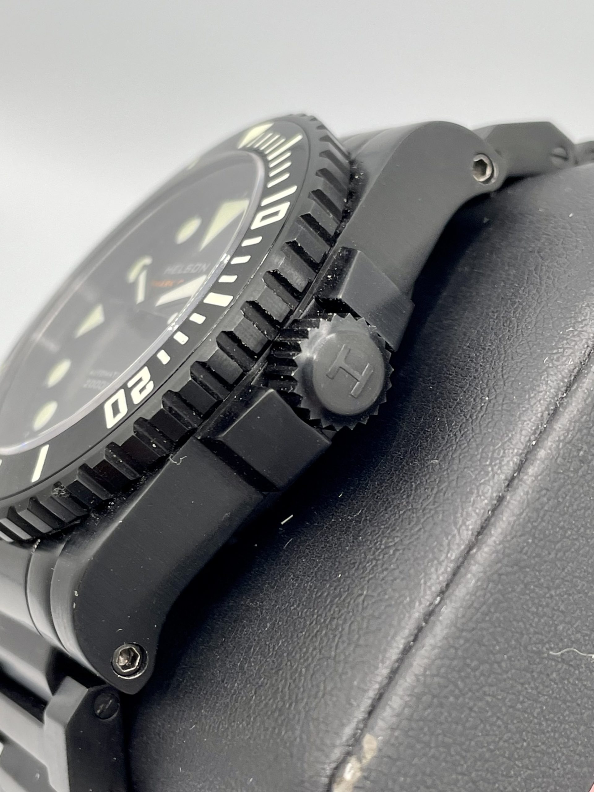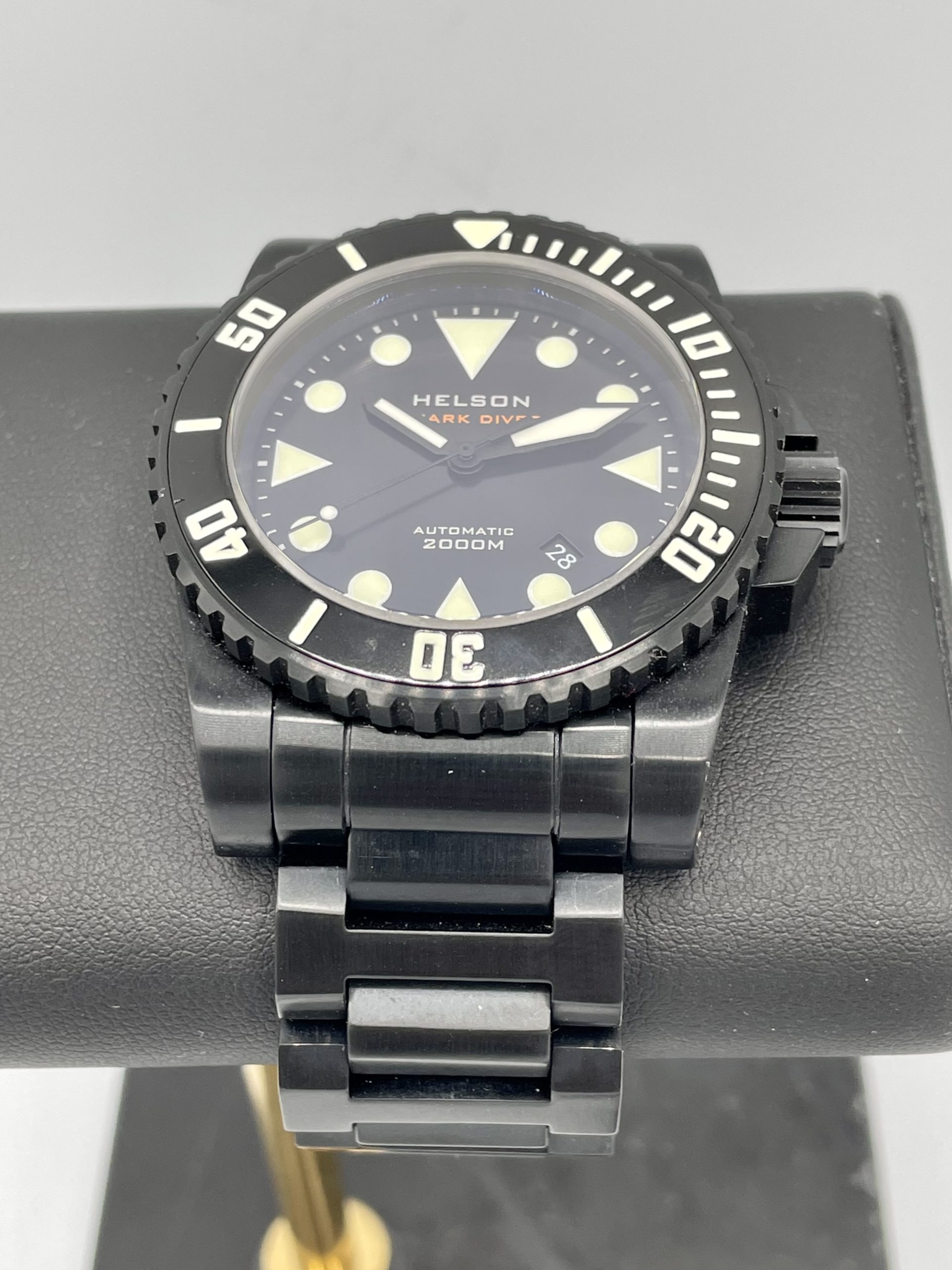 As-New Helson Shark Diver 45 Black DLC Coated Stainless Steel 2000m Automatic! Sold out & Discontinued from Helson!…Comes on the very rare Helson Black Steel bracelet & includes the Helson Black Rubber strap with black steel buckle.