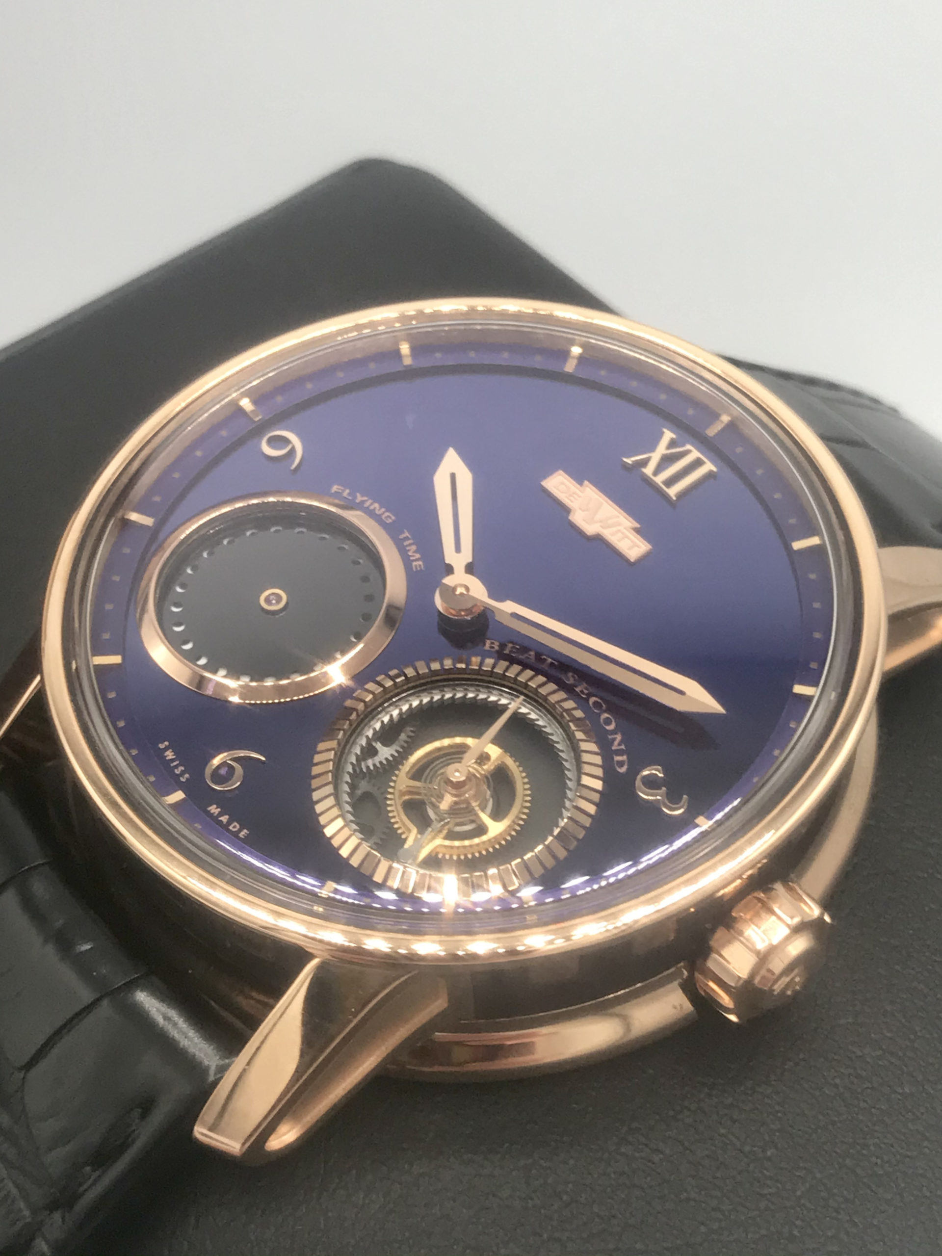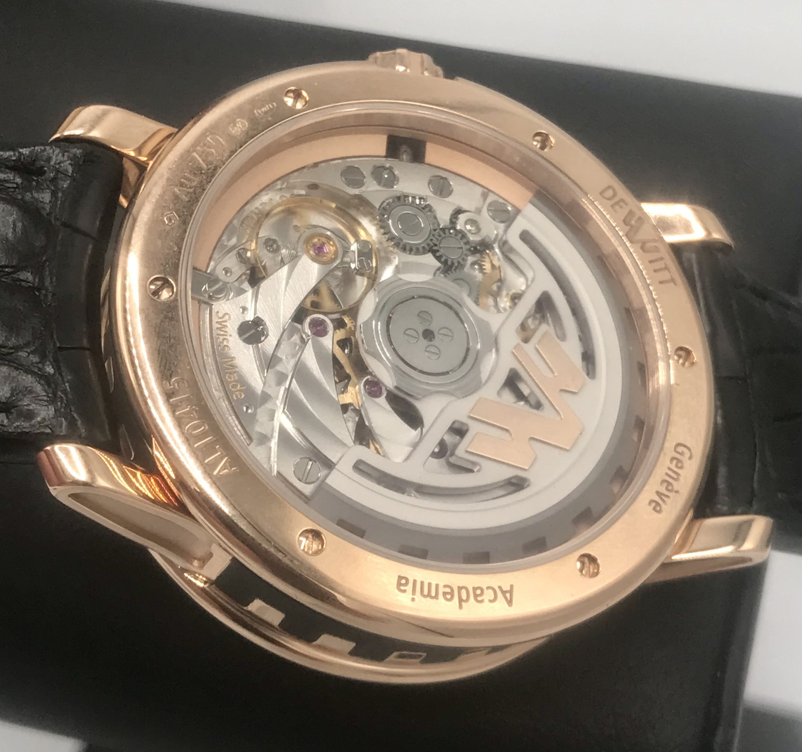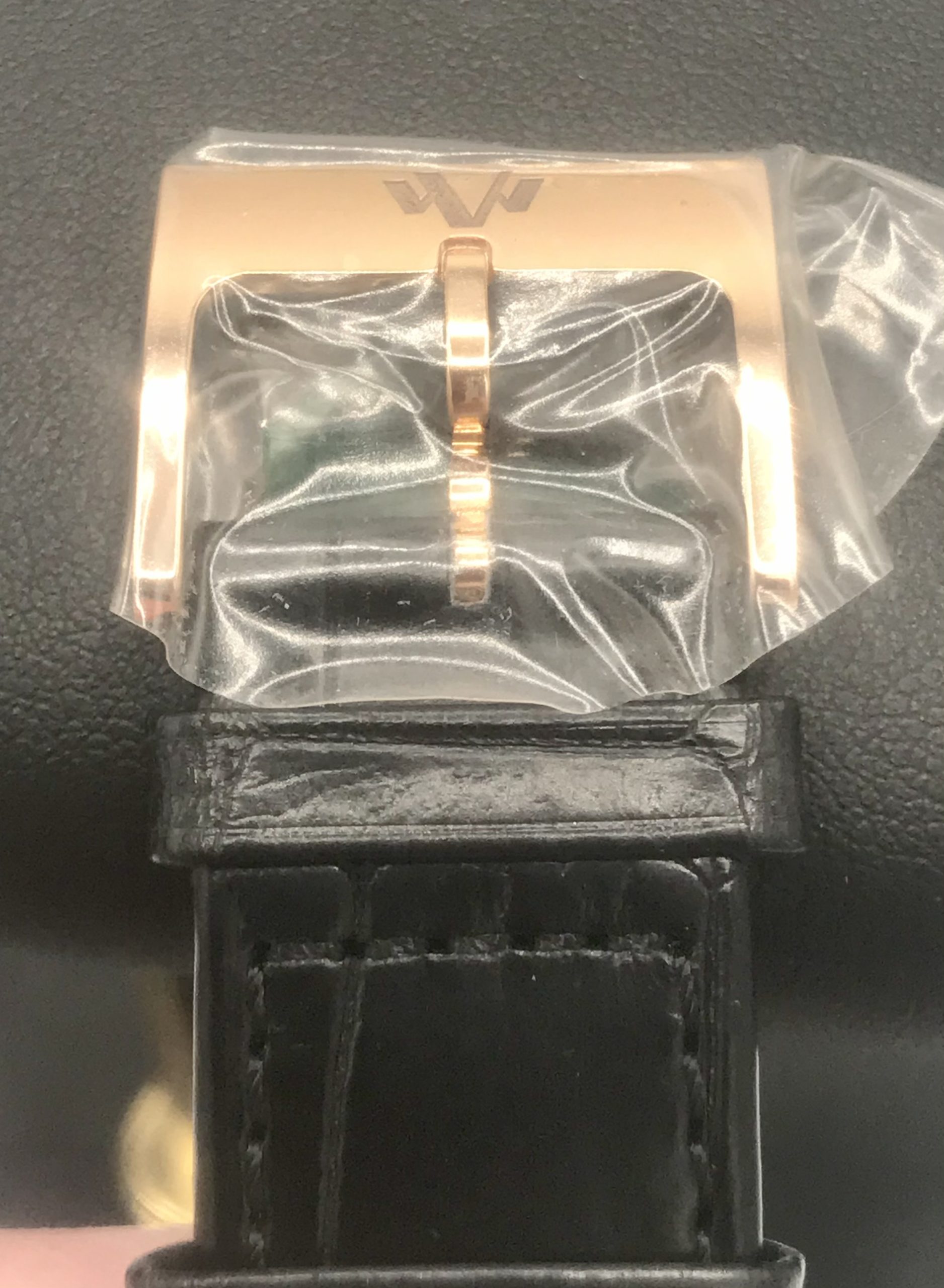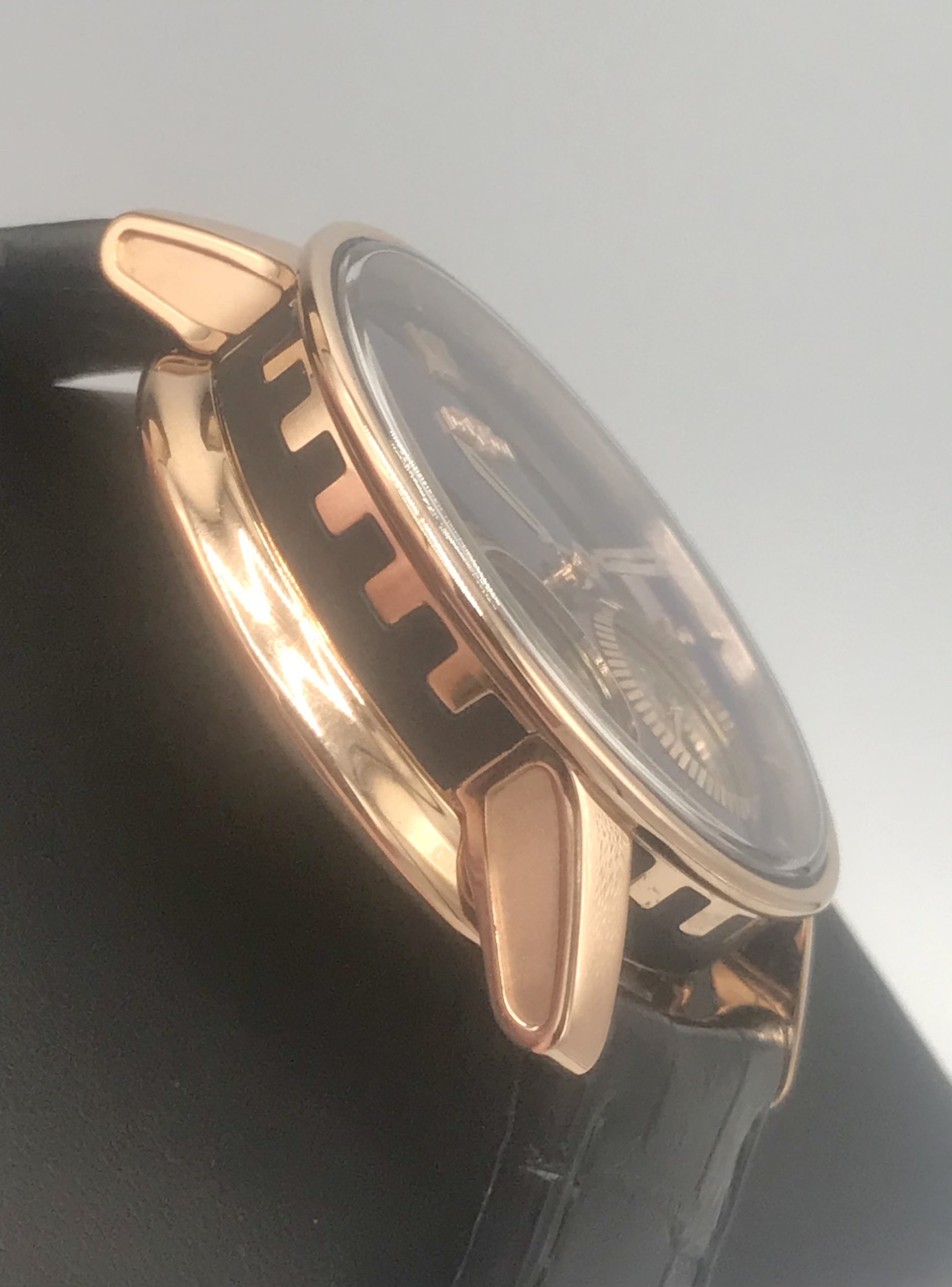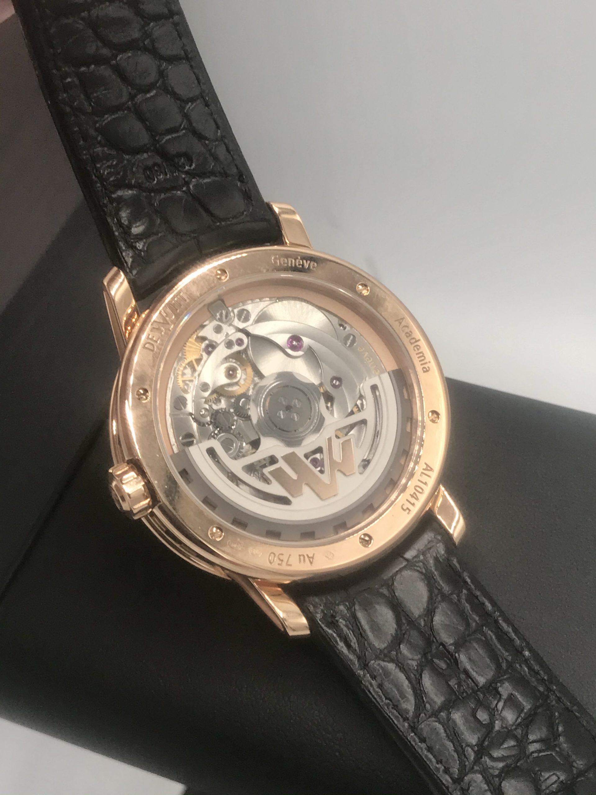 STRAP/BRACELET: – Original Brand New DeWitt black leather Strap with signed 18k Rose Gold buckle