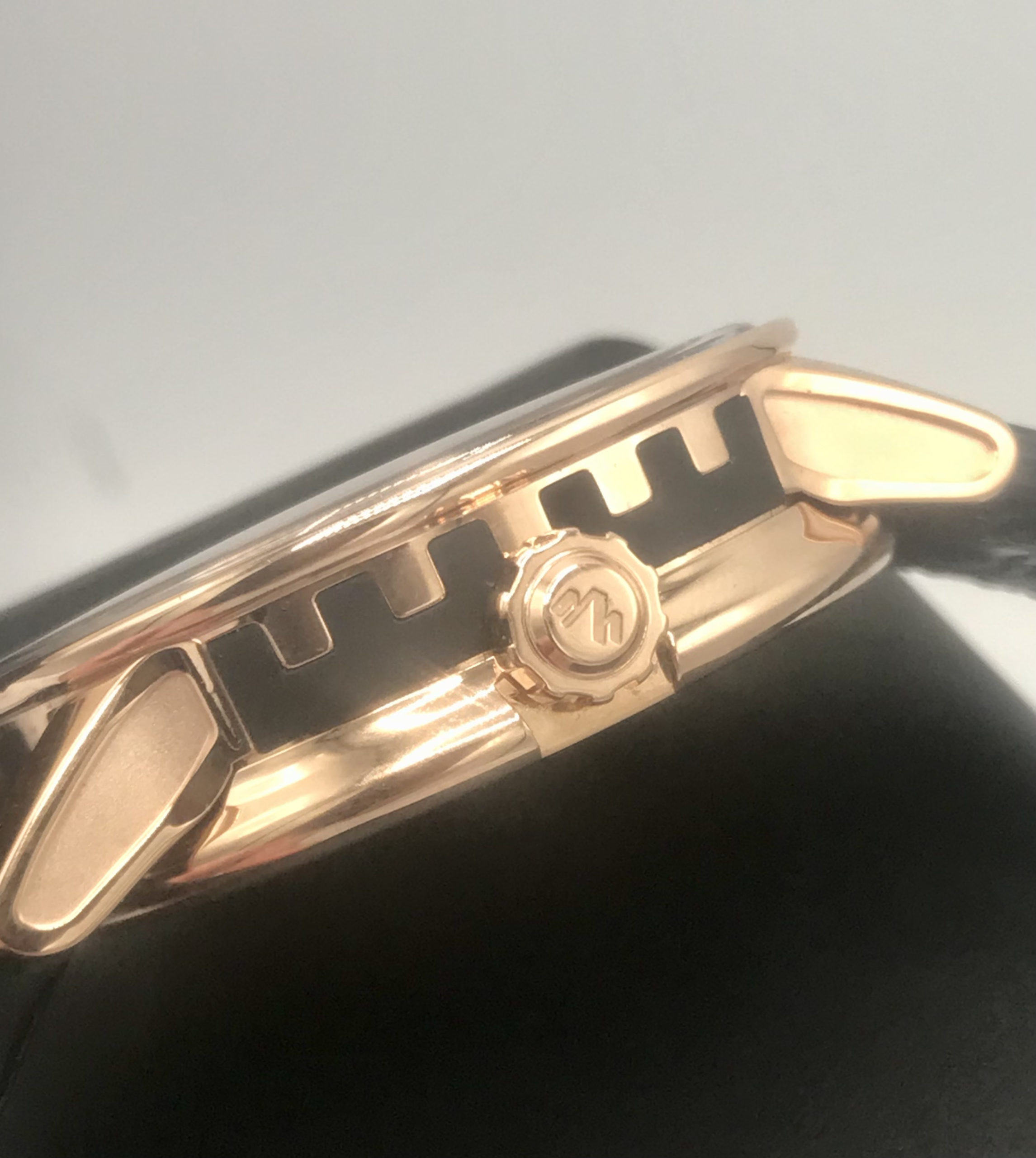 The DeWitt Academia Out Of Time comes only in 18k rose gold (for now) in a 42.5mm wide case. That actually makes it one of the smaller DeWitt watches out there (for men). The case is 12.85mm thick, and there is black rubber inlaid into the side of the case to further emphasize the “DeWitt imperial column” motif that is there. Or you could see the side of the case as looking like a row of angular (golden) robot teeth. Weird or not, I like details like that as well as the detailing and various finishing on the lugs.