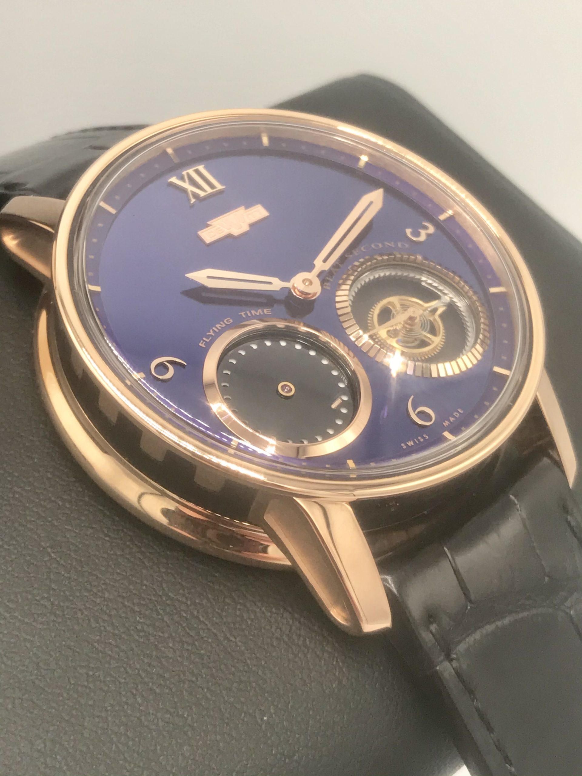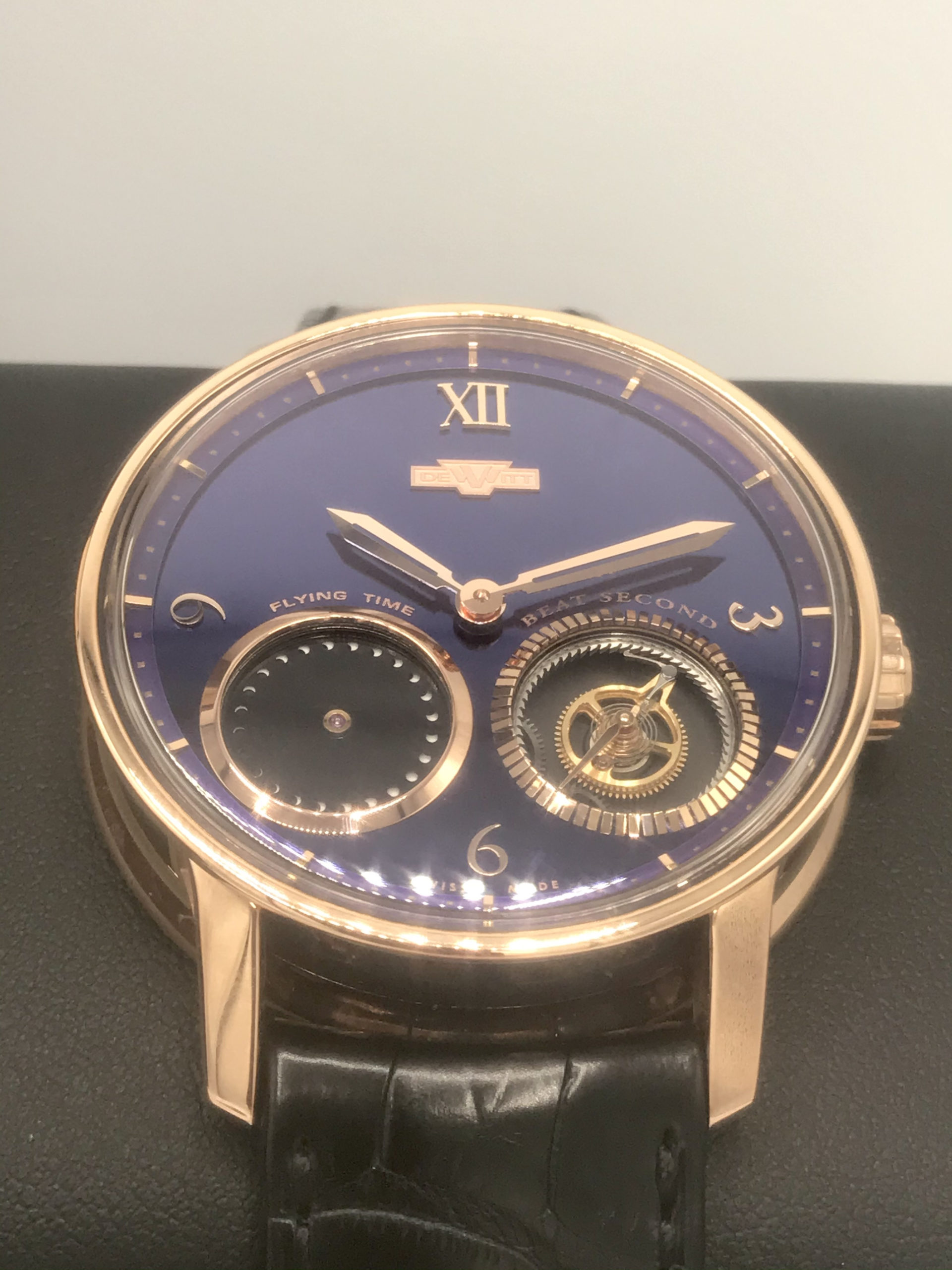 To the left of the beat second hand is something else interesting. This is the “flying time” dial and it is really a sort of foudroyante hand. Some watches that have hands that make a full revolution each second, and we refer to those as “flying hands.” The reason is that they appear to move so quickly, watchmakers say they are “flying.” Rather than a traditional hand, DeWitt developed two overlapping discs. The discs have small holes, and when the upper disc moves, it creates a unique animation on the dial.