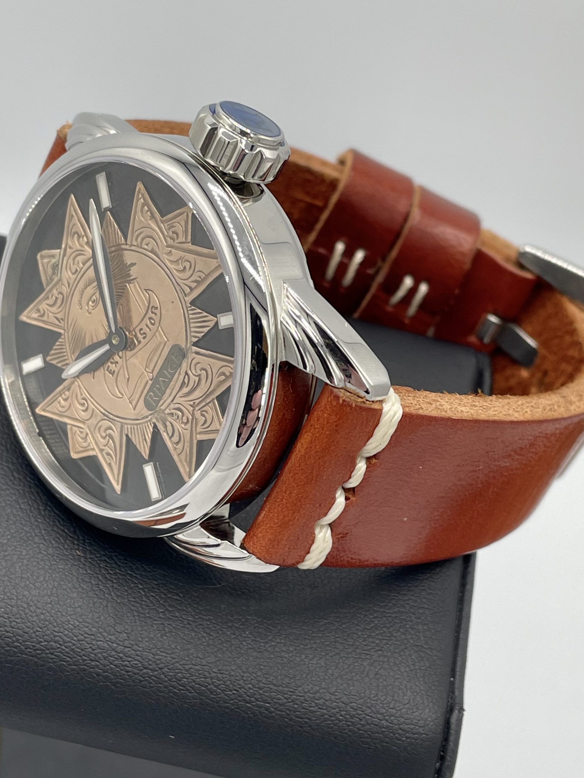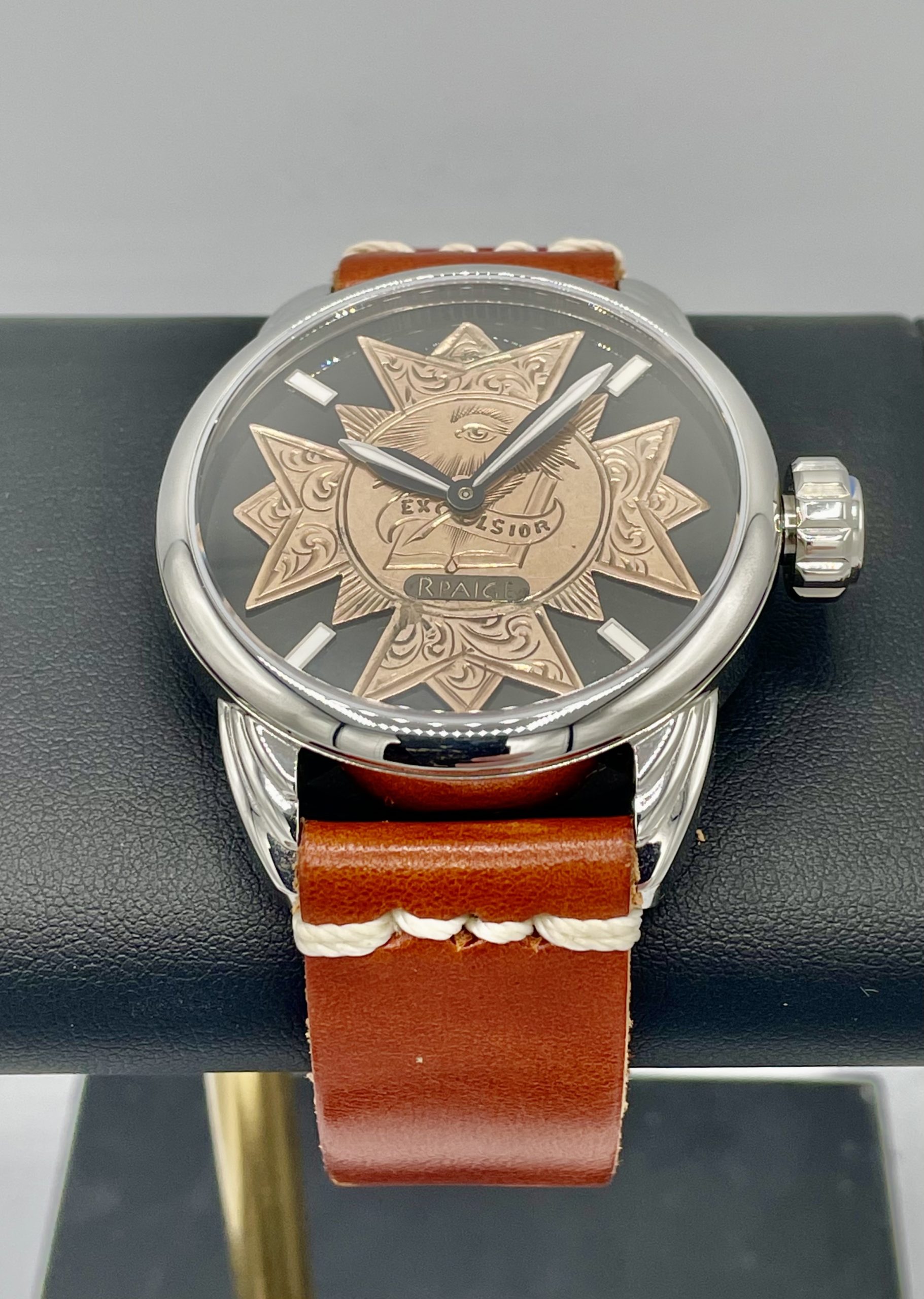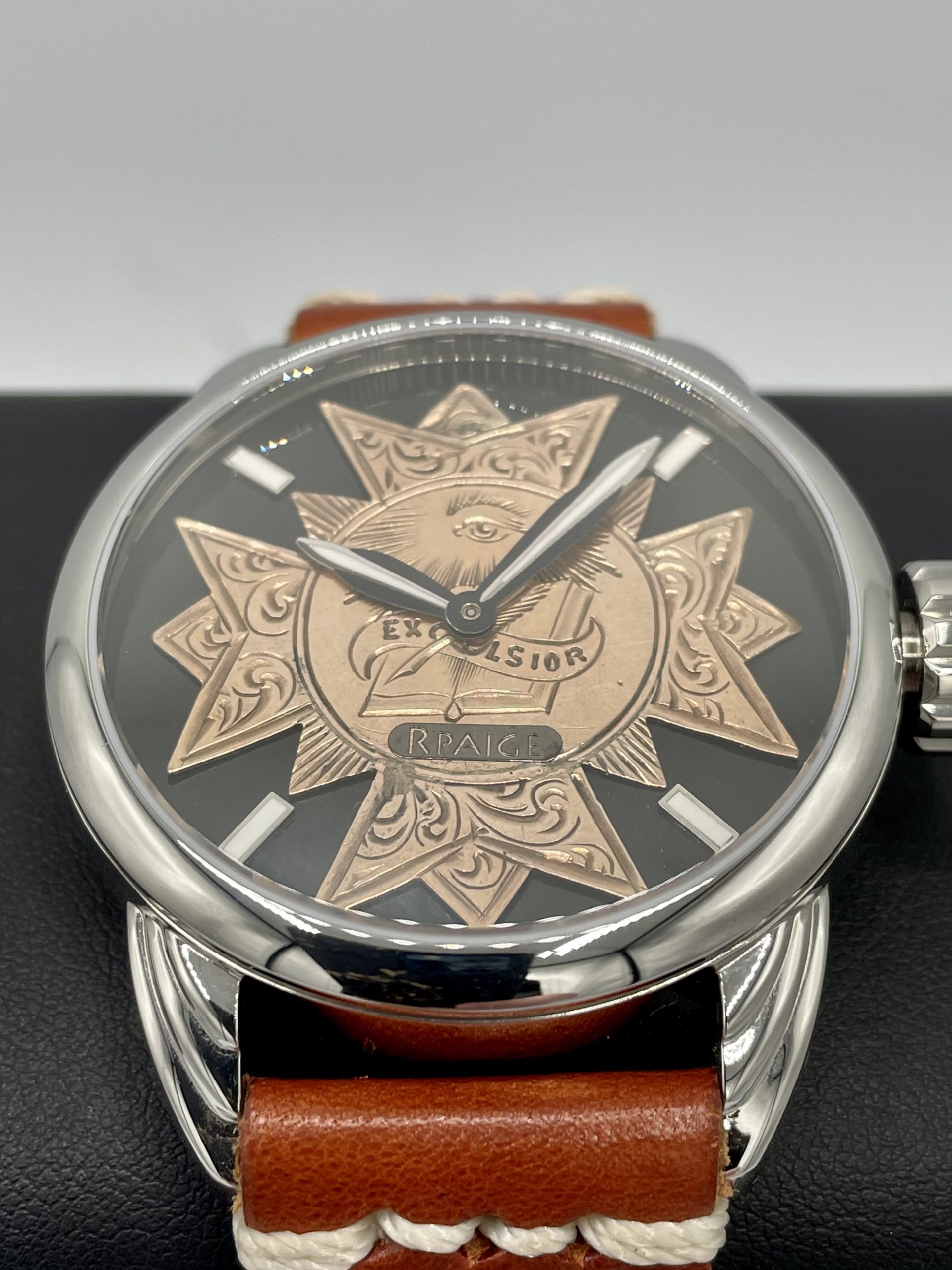 Dial made from 14kt rose gold Award medal. Hand engraved with the word “Excelsior”, and an all seeing eye, looking over a book. The back of the medal (not visible) is engraved to the recipient and awarded in 1880. luminous markers. Hands are Rpaige designed “Chrysler Building” hands with luminous.