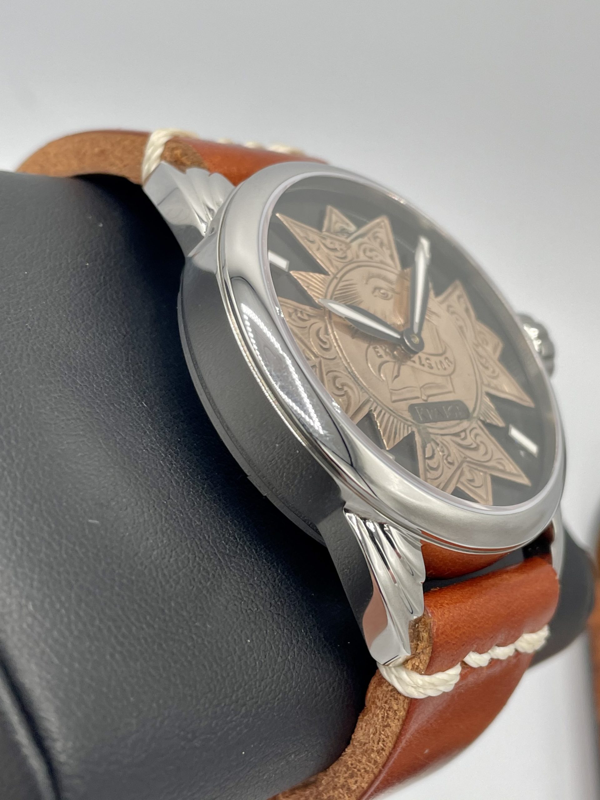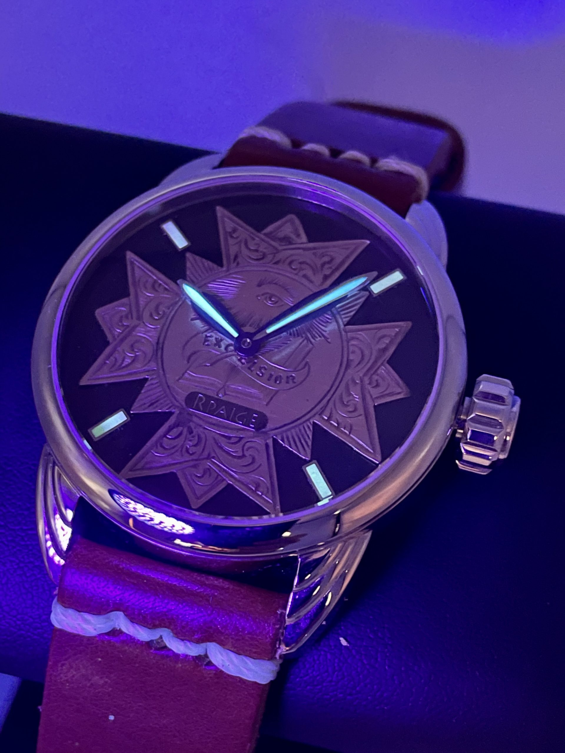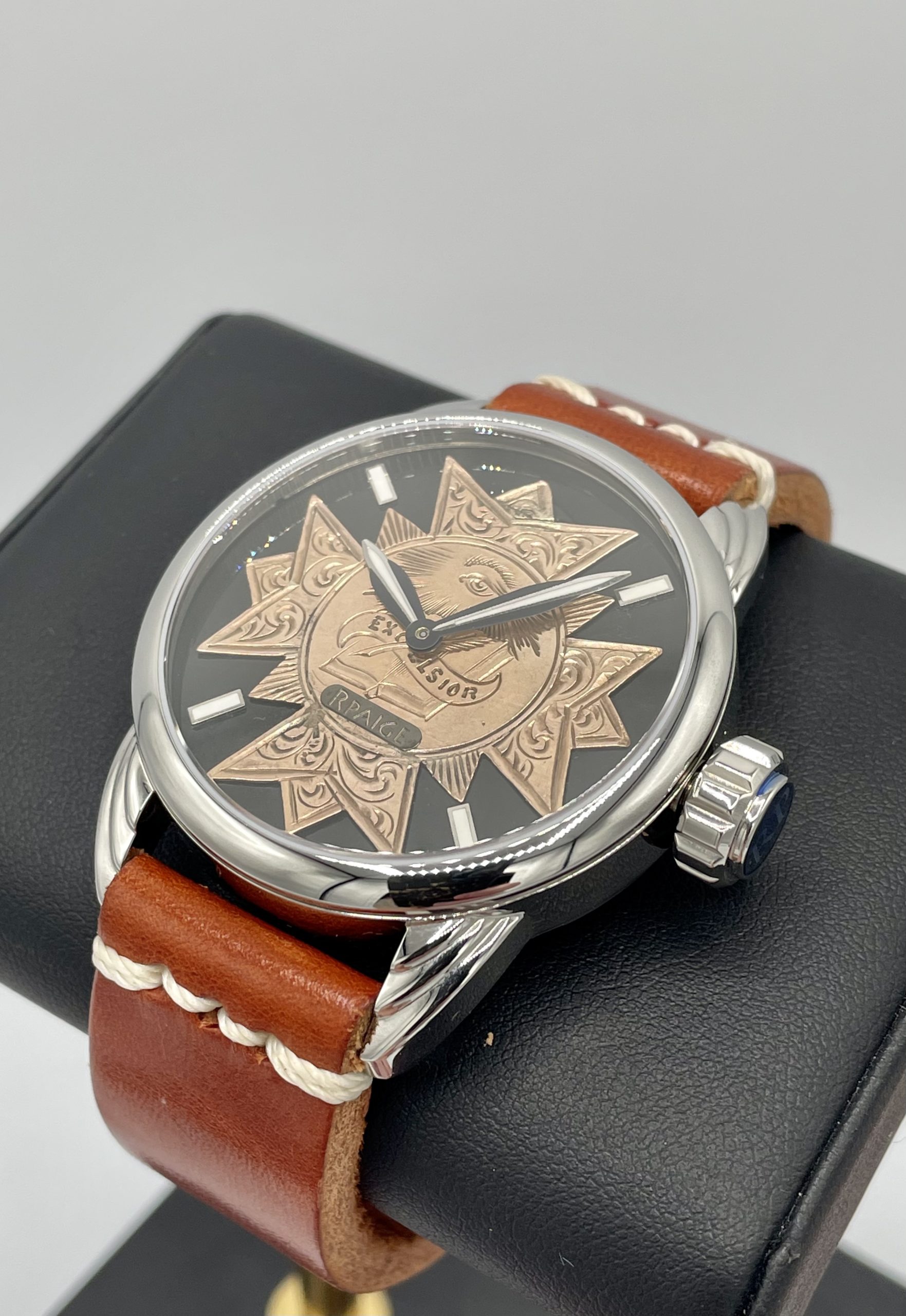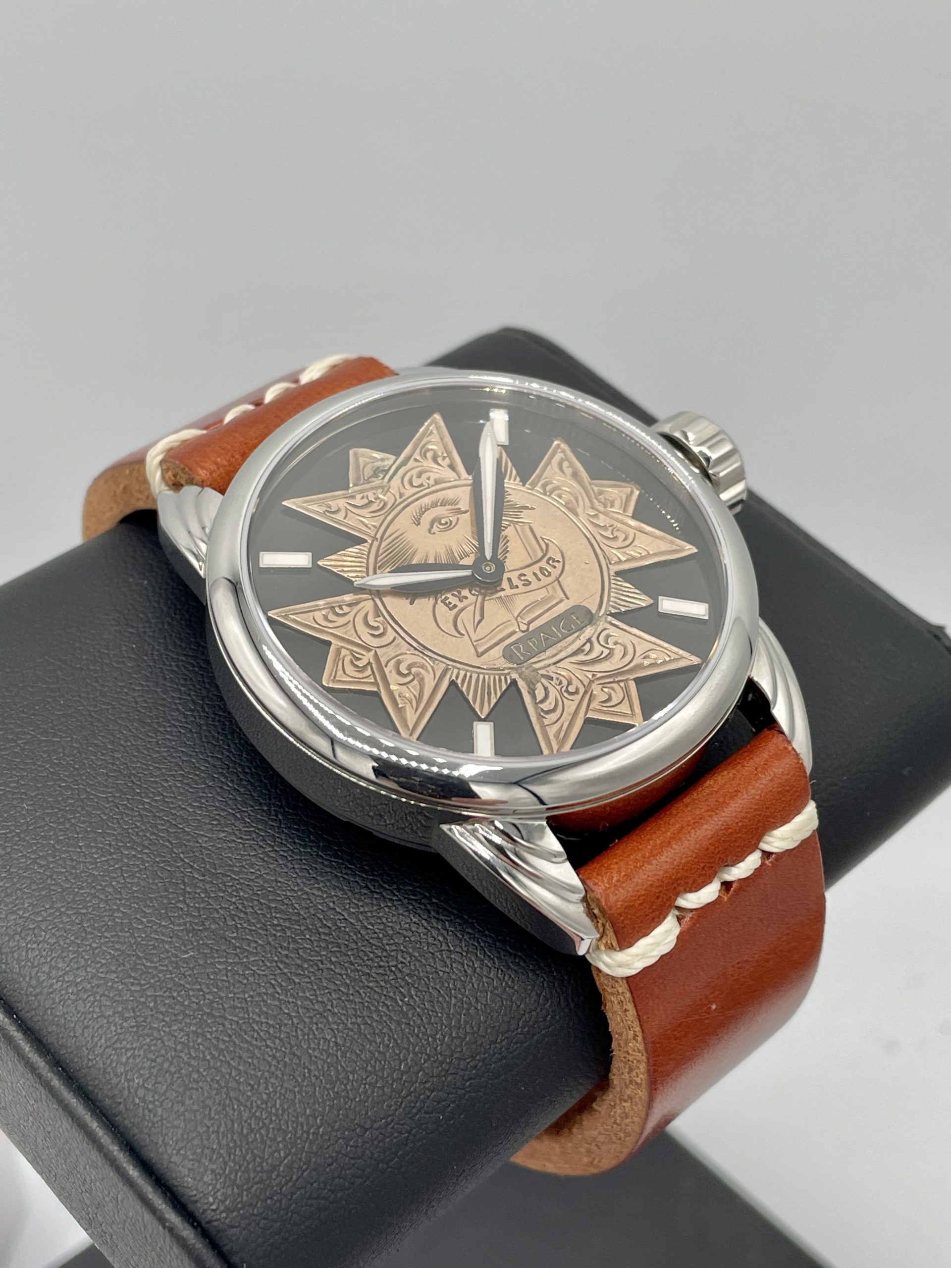 Dial made from 14kt rose gold Award medal. Hand engraved with the word “Excelsior”, and an all seeing eye, looking over a book. The back of the medal (not visible) is engraved to the recipient and awarded in 1880. luminous markers. Hands are Rpaige designed “Chrysler Building” hands with luminous.