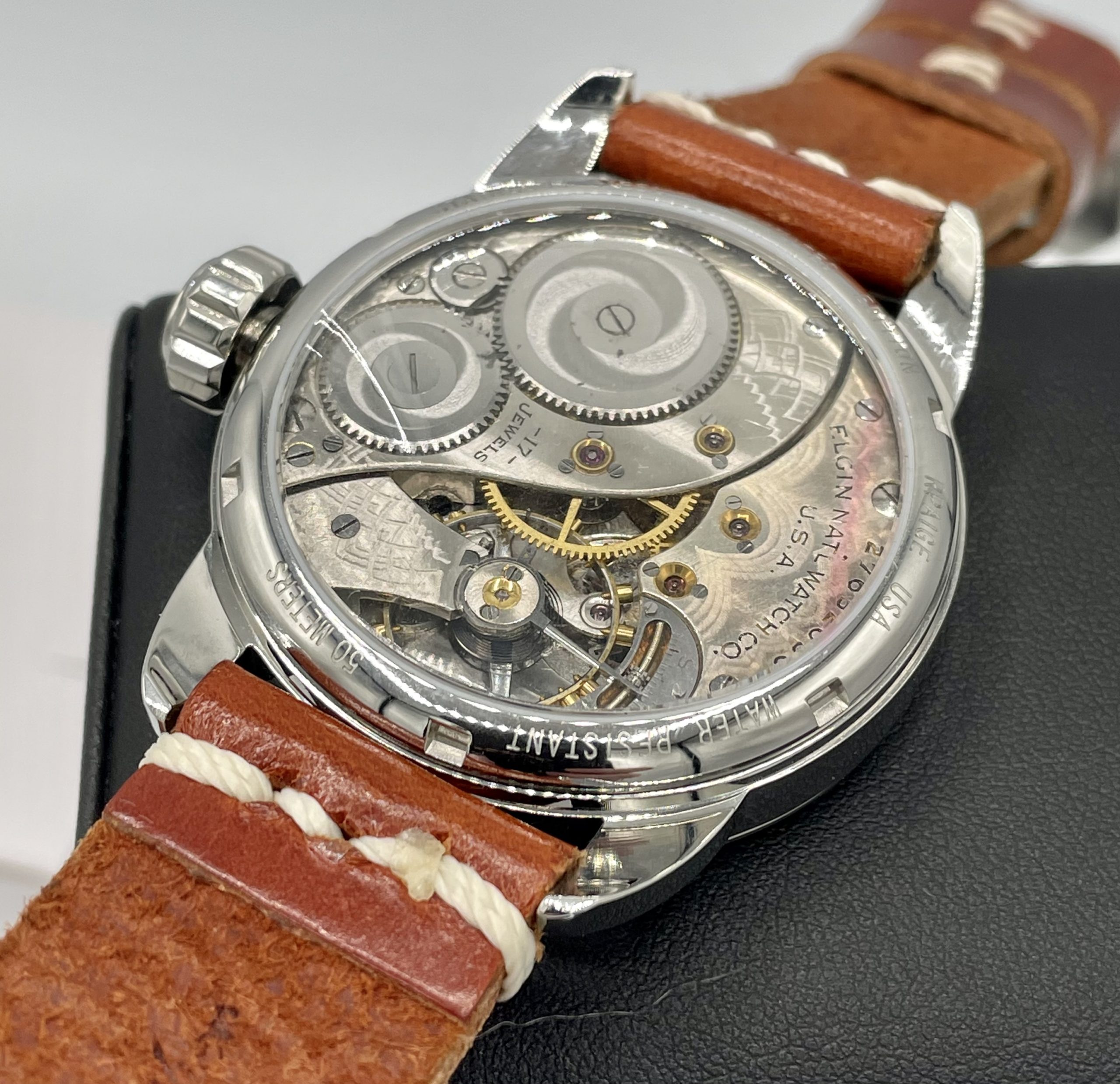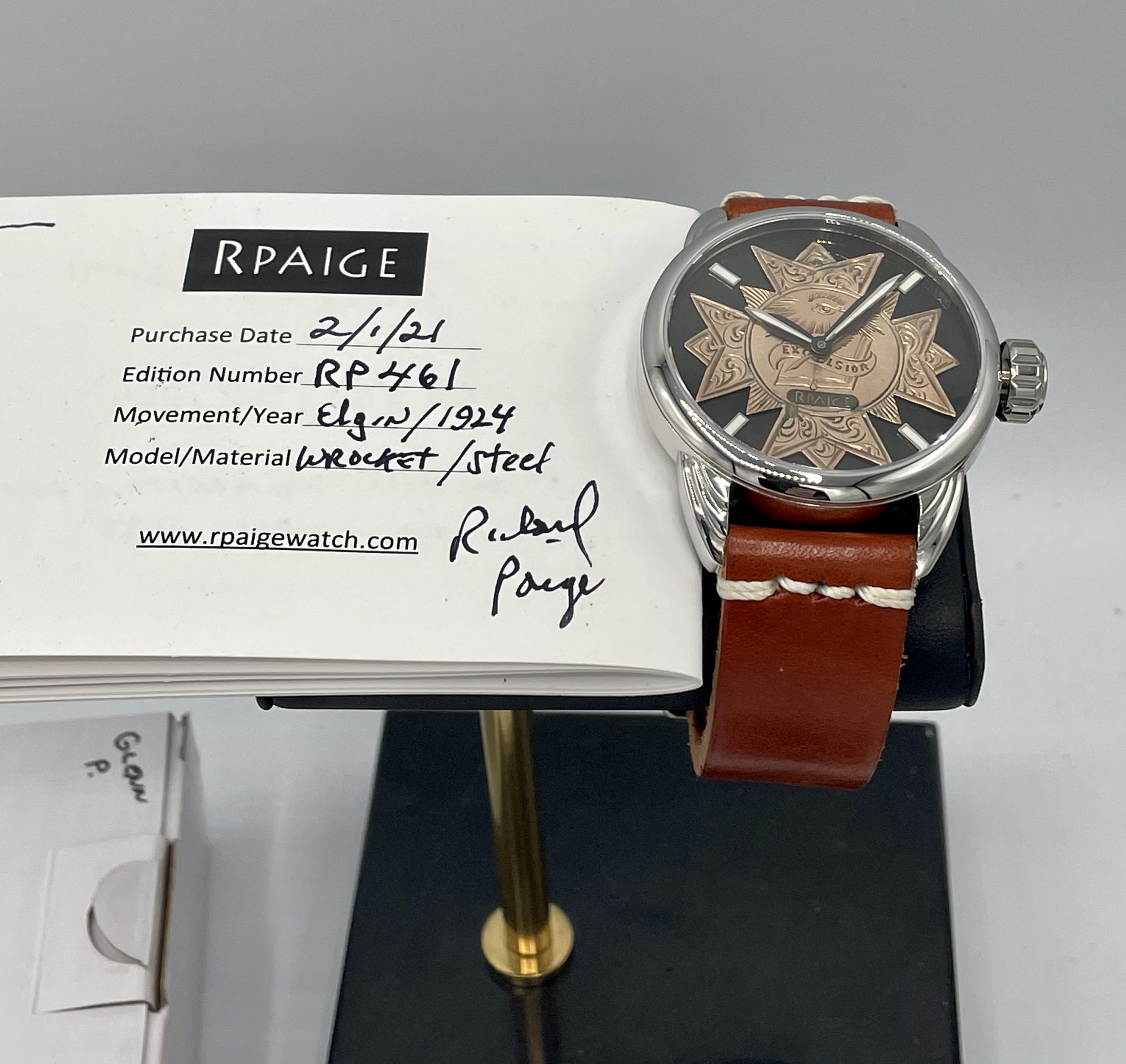 The limited edition Rpaige Wrocket watch is a play on words. The watch uses an antique/vintage “12 size” (39.78mm) American pocket watch movement made by either Elgin of Illinois, or Waltham of Massachusetts.