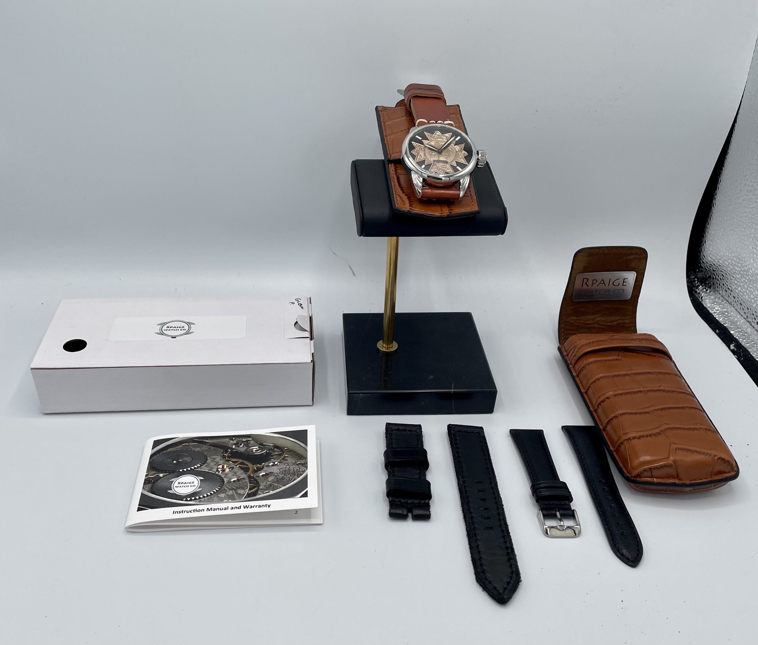 Steel with Convex sapphire crystal front, diamond coated glass display back. Water Resistant to 50 meters (150 feet). Rpaige Logo crown. This is a one of a kind watch.