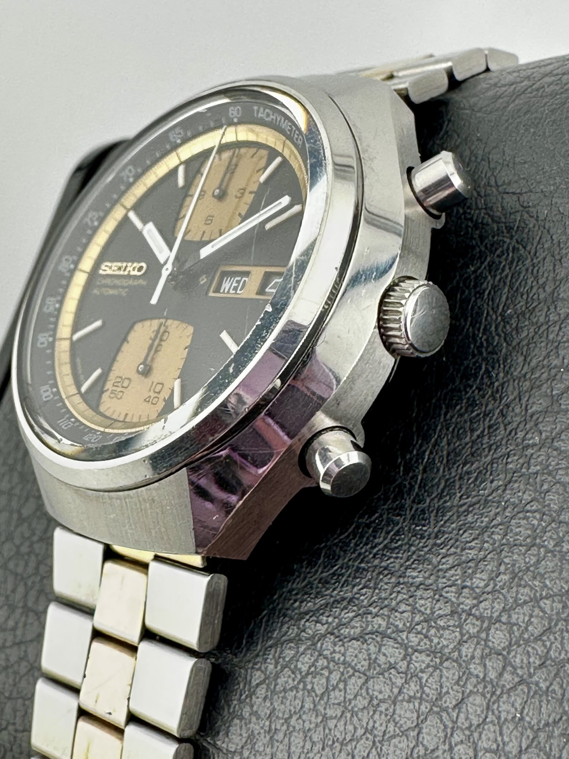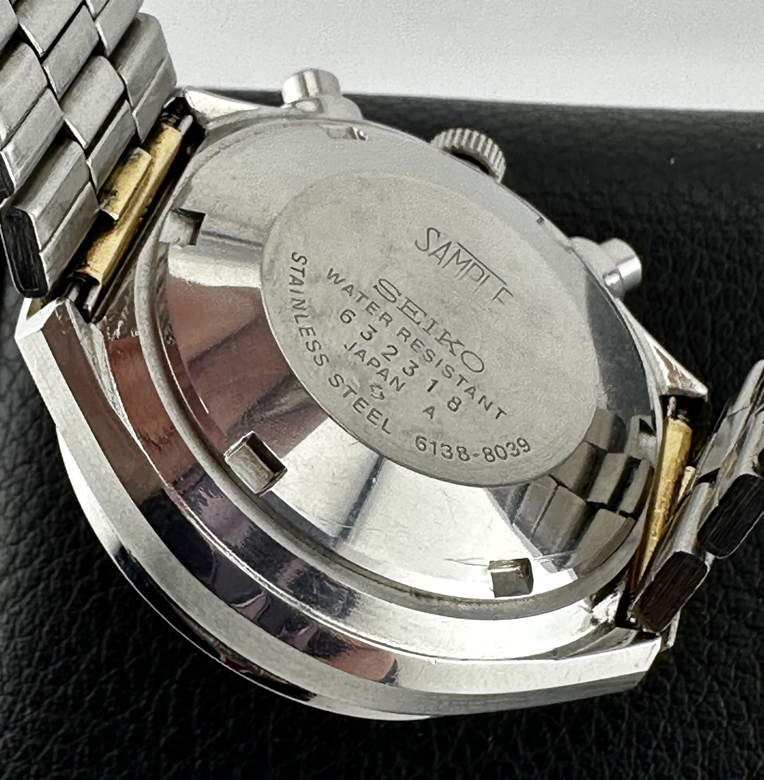 Very Rare “Sample” of the Seiko John Player Special Ref 6138-8039!! This watch dates to March 1976 – From March of ‘76, this is an incredible example, and for good reason. In the 1970’s and 80’s, Seiko sales representatives were given non-working samples to present to retailers as a preview of new and upcoming product. They were built with genuine original material including cases, dials, hands, crystals, crowns, pushers, and in some cases, partial bracelets. They only lacked a movement and rings. The cases were serialized in regular production, but when pulled for sampling, they were stamped as such. After serving that purpose, many were stored away as near perfect shells of the watches they could be. The dial is absolutely perfect. The hour and minute hands are flawless in black and white with no chipping or missing paint. The chronograph sweep is bright white and easy to spot against the dial. I’ve chosen to not have the case refinished or the acrylic crystal replaced to keep it as original as possible. These are certainly options for the next owner if preferred!!