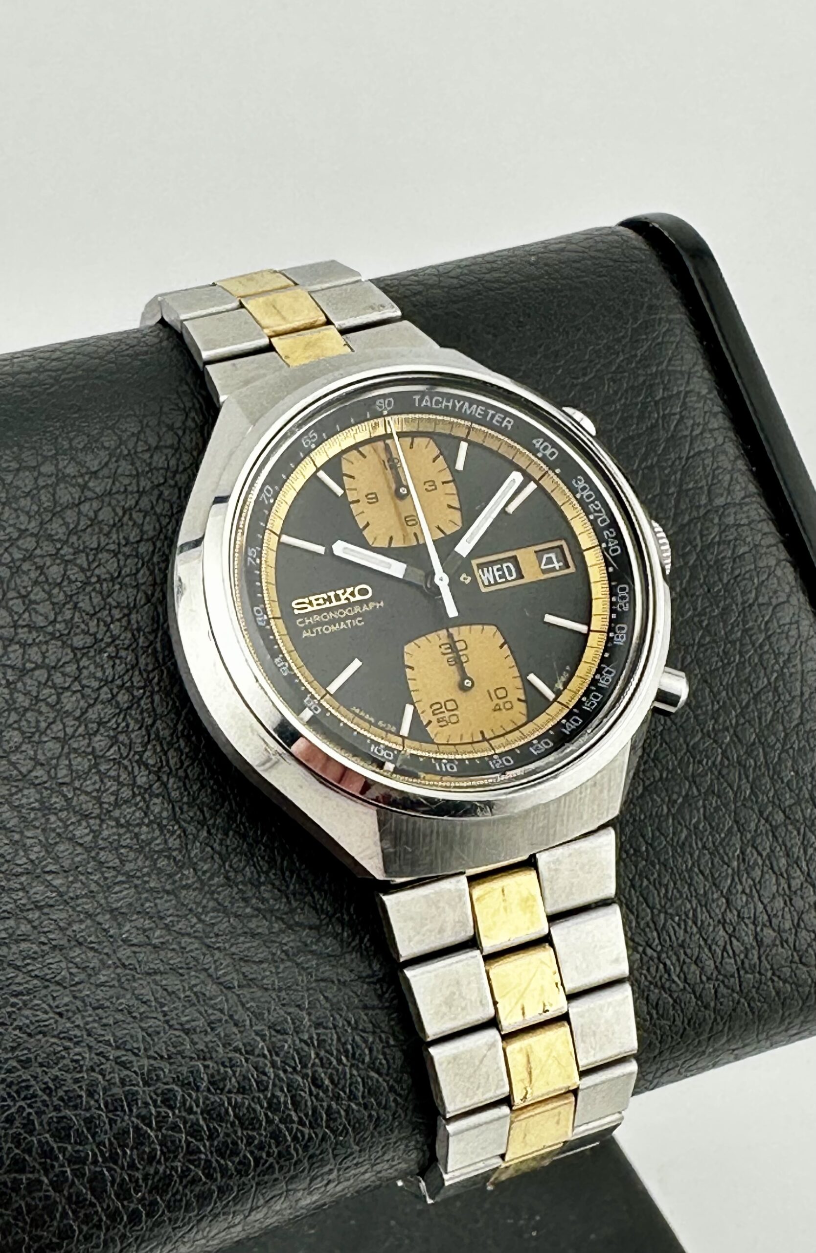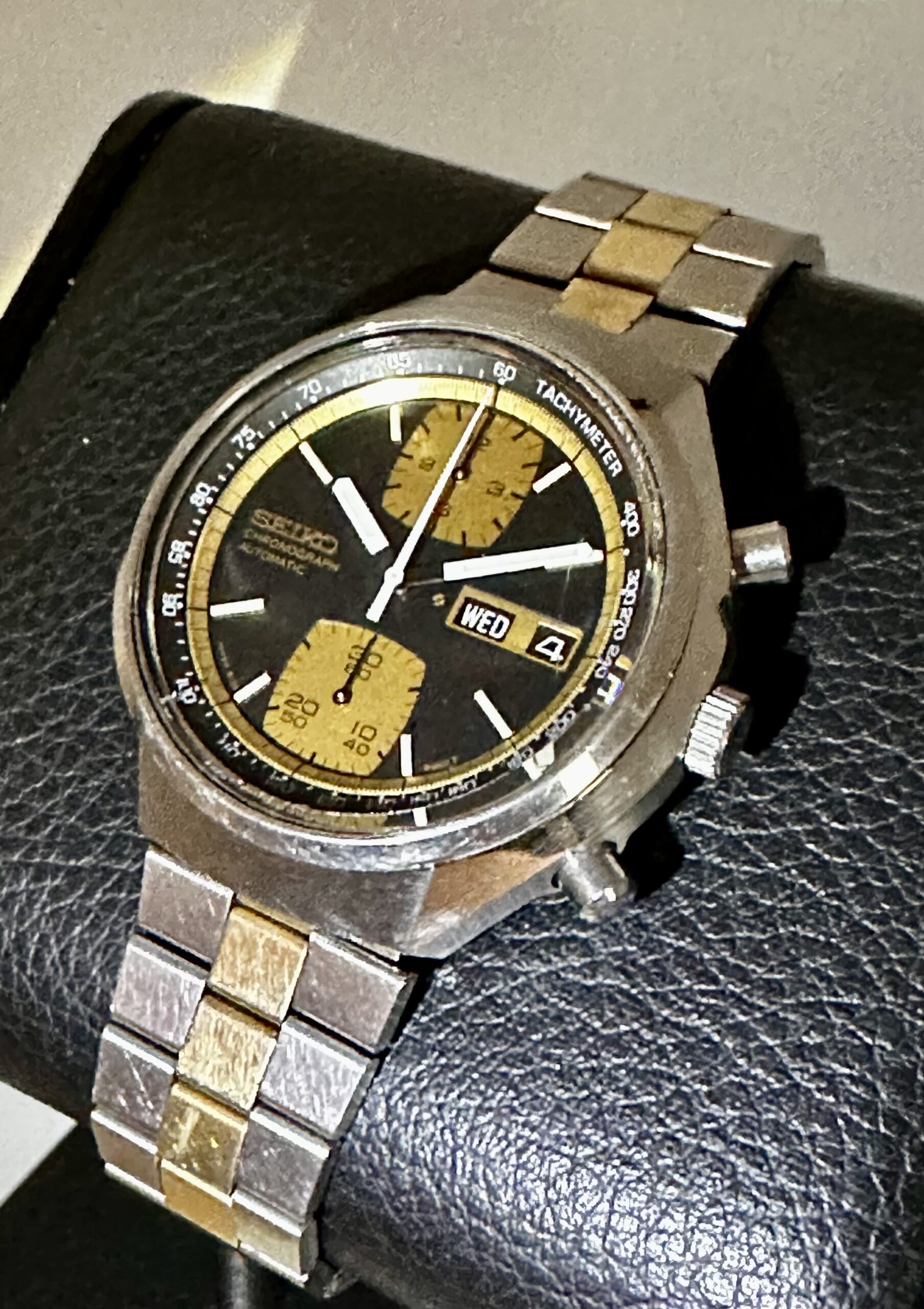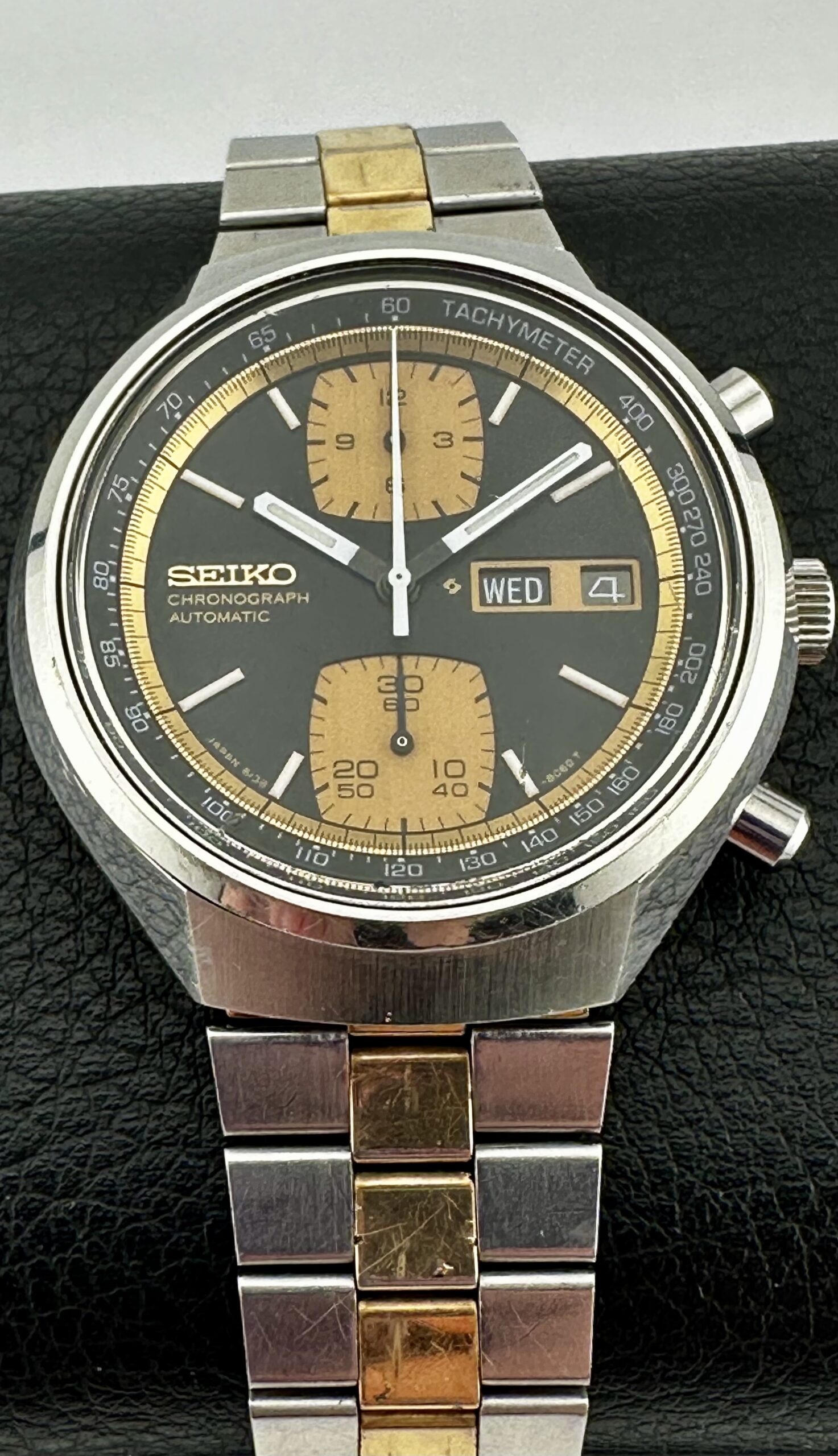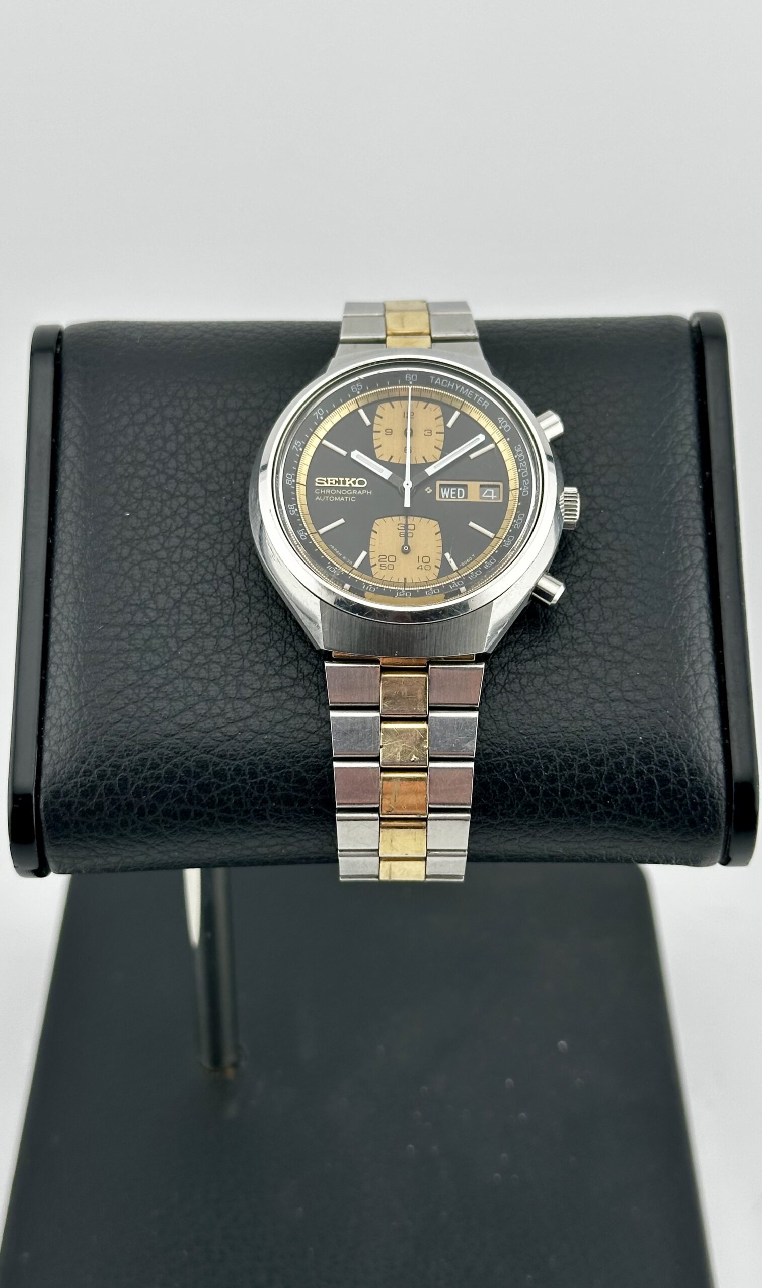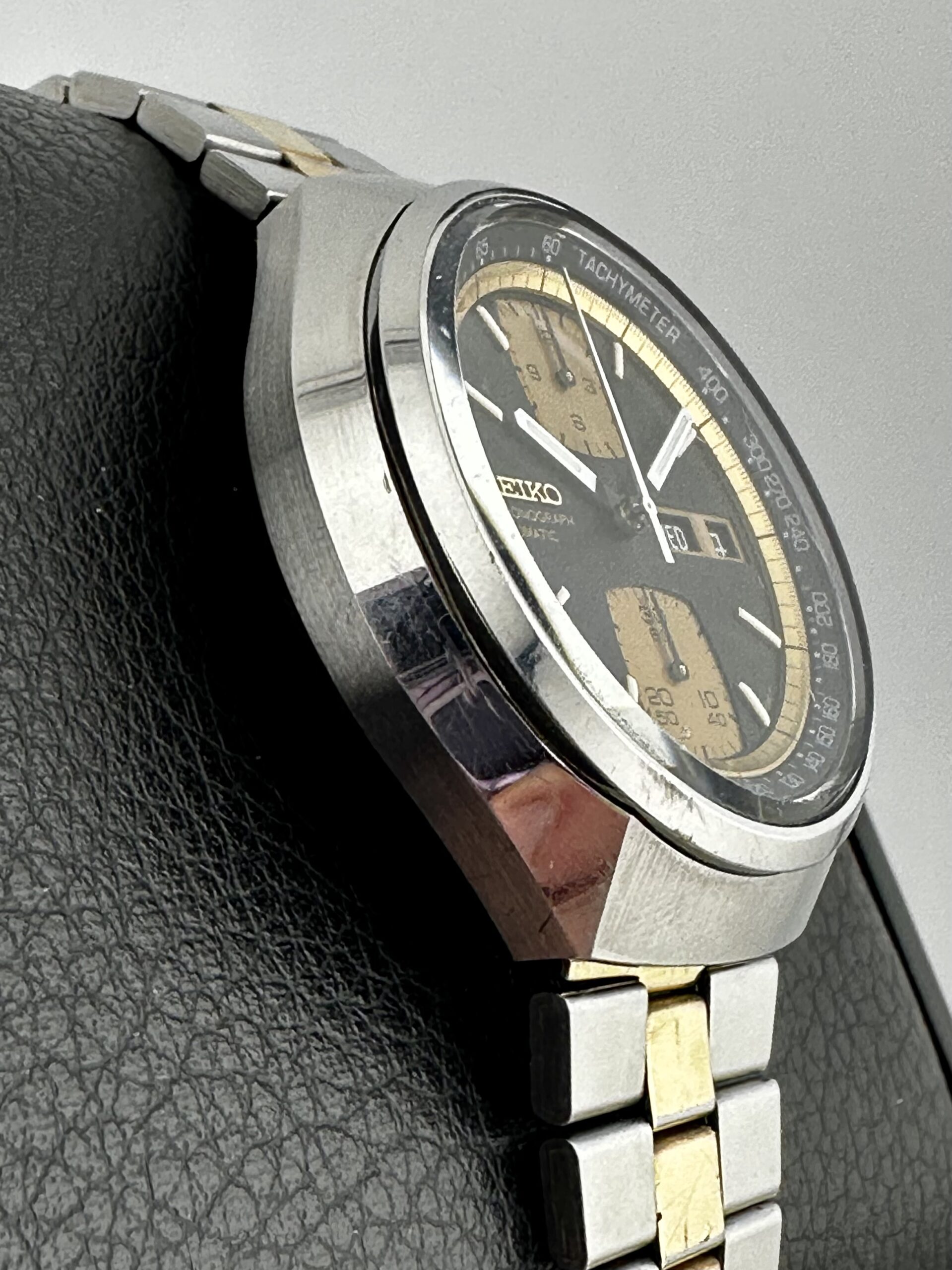 While the Seiko 6138-8039’s case might split opinions, its dial is balanced, striking, and arguably one of the most underappreciated examples of ‘70s racing chronograph dial design. The simple, punchy black and gold color palette instantly grabs attention on the wrist, with large rounded-square chronograph subdials at 12 o’clock and 6 o’clock that give this gold accent hue ample room to shine. As a side note, some examples of this model have subdials with a pronounced vertically brushed finish, but this particular piece has the more subdued matte gold subdials. By contrast, the inner chapter ring uses a brighter, more pronounced radially brushed gold, adding visual depth and variety to an already impressively layered design. Although the day/date window at 3 o’clock has the potential to markedly disrupt the overall layout, the applied gold Seiko emblem at 9 o’clock forms a deft and effective visual counterweight. Overall, it’s a sharp, balanced dial design, with a pleasingly busy feel that avoids coming off as overwrought or overcrowded.