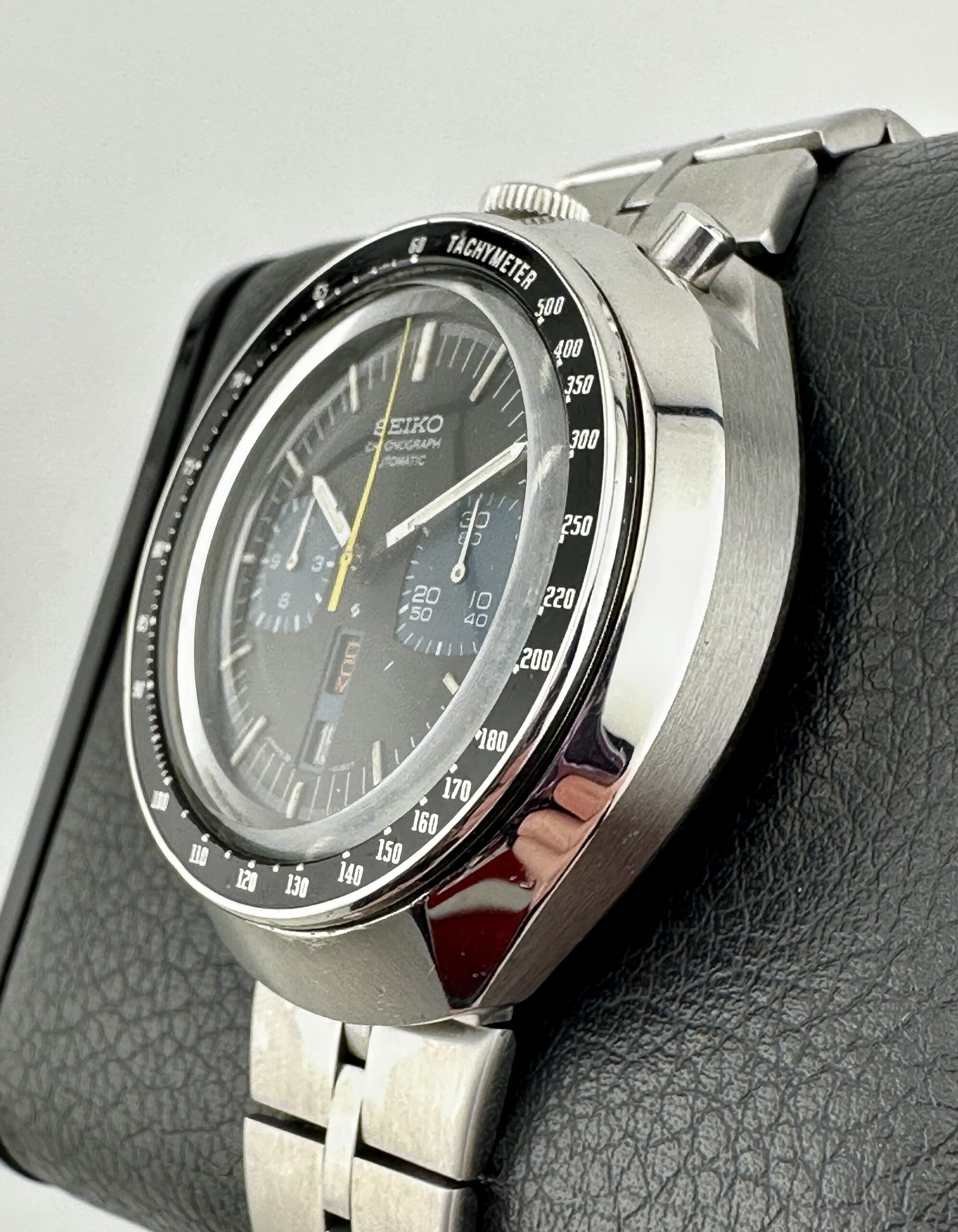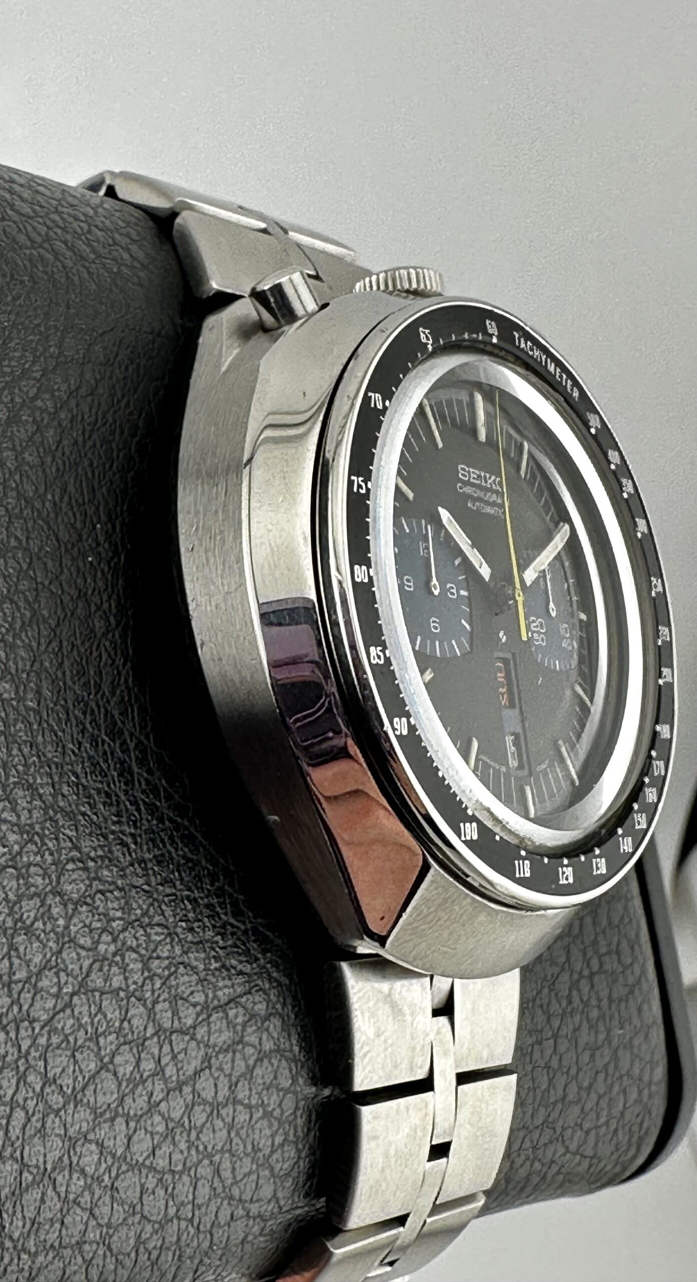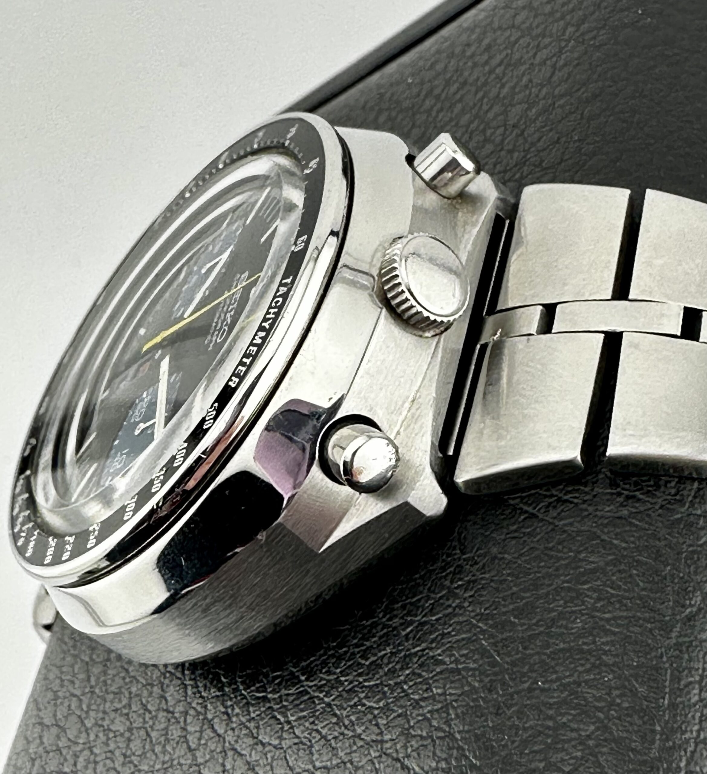 The tachymeter bezels are normally dented and the cases typically exhibit serious scratches. The cases, at least, can be refinished and brought back to showing their lovely alternating brushed and polished surfaces. Crystals are made of Seiko’s Hardlex mineral glass.