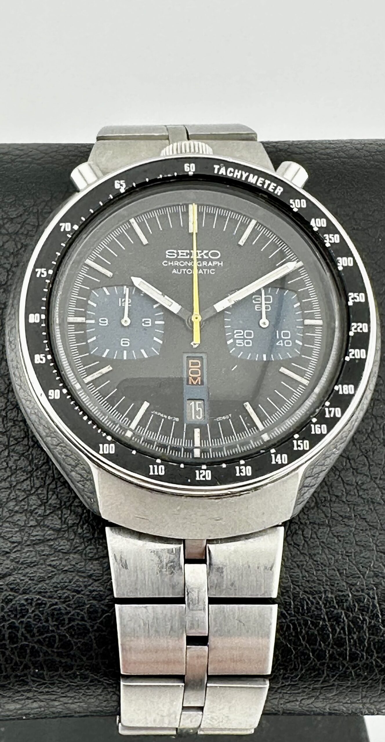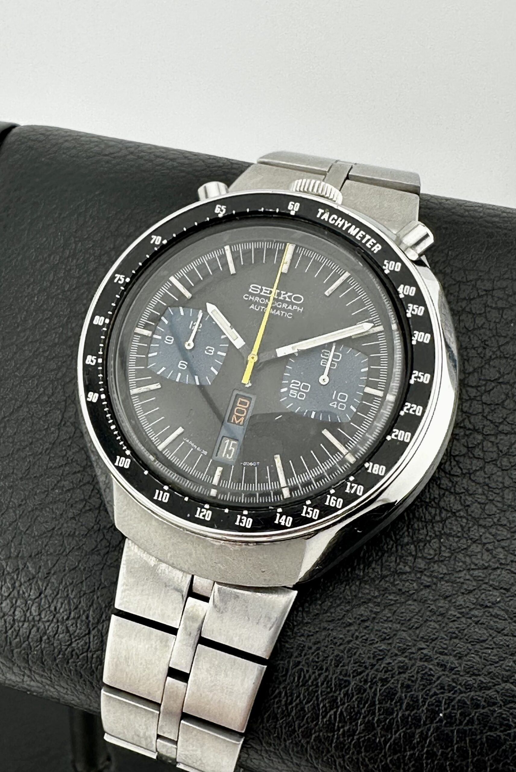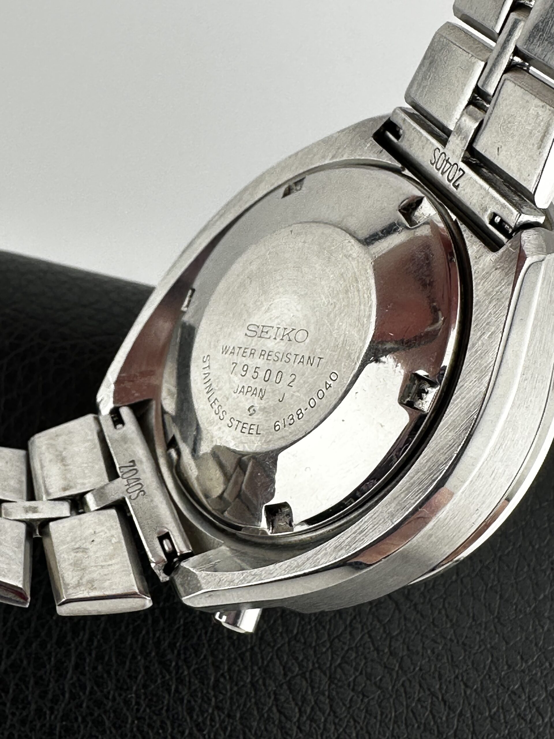 The tachymeter bezels are normally dented and the cases typically exhibit serious scratches. The cases, at least, can be refinished and brought back to showing their lovely alternating brushed and polished surfaces. Crystals are made of Seiko’s Hardlex mineral glass.
