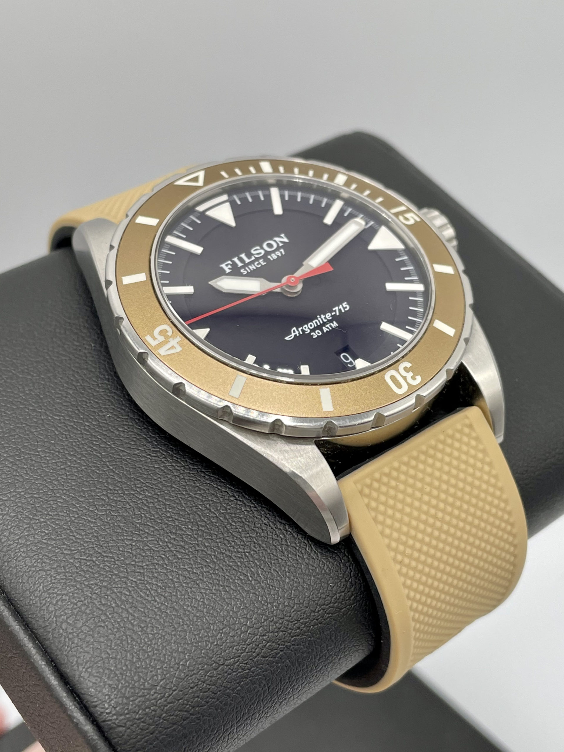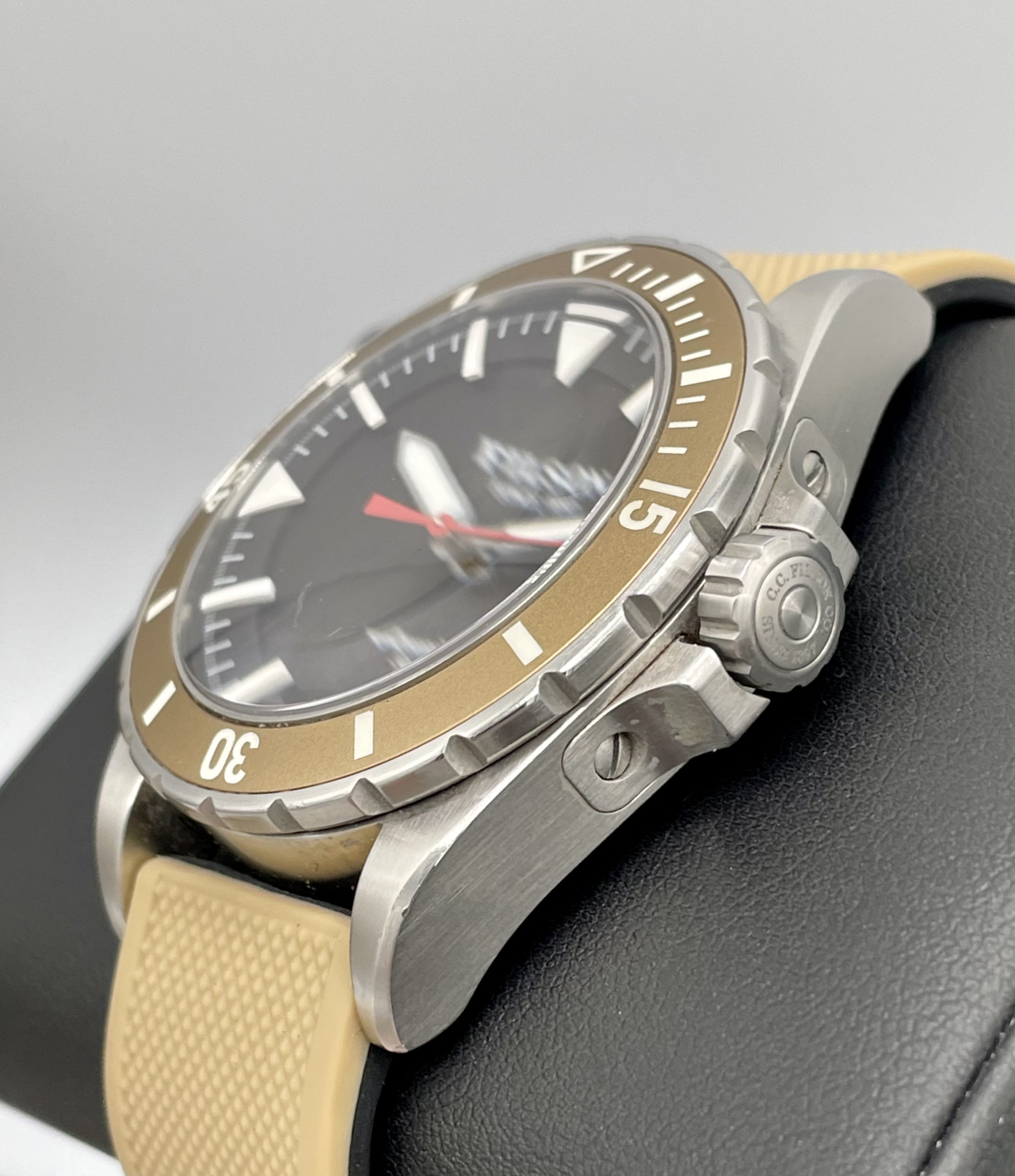STRAP/BRACELET: – Brown/Tan Rubber strap with diver extension and Steel Buckle & additional NATO style nylon strap/buckle.