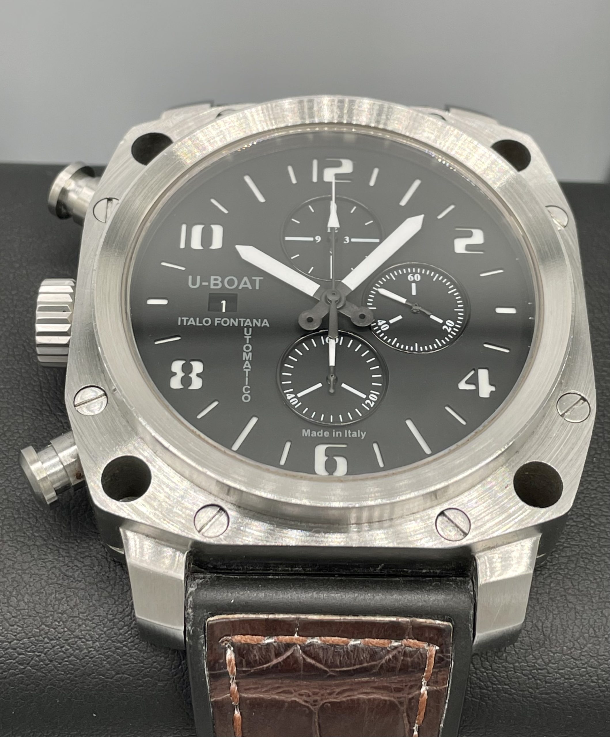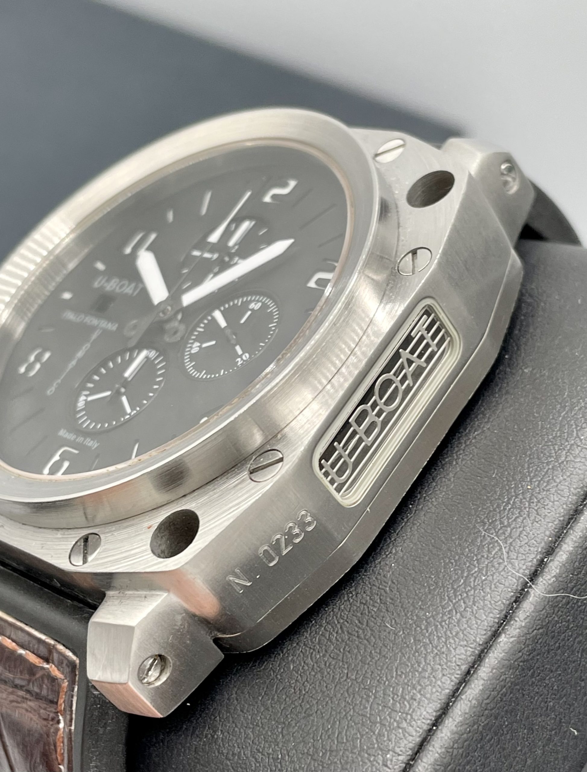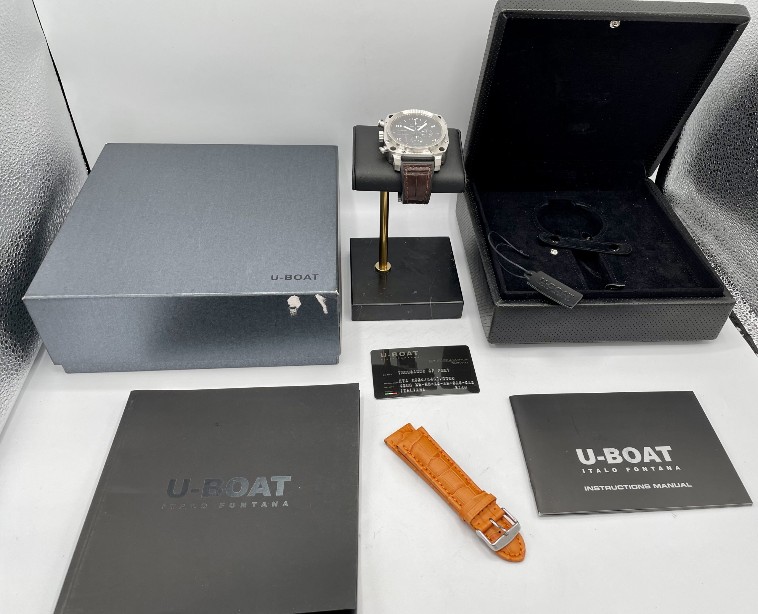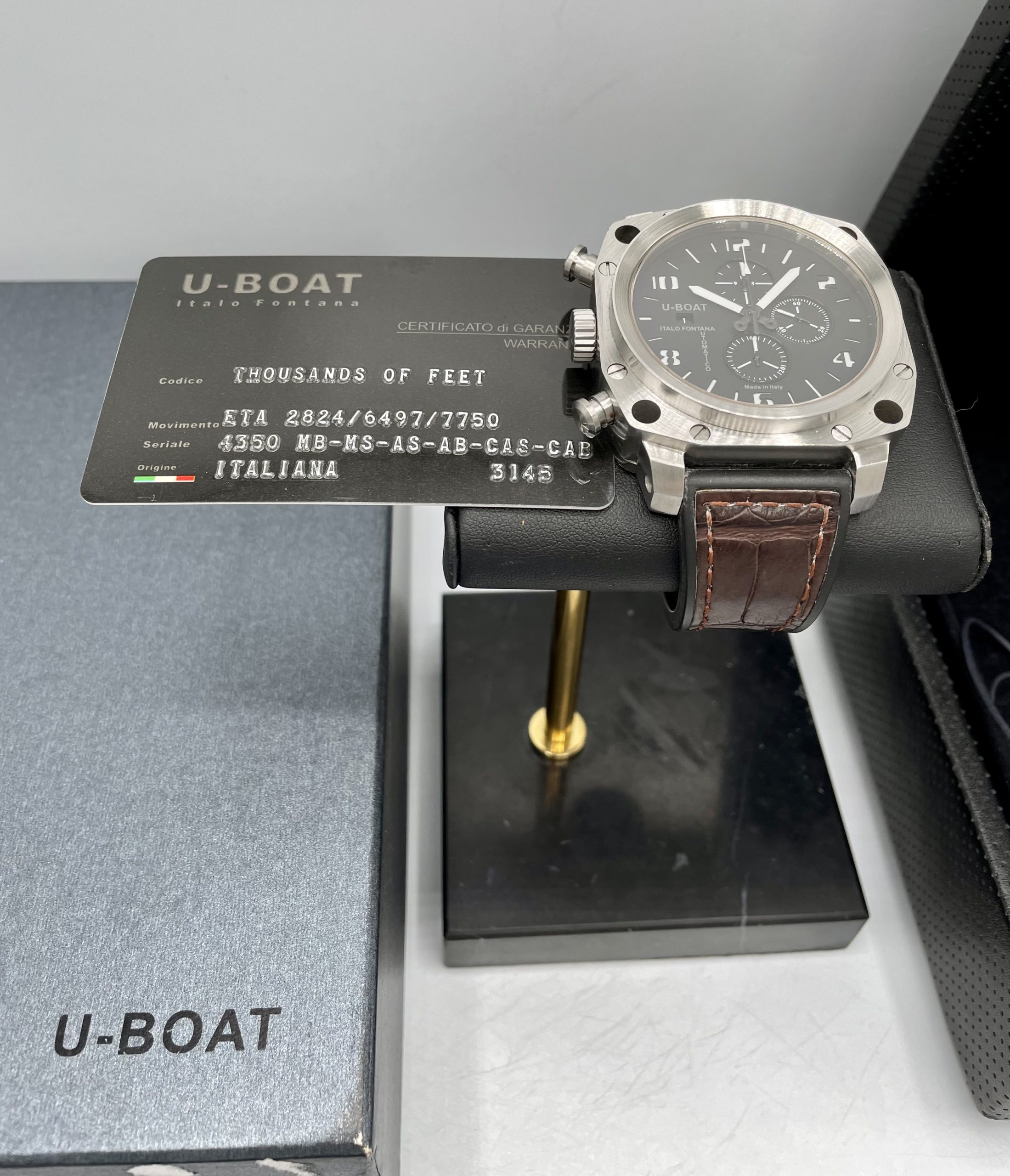 Awesome U-boat Thousands of Feet Chronograph 50mm Swiss Automatic! Exceptional condition with Swiss Valjoux 7750 Automatic Movement! Check out the absolutely awesome brown leather strap and steel buckle! Complete set with additional Brand New Custom Orange Alligator leather strap!
