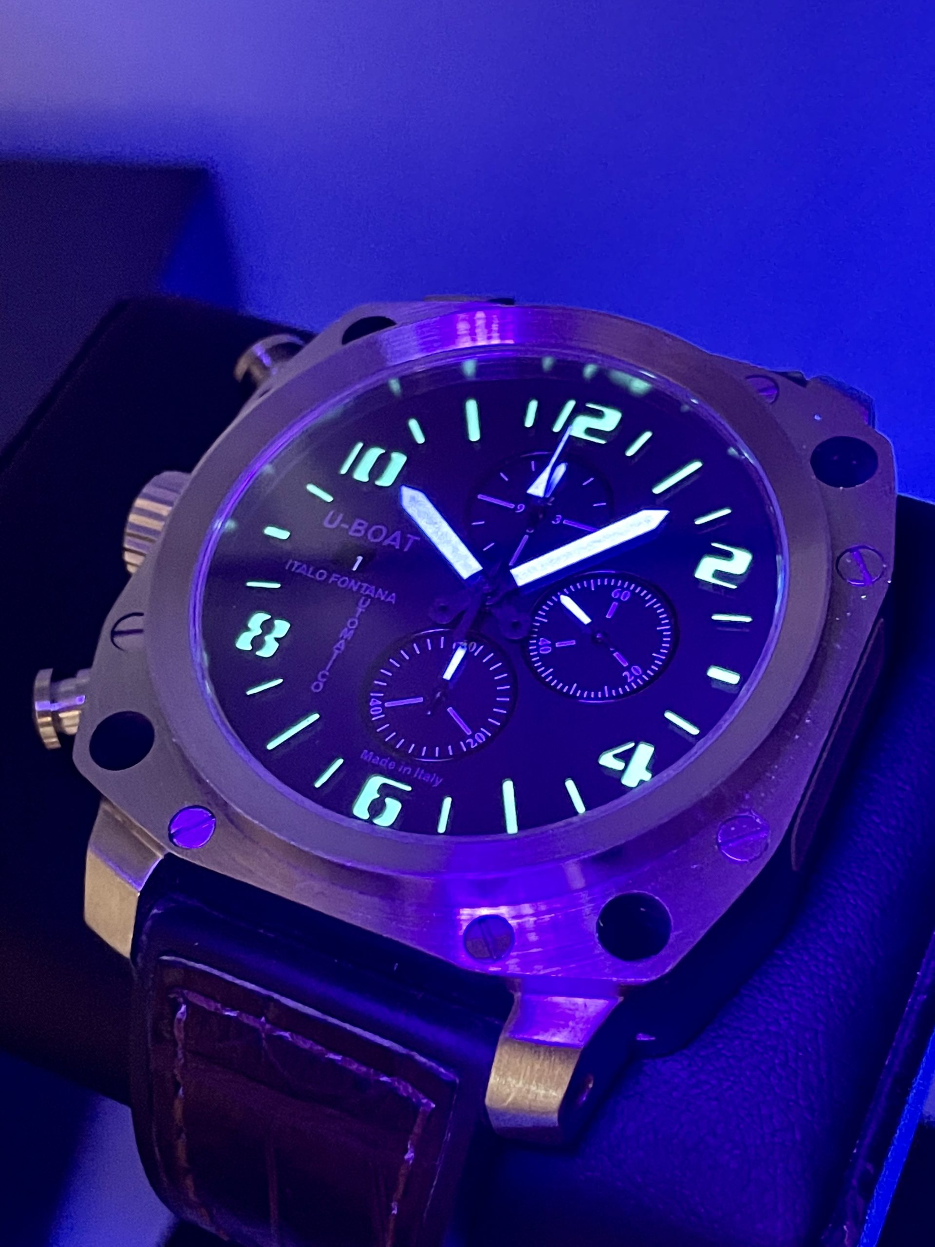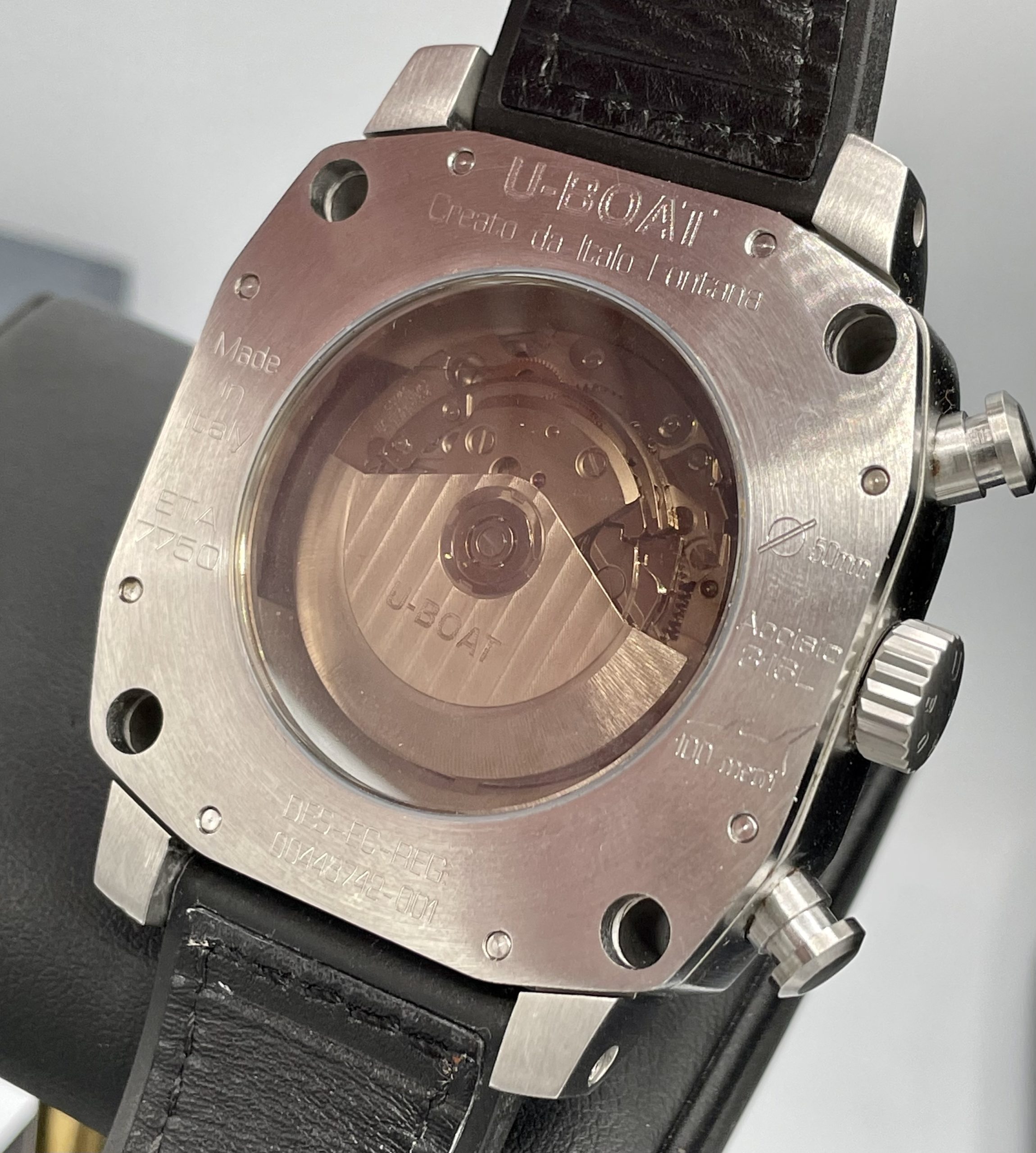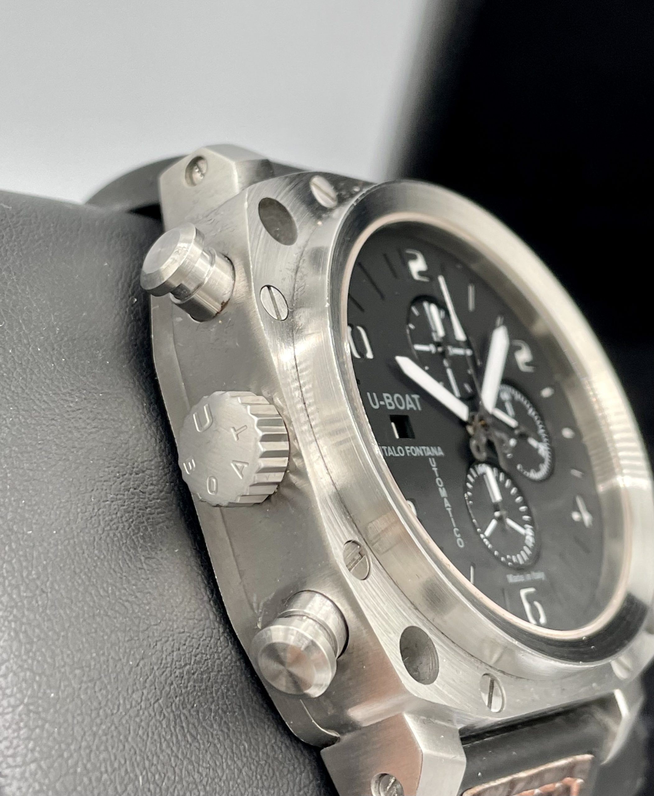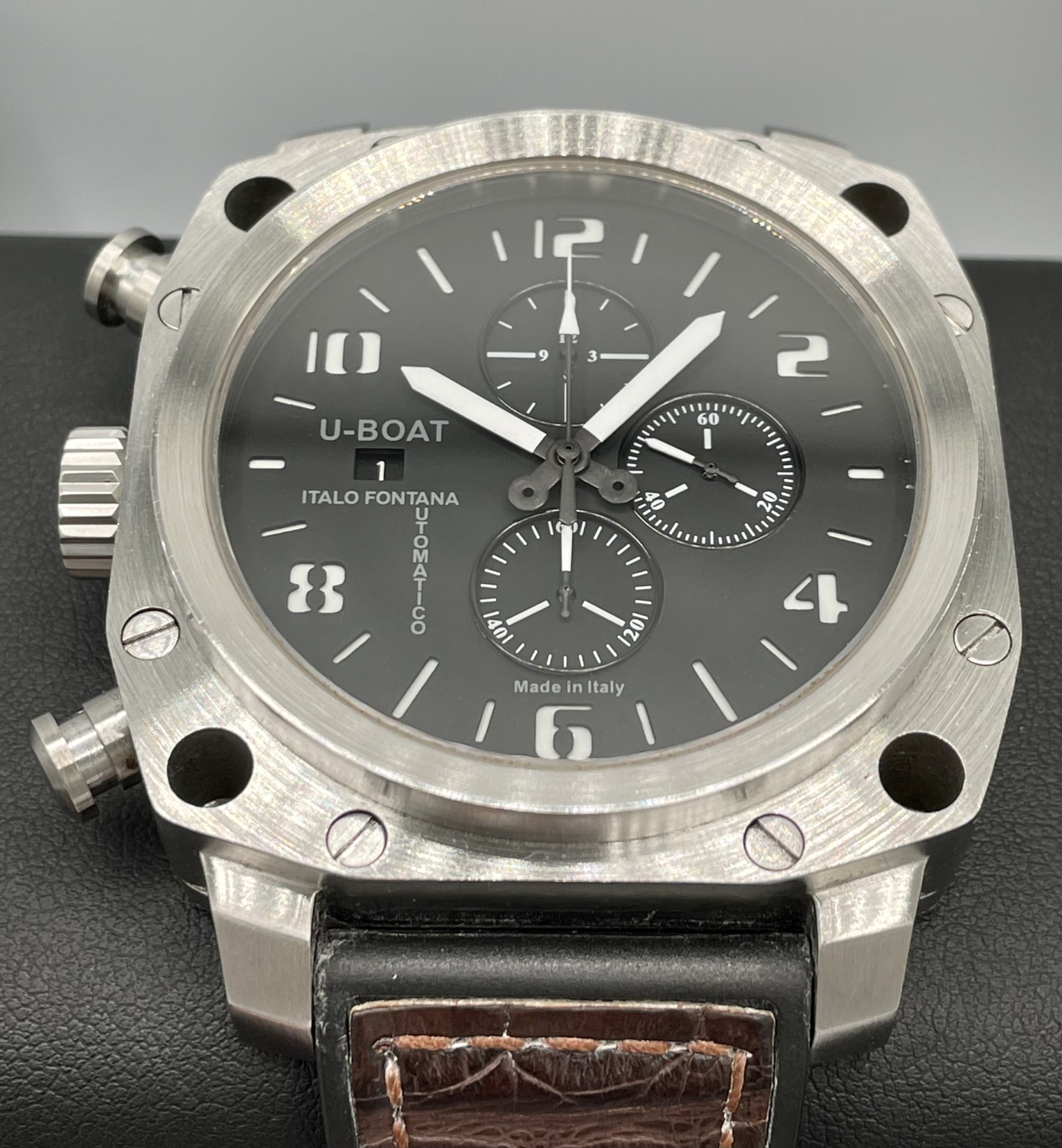 Awesome U-boat Thousands of Feet Chronograph 50mm Swiss Automatic! Exceptional condition with Swiss Valjoux 7750 Automatic Movement! Check out the absolutely awesome brown leather strap and steel buckle! Complete set with additional Brand New Custom Orange Alligator leather strap!