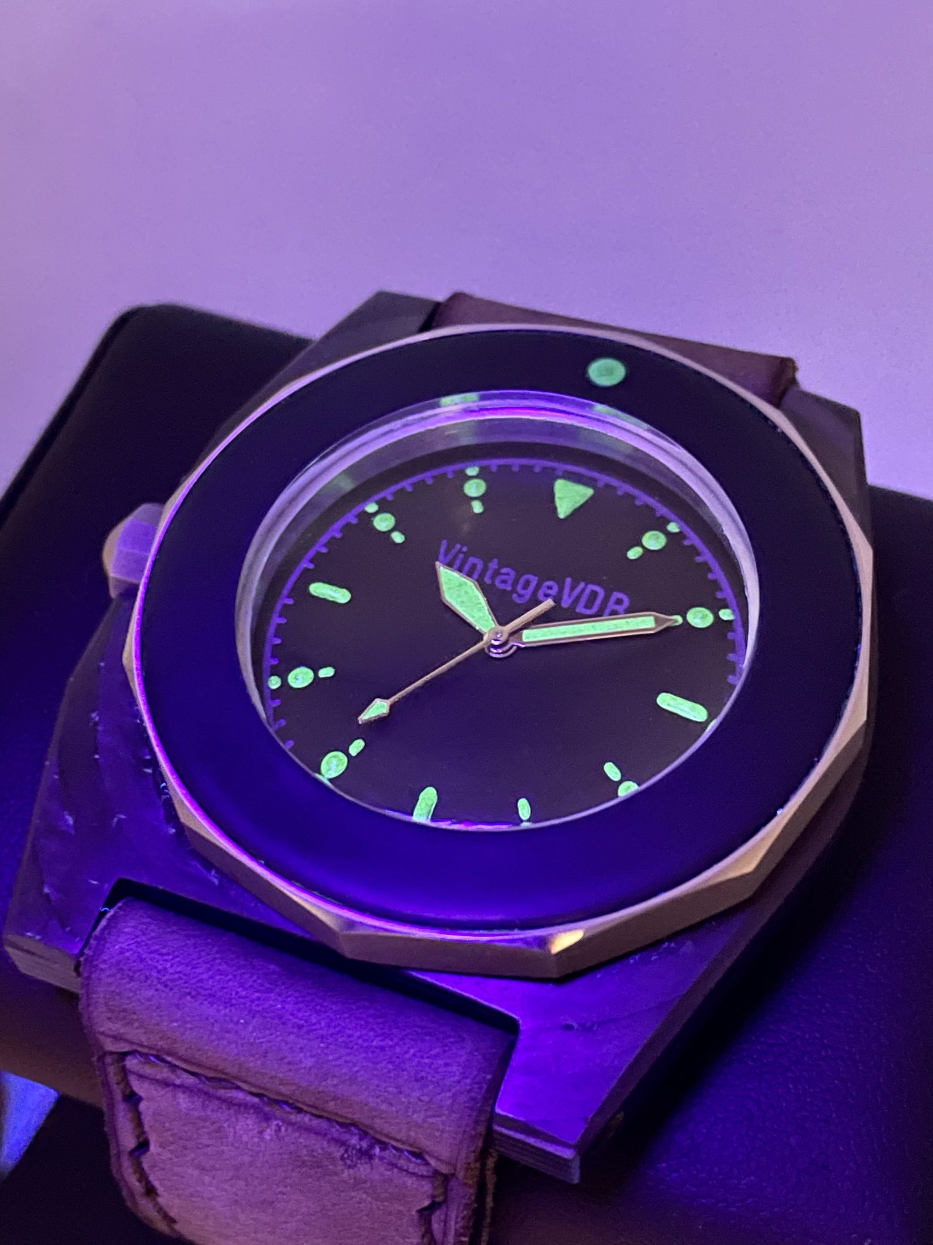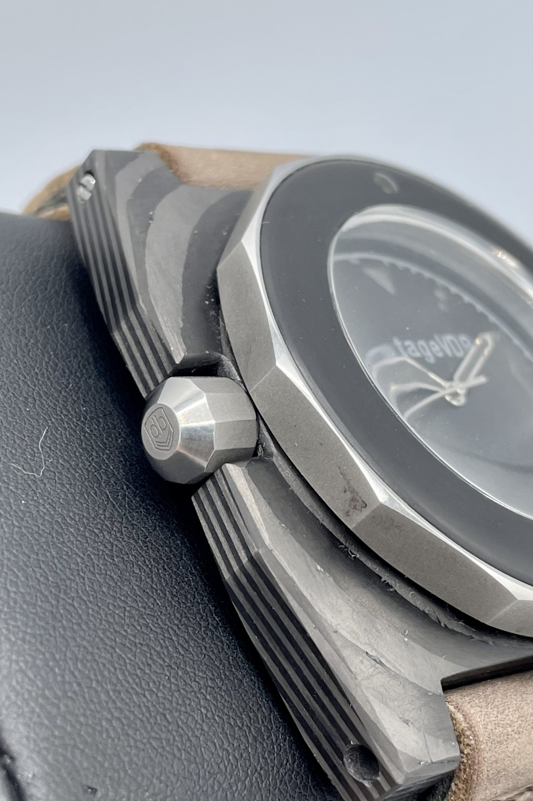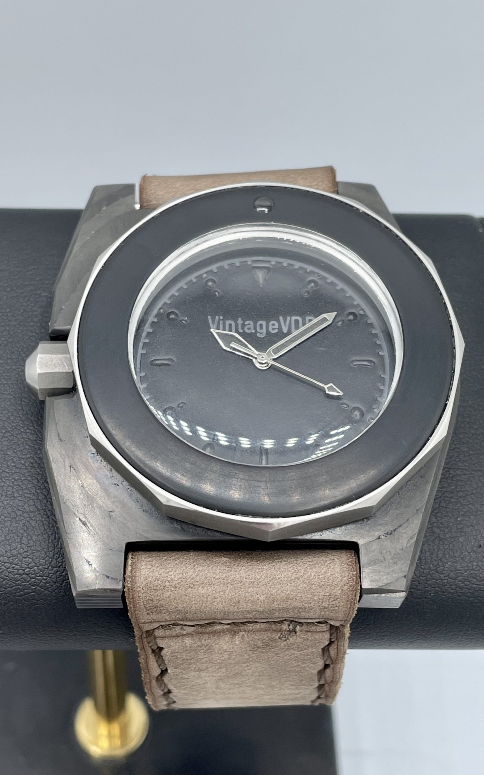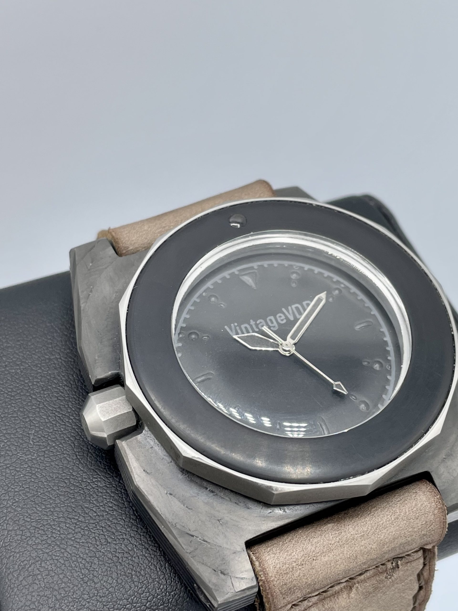 Vintage VDB One of a Kind Handmade Carbon Case with Vintage 60’s Omega Seamaster Cal 571 Automatic Movement! This is a Prototype that VDB Owner Stephan Obst made for his own collection! This watch is a 1/1 and there are none others like it. Truly 1 of a Kind! Actually better in person than the pictures and comes on a Brand New Corrigia Handmade Gray Leather strap with Steel buckle. See-Through Case back to view the Awesome Omega Seamaster movement!