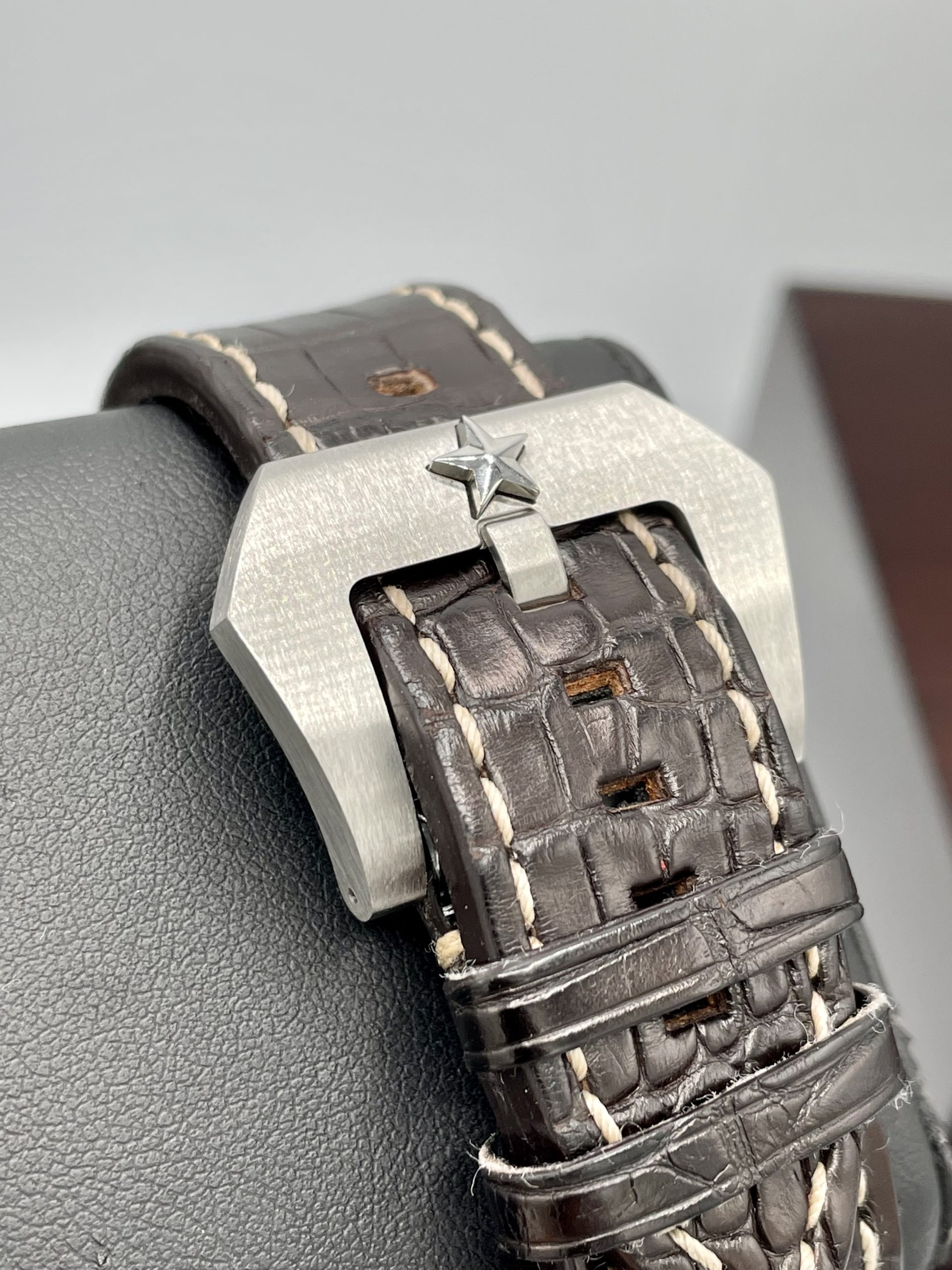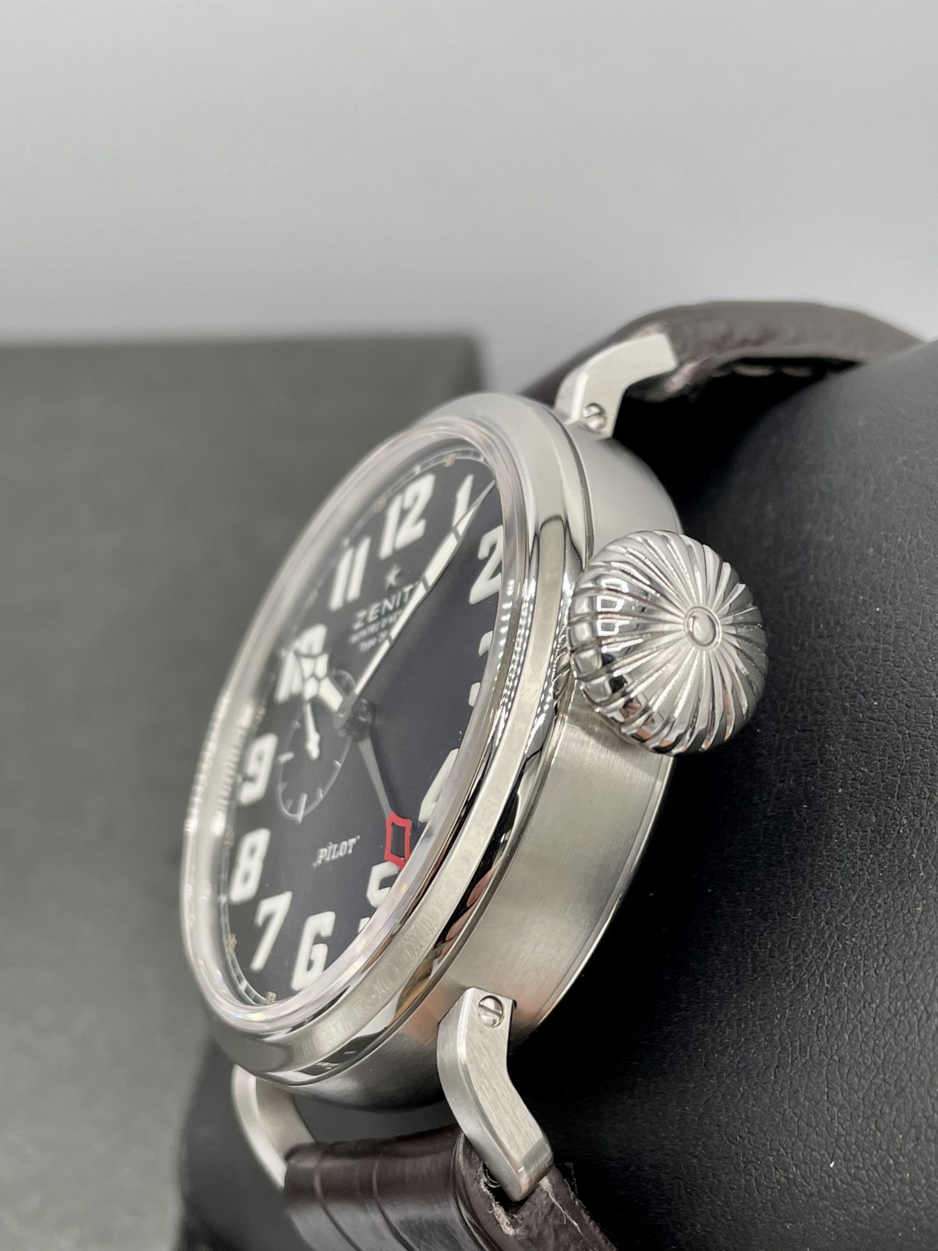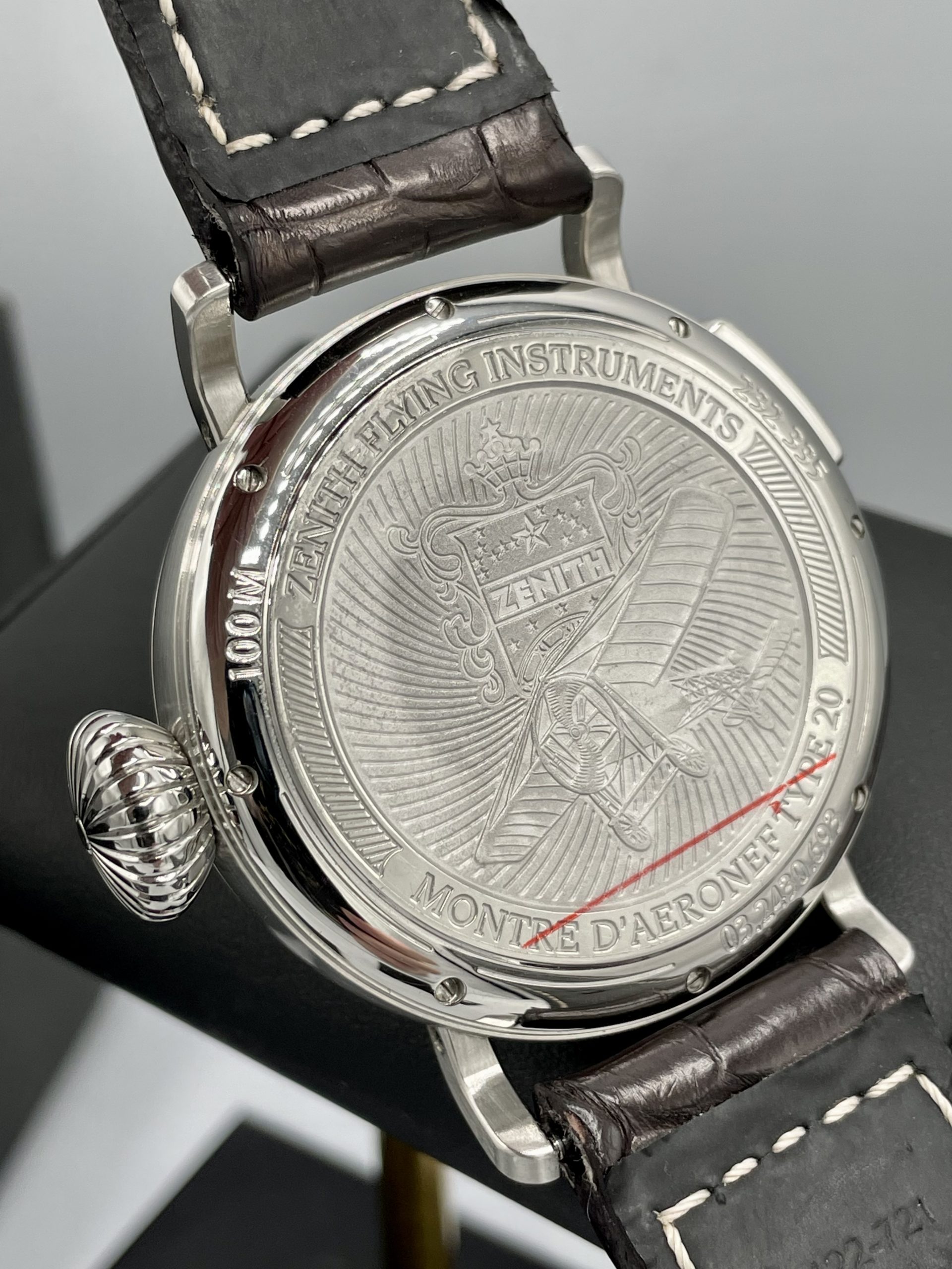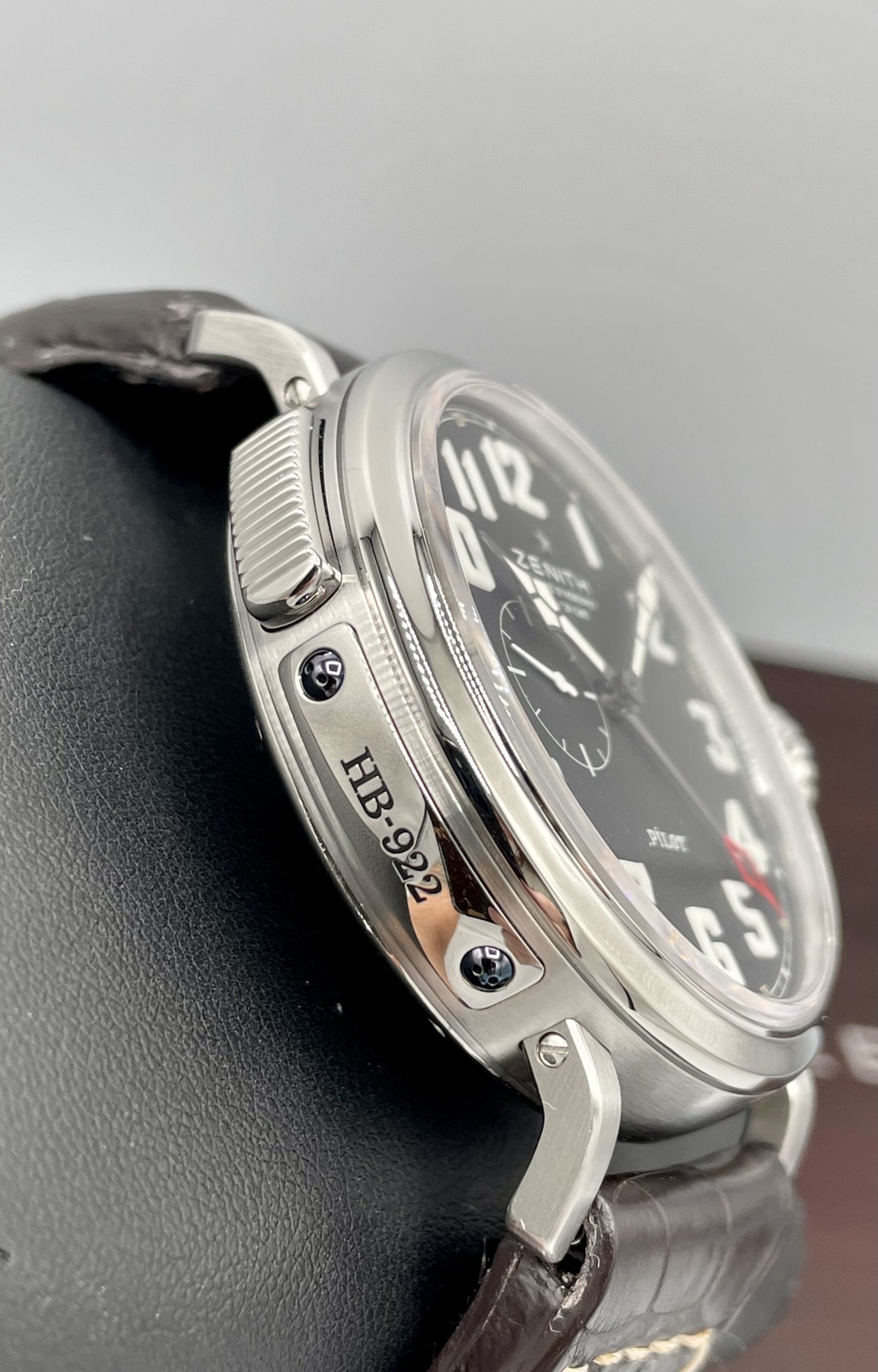 STRAP/BRACELET: – Original Zenith Black Alligator Pilot Leather strap with signed Steel buckle.